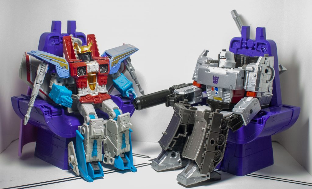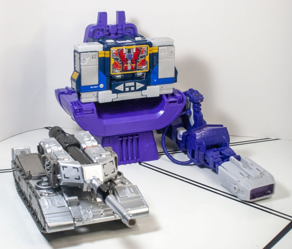 So, like I said at the top of the review, this set cost me $200 at TFCon, and after tax, three Voyagers at Canadian retail would cost me about $170. Granted, Shockwave is a bit less than a Voyager, but Soundwave’s a bit more than one (which is likely why he’s never been released in a single-packed format), plus he has a Siege Micromaster, in the form of Laserbeak, so that balances out. So, the 30 extra dollars gets you a big chair, and a bunch of extra, flashy Takara paint, most evident on Megatron, but present on both Soundwave and Shockwave.