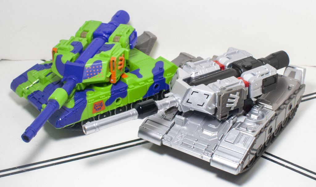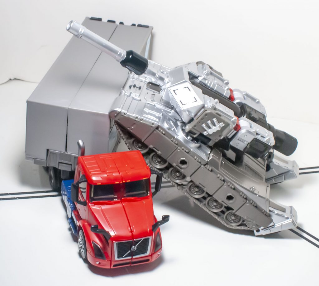 Megatron’s transformation Is still complicated enough that I had to re-check some photos from my previous reviews to understand how the legs work, and he still partsforms in a somewhat awkward way (a panel from the Tank Spear comes off, and plugs in between his rear treads), but at the end of it, you get a tank mode that’s incredibly shiny.