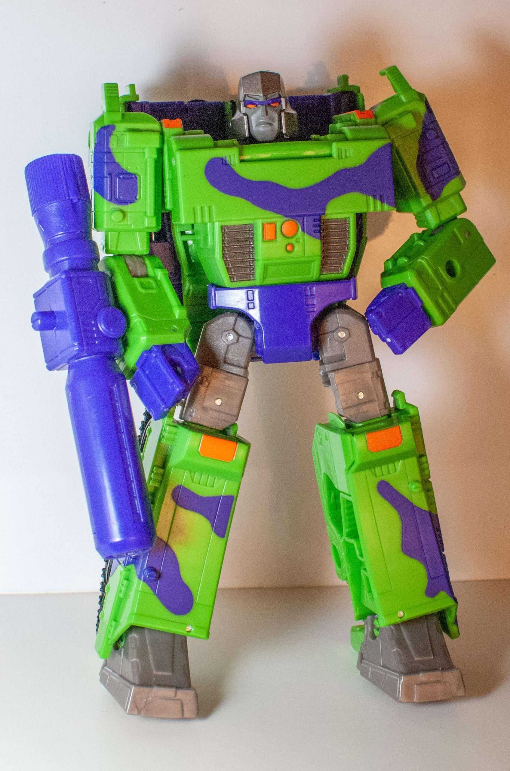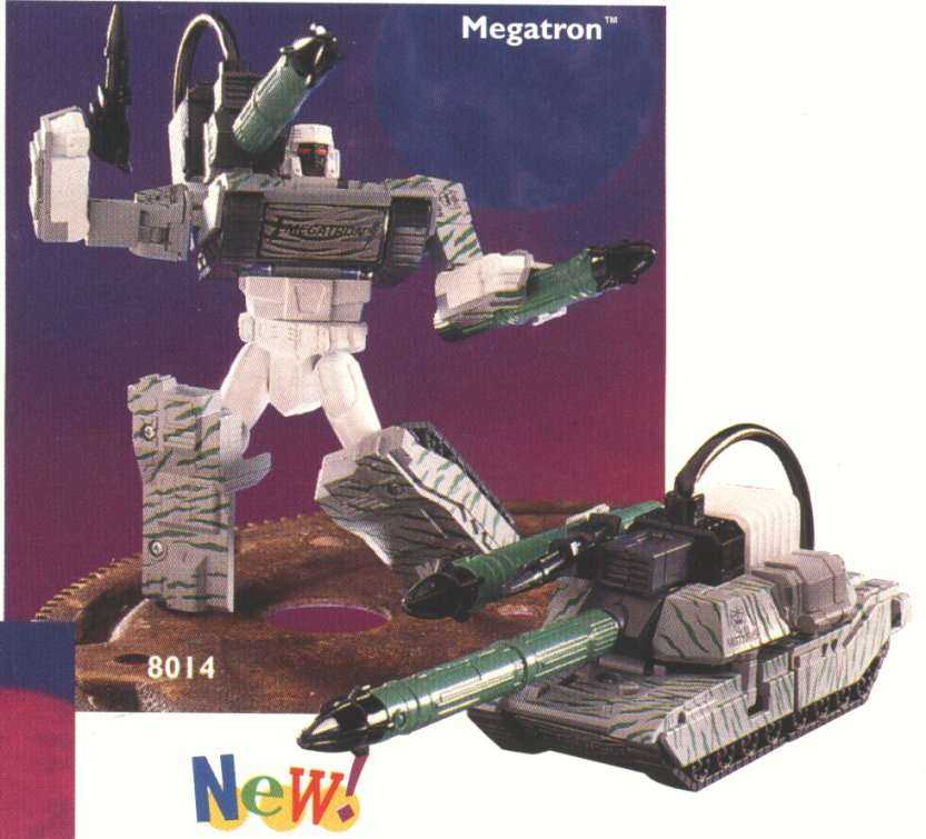 One of the first new-mold toys in Generation 2 (which, in its first year, was almost entirely made up of G1 reissues with brighter color schemes and extra missile launchers), this was a new take on Megatron, changing from a gigantic for-the-time robot into a big combat tank, and decked out in an implausible bright green and purple camouflage color scheme. A smaller Deluxe-ish take on the design, now mostly purple, would follow….