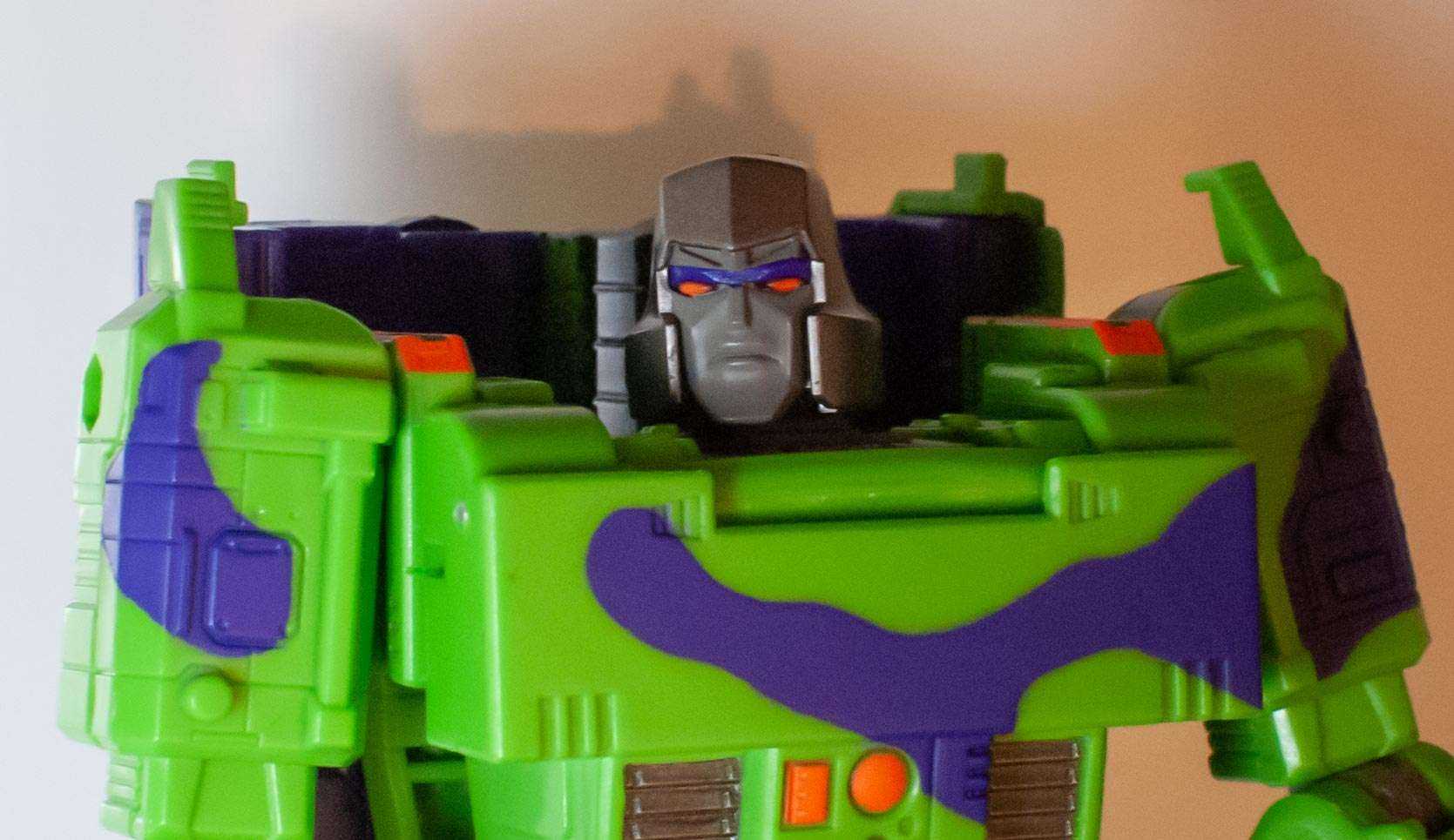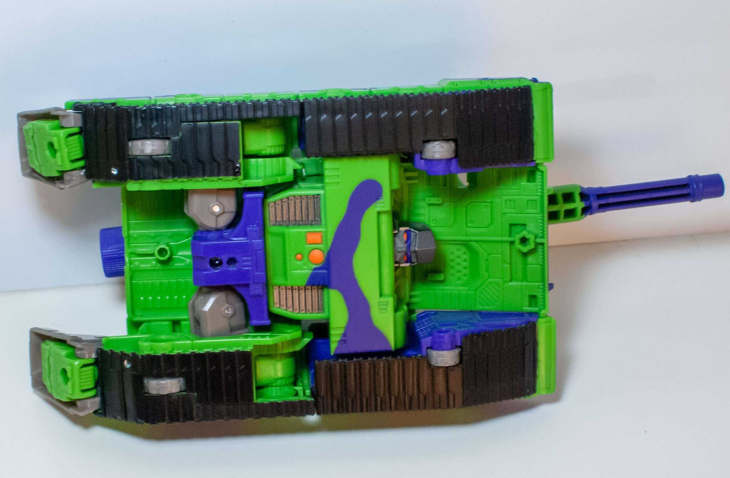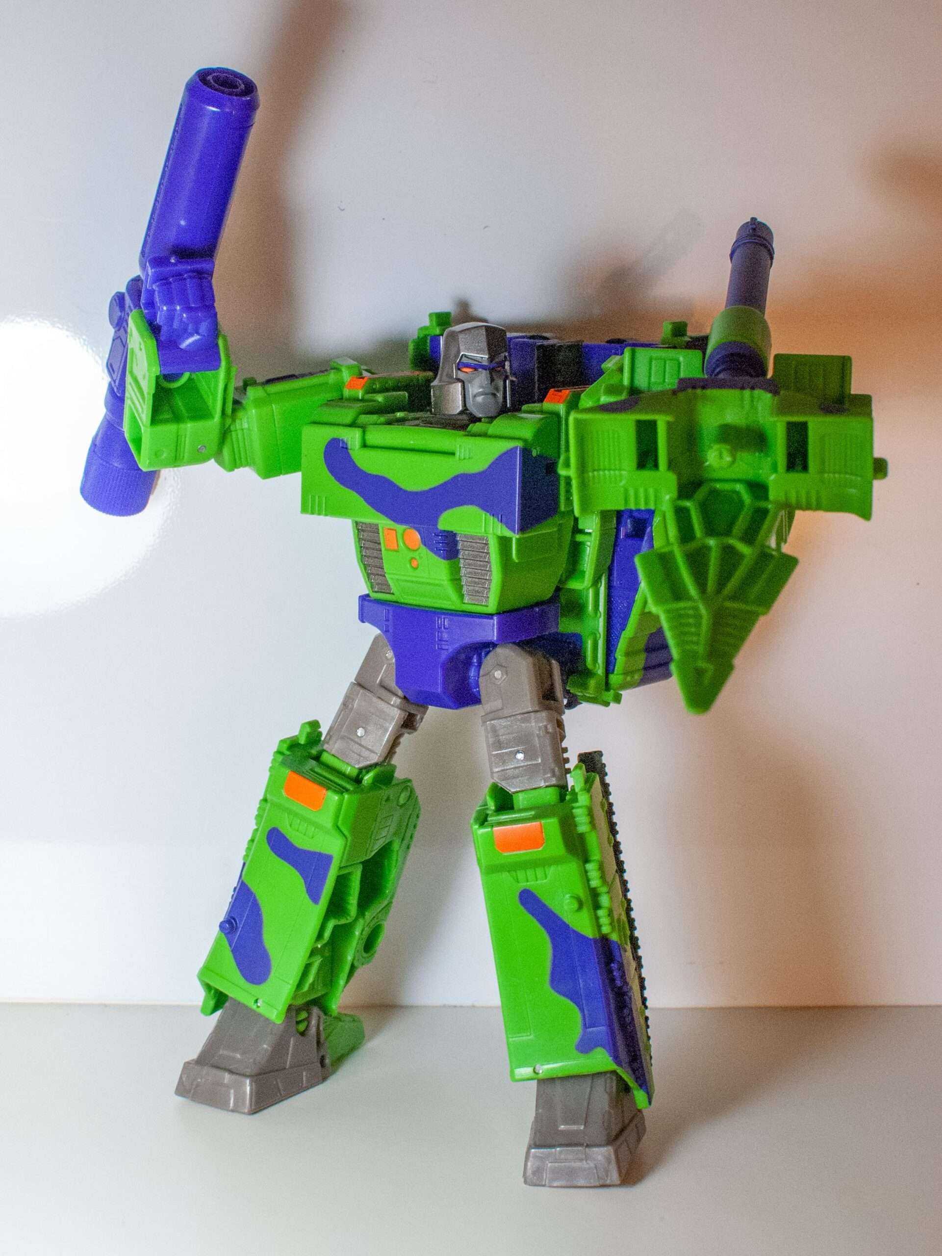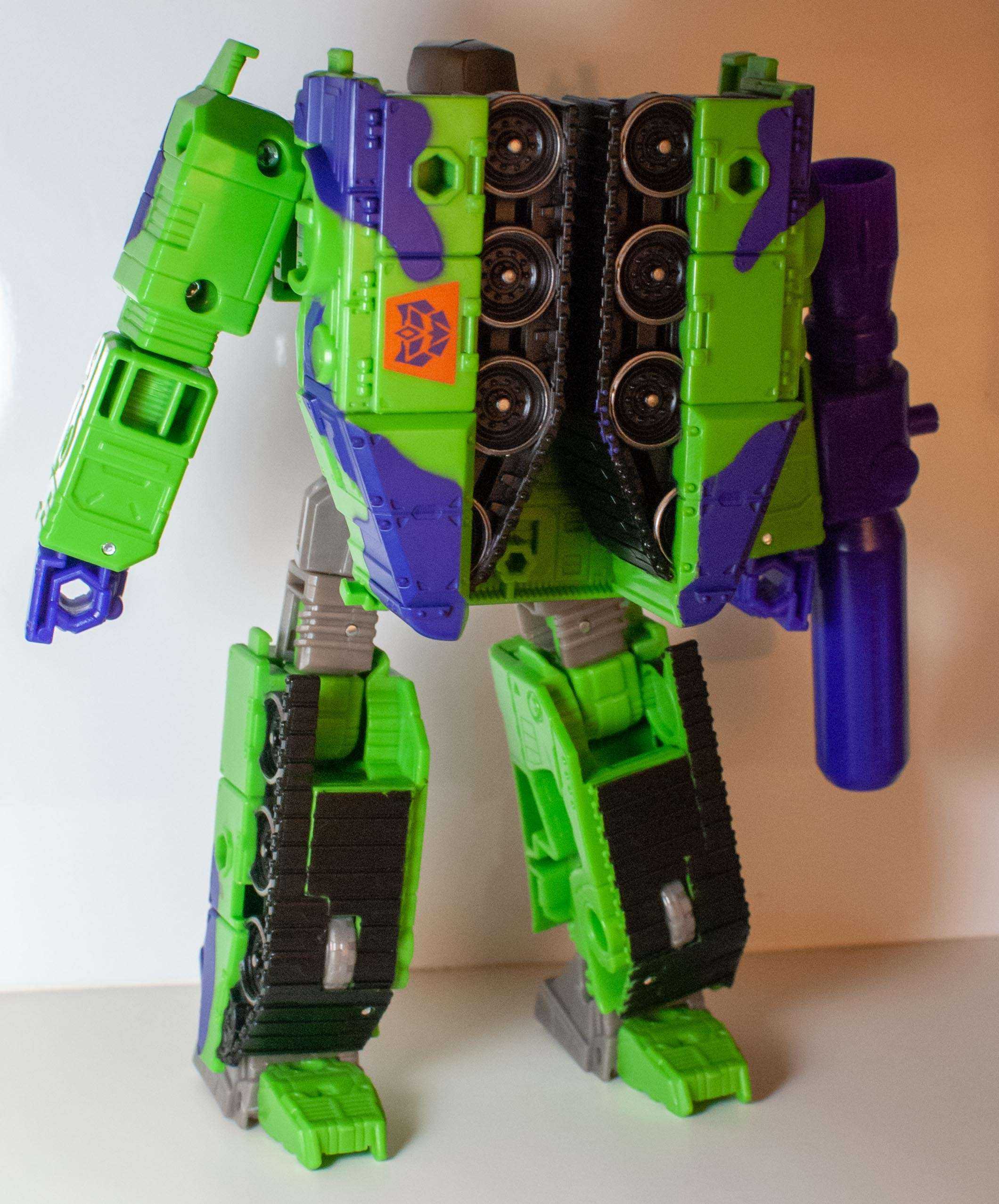 Thanks to the G2 camo pattern, if I ignore that it’s bright green and purple, with orange bits, the deco almost looks Earthly, again. But why would you want to ignore that deco? I particularly appreciate the little orange dots to the right of the turret, which resemble missile pods, and the retro Generation 2 Decepticon symbol on his side.