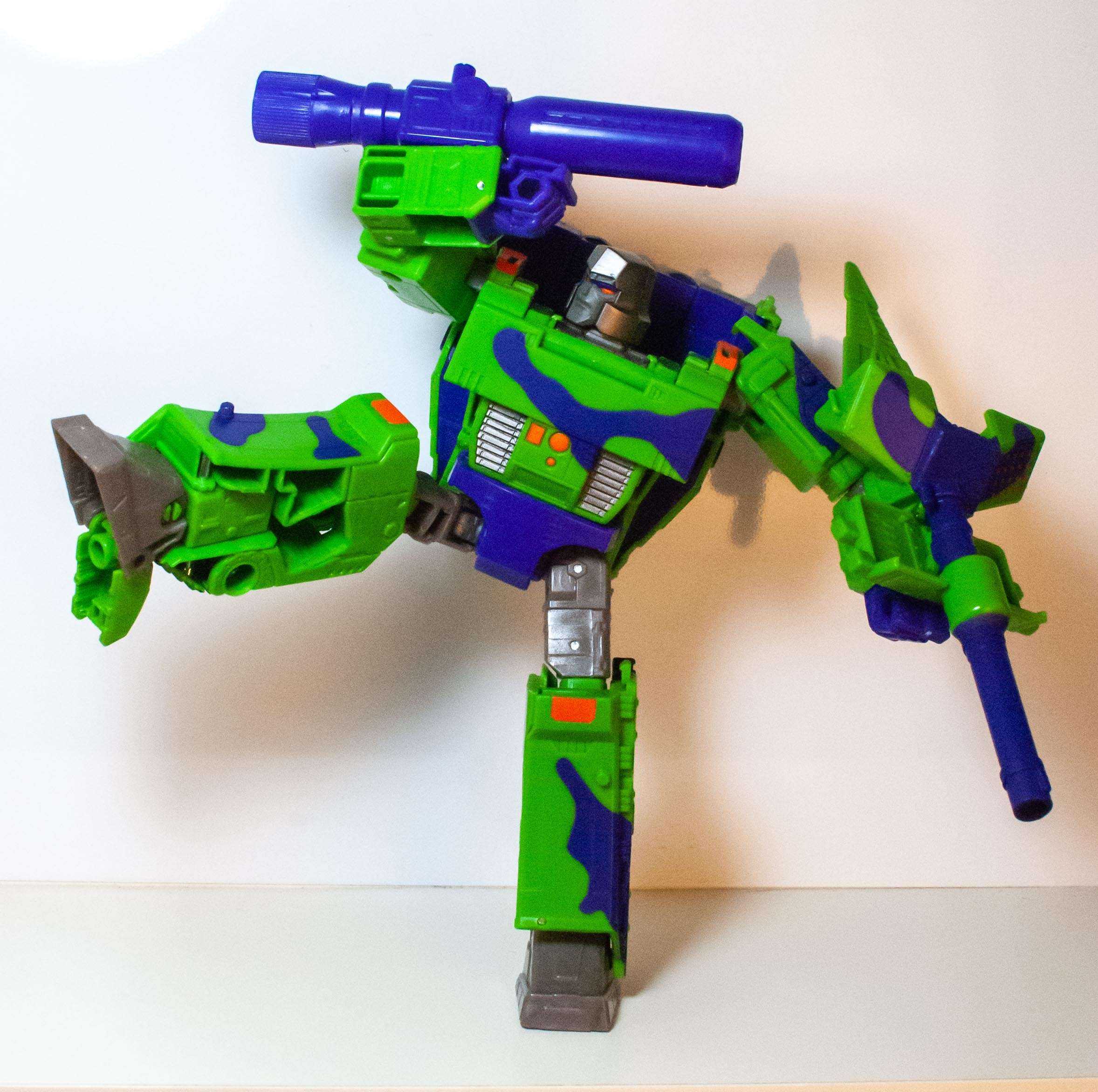 Another tiny nitpick only I care about: He can’t shoulder-mount either of his cannons, to imitate the original toy’s weapon, like the Siege and Titans Return retools can. The best you can do is point it upwards on his back, or place it sideways on his upper arm. Still, it wasn’t built with that kind of visual homage in mind, and the previous two G2 repaints felt like they could just do it out of serendipity. If you want to throw in bits of some Weaponizers, I’ve seen a few good modifications to add that shoulder-mounted feature. Still, it works just fine as a second arm cannon, and “having two big guns” is pretty 90’s on it own.