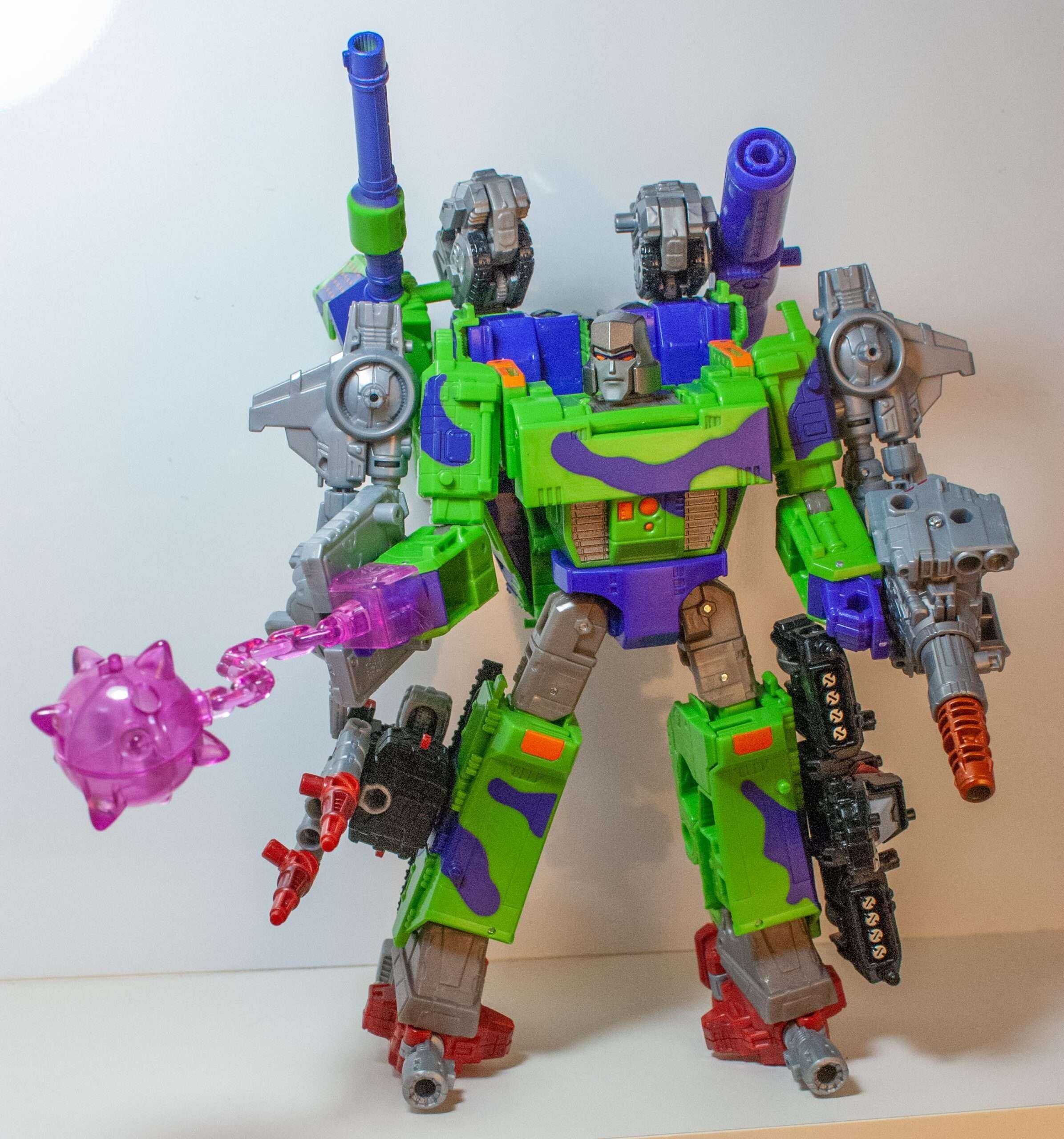 You either love or hate this colorscheme, and I absolutely love it. It’s G2 in a nutshell, straight out of the early 90s. I have a few nitpicks, though. Namely, it doesn’t slavishly replicate the layout of the original figure the way Combat Megatron did, remixing it a bit, instead of copying it closely. Also, I feel like stickers that say boastful phrases are an important part of the G2 Experience, and unlike Legends Megatron’s “MEGATRON RULES” and Combat Megatron’s “(lighting bolt) MEGATRON (lightning bolt),” I’m missing the fact that they didn’t try to replicate the original’s “BIG STICK” and “EAT THIS, AUTOBOTS” details. Still, these are nothing more than nitpicks, and nothing about them changes how absolutely lush he looks in-person.