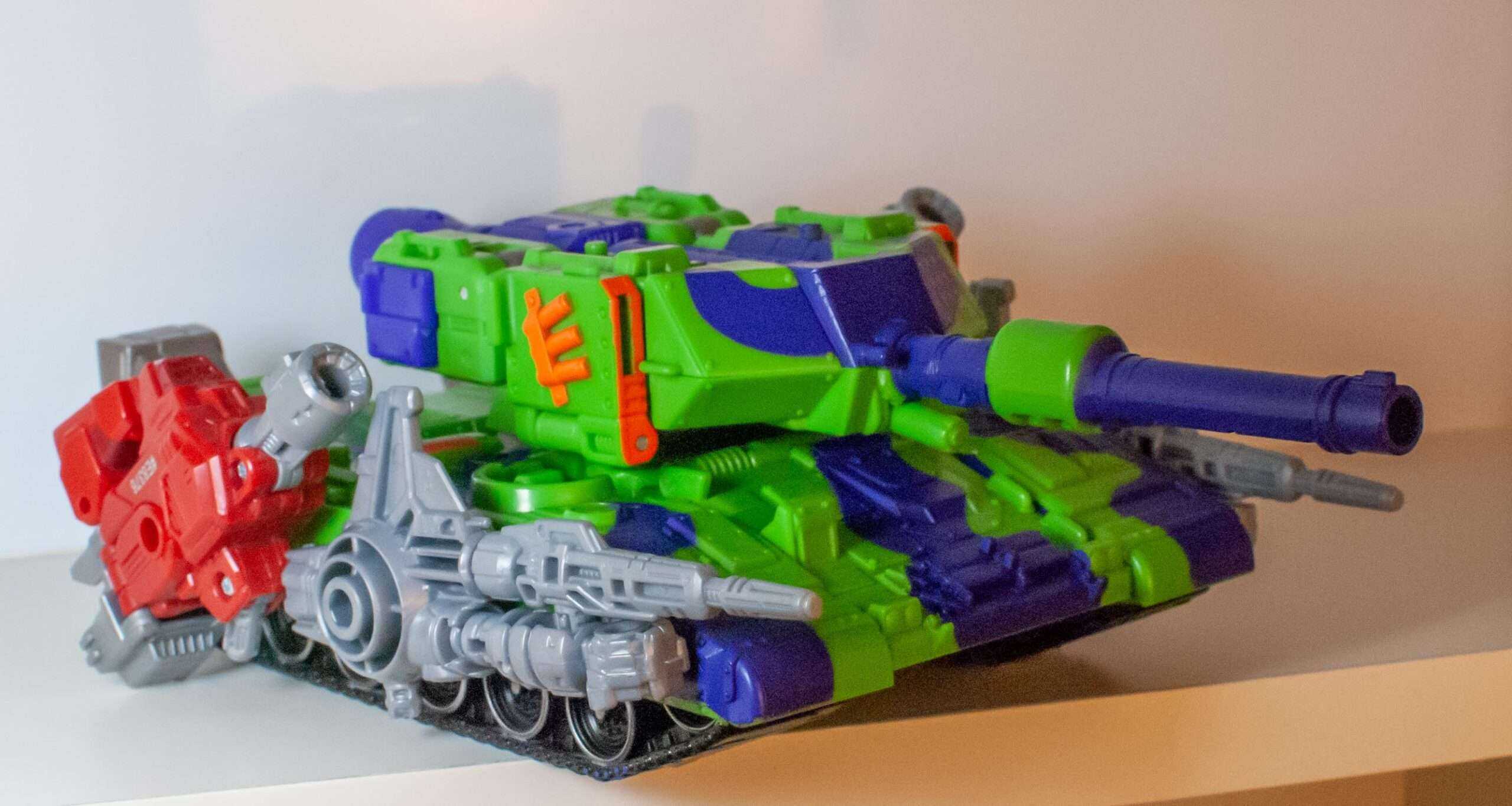 That being said, he still has his robot mode feet hanging out of the back of him, and the turret itself is still really clearly folded-up robot arms with a Fusion Cannon jammed down the middle, so it’s really about halfway there, and requires parts forming and odd accessories to accomplish. Still, as far as meaty slabs of tank go, it’s an impressive, hefty one.