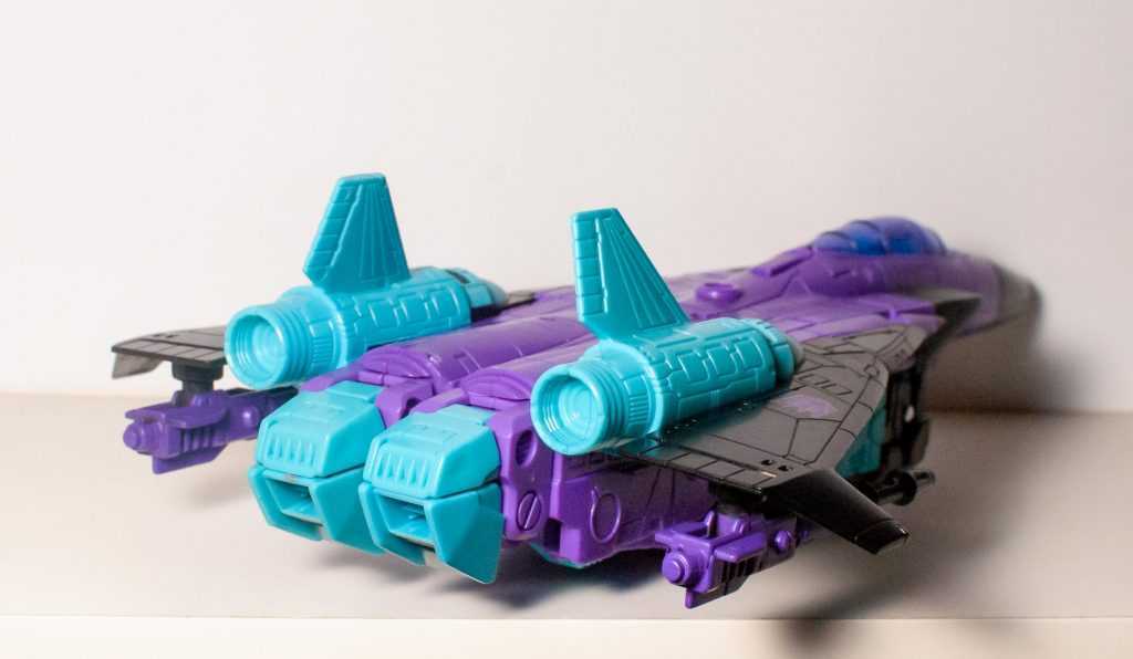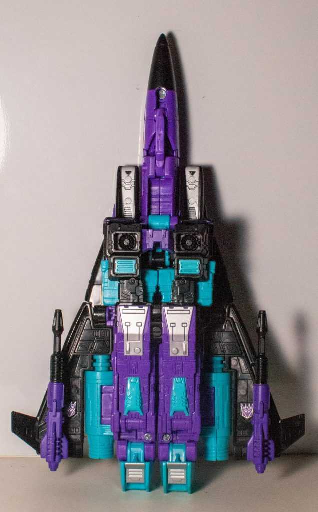 From the top, Ramjet’s colors are now more solidly divided into purple, blue, and black than they were in Robot mode. His only other adornments are a few tampographs. Surprisingly, the G1 Decepticon symbols on the tops and bottoms of both his wings are actually accurate, the original toy had no G2 logos on him.