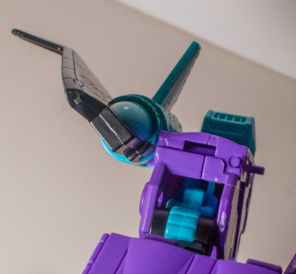 A tiny, tiny gripe that I still have with the sculpt is that the tiny swivels his winglets are on are still asymmetrical, with the right one having a line through it, makine me instinctively think I’ve cracked it. Well, that and the fact that the torso’s still blatantly there from the bottom, but is as tucked in as it usually is. Besides, on this made-up, colorful jet, it feels less out of place.