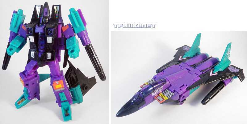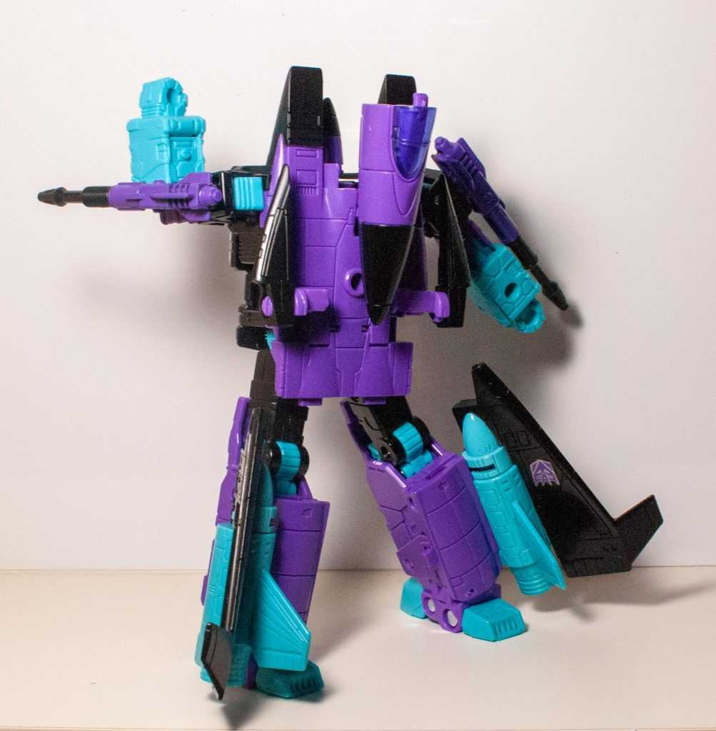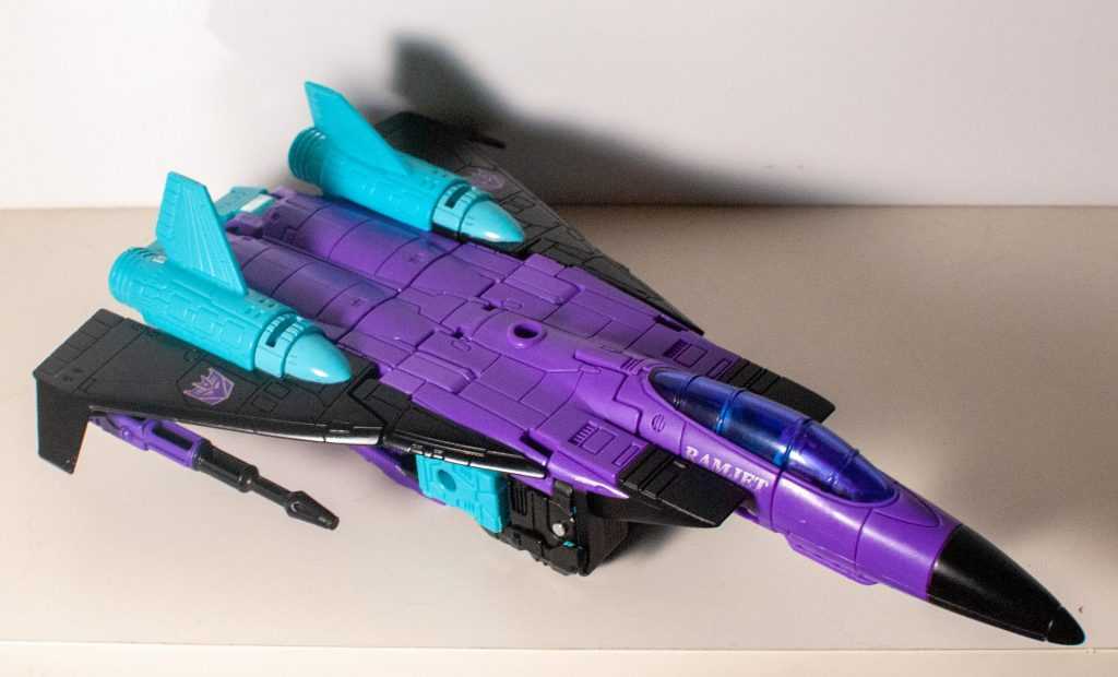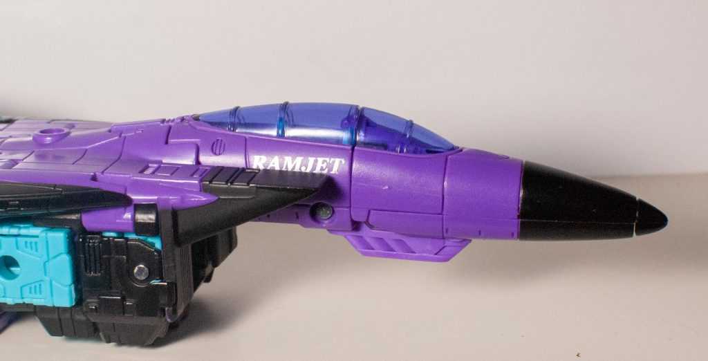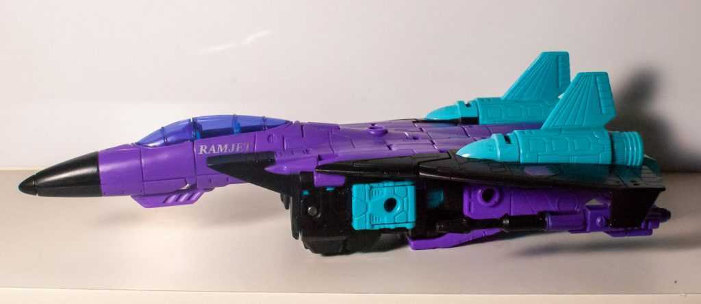 It turns out, this jet was the Generation 2 version of Ramjet, as seen in the back catalogue of nearly every G2 toy I had (admittedly, not many). This Seeker was originally a part of the second-year “conehead” team in G1, and was known for being a dumb brute (nothing unusual for the cons) who liked ramming into things with his hard head. While his fellow Seeker, Starscream got a G2 repaint that preserved the essence of his colors, Ramjet’s G2 release decided to give him a total makeover, replacing his mostly-white deco with a deliciously 90’s purple, blue, and black makeover.