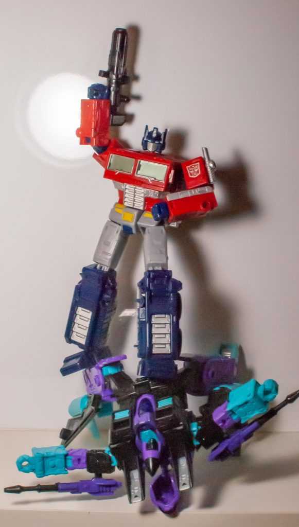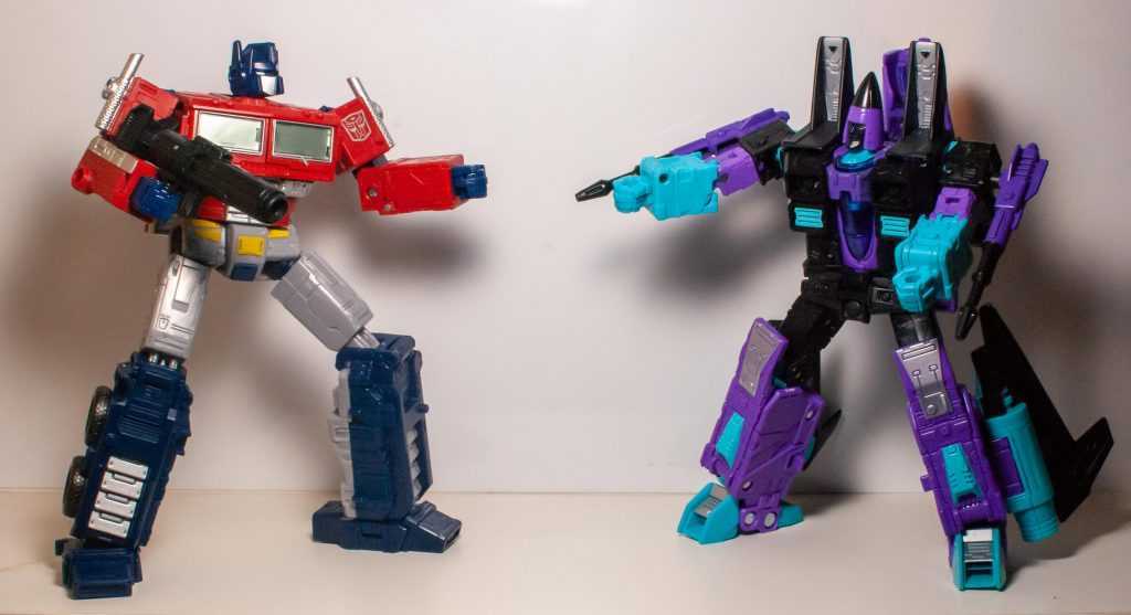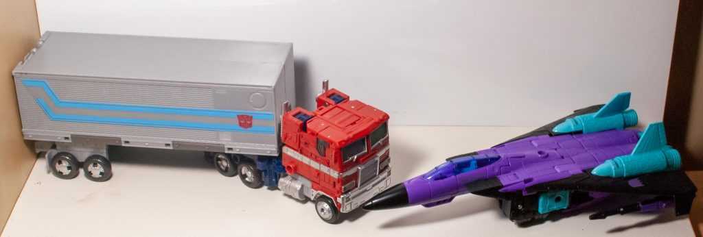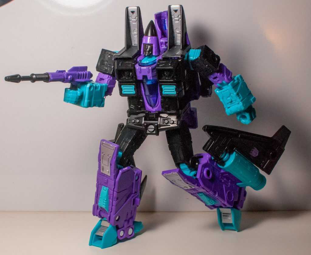 I’m always up for a Generation 2 homage, and the main reason for that is that’s where I started with the franchise. Specifically, my first Transformers experience was watching the Generation 2 cartoon every weekday morning before school (after Bonkers and Bobby’s World). It was, of course, G1 reruns, but included new CGI scene transitions, and importantly, began with a computer-generated credits sequence that’s burned into my brain, in which Optimus Prime transforms and does battle with an unusual purple and blue Decepticon jet.