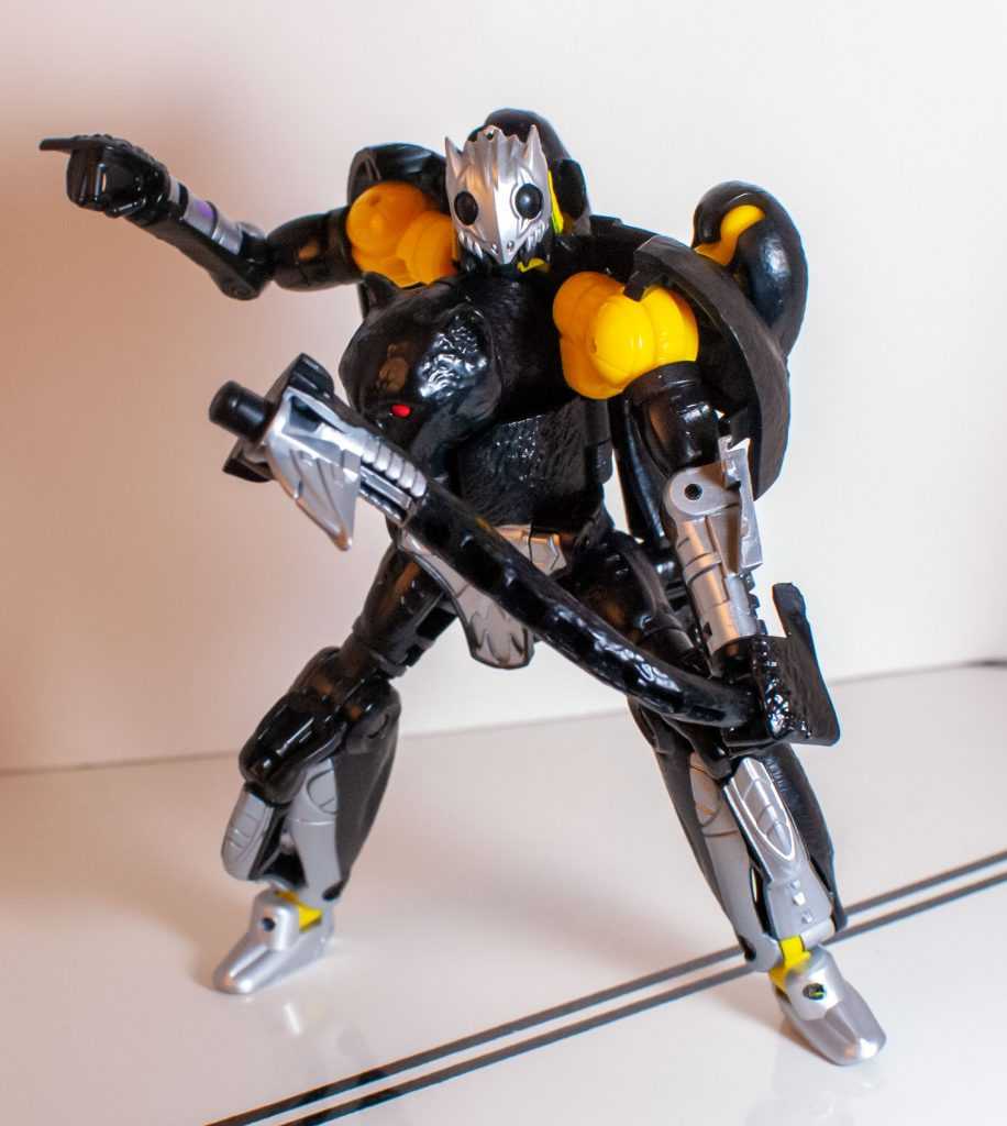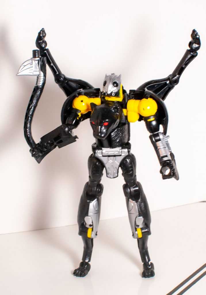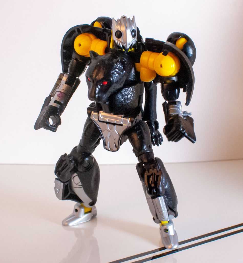 Outside of that, he’s very, very black, with only a bit of silver around his backside. I’m fixated on how his panther face is almost totally unpainted black, save for his blank, red eyes, due to how freaky it looks. Even his mouth is unpainted. I don’t know if this was deliberate or not, but it really does make him look frightening and cryptid-like in this mode, too. All Beast Warriors are robots pretending to be animals, but this guy does it in a way that underscores how unnatural that is. It’s a bad forgery that highlights the uncanny valley of it all.