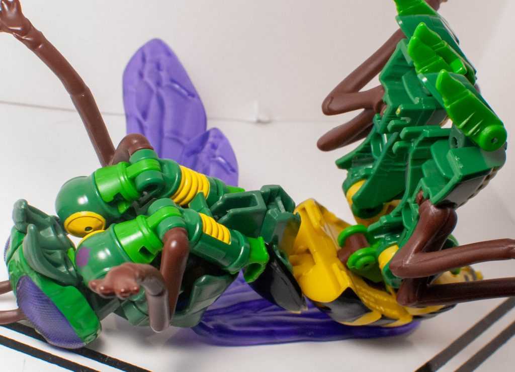 Once you get past those insect legs, Waspinator’s actually really nicely articulated, with bonuses like ankle tilts and swiveling wrists, as well as wings that are mounted on a ball joint each. It looks like he has no waist joint, thanks to how it pegs in, but he does, and his wasp-head mandibles can move to help facilitate the twist.