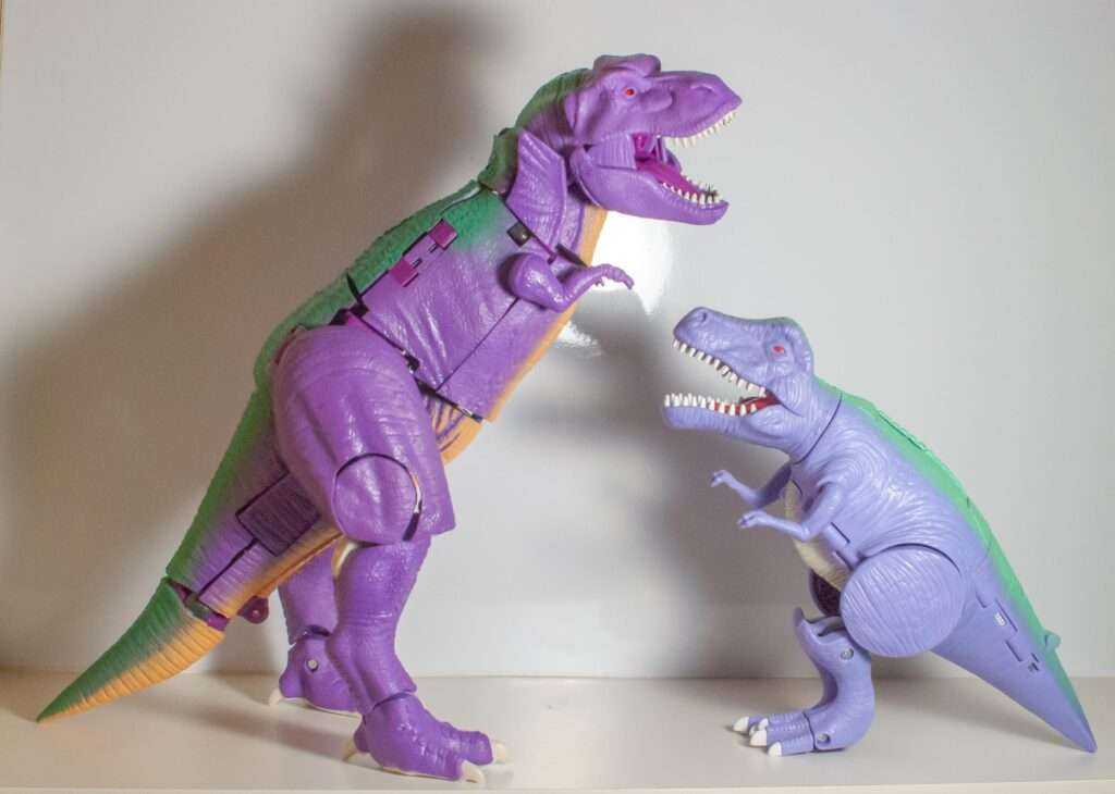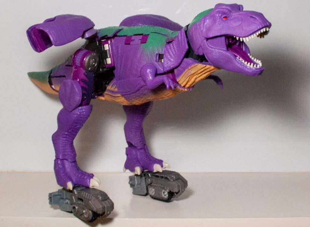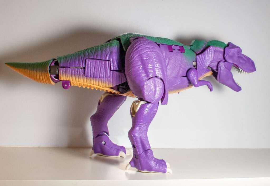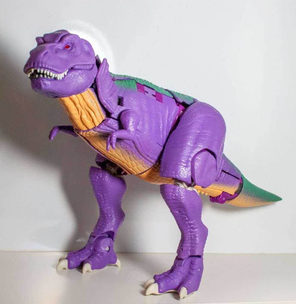 Another remarkable aspect of this mode is that despite being a shellformer, he manages to be extremely poseable. Compared to how the original was nearly a statue, this guy can bend and move. His tail has two joints for back and forth motion, he’s got his robot-mode ankles and knees, forward-and-backward hips, his tiny rex shoulders can move, his jaws can snap, and, finally, he’s got a full range of neck articulation.