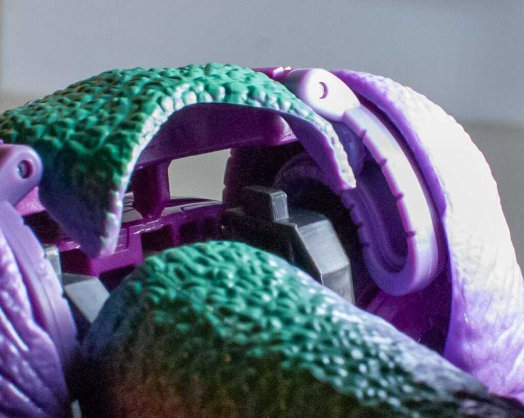 There’s another interesting bit of handfeel to him, too: His dinosaur parts are made out of a more rubbery, semi-flexible kind of plastic, and feel almost like reptile skin. There doesn’t seem to be a design reason behind this that I can clock, so I guess they just wanted him to feel authentic to the touch.