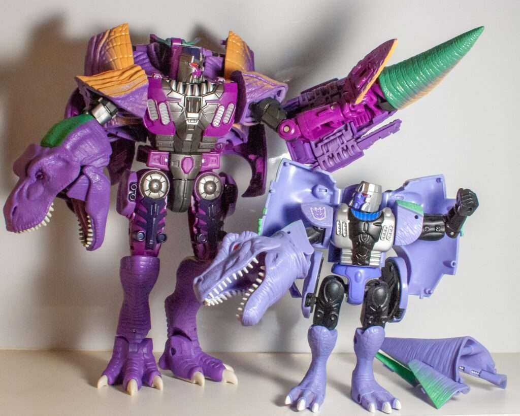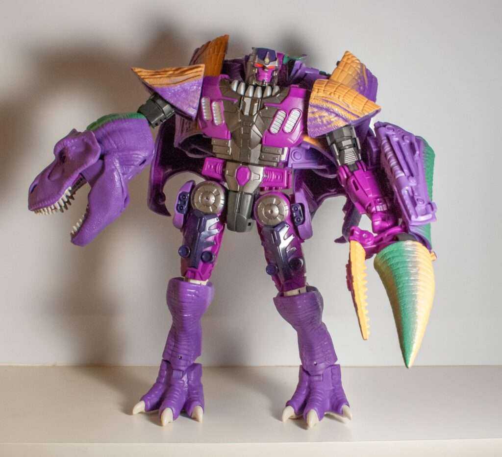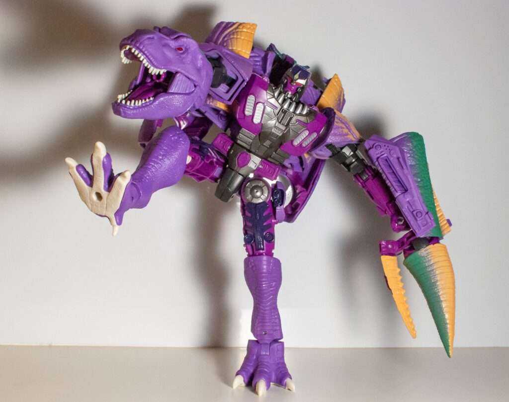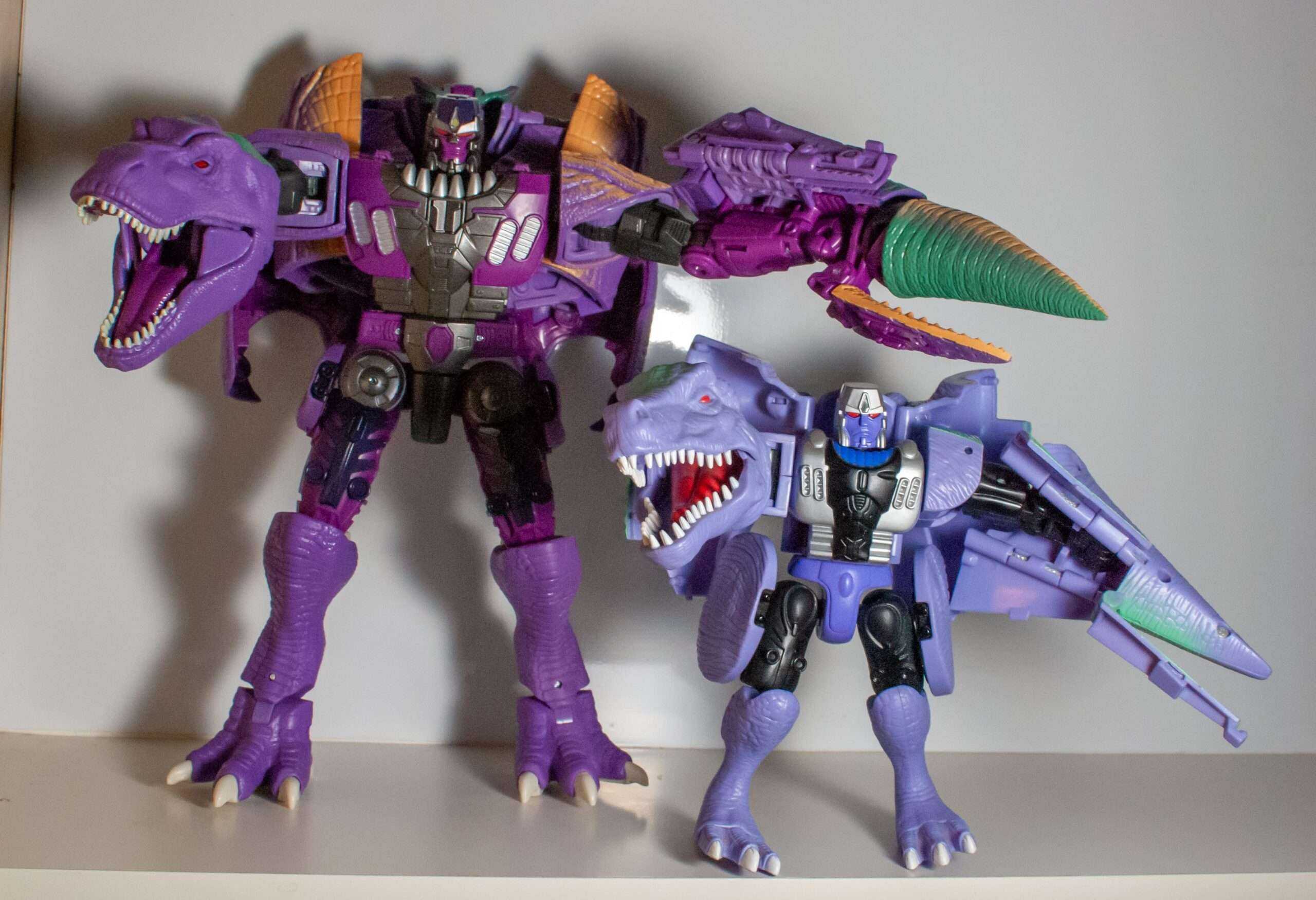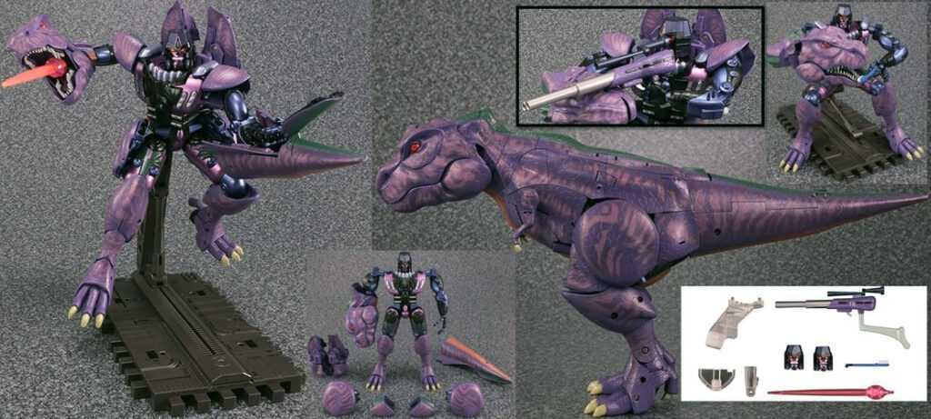 Megatron’s second Beast Wars figure (after the alligator the show skipped over) was a big Ultra-Class line centerpiece alongside Optimus Primal, and was definitely another one of the all-time great Transformers releases, packed full of features and poseability. Strangely, his mighty T-Rex alternate mode was purple, and believe me, people have made Barney the Dinosaur jokes since 1996.