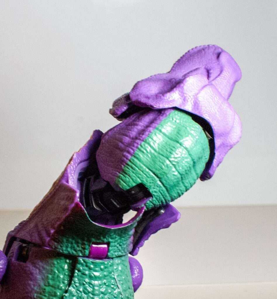 Funny enough, it’s so realistic (well, “realistic”) looking, that the sculpt almost clashes with the purple colors and solid-red eyes. Outside of those, he’s got a green stripe on his back, a beige belly, white painted toenails, painted teeth on his mouth, and even a tongue that’s colored a different shade from his skin.