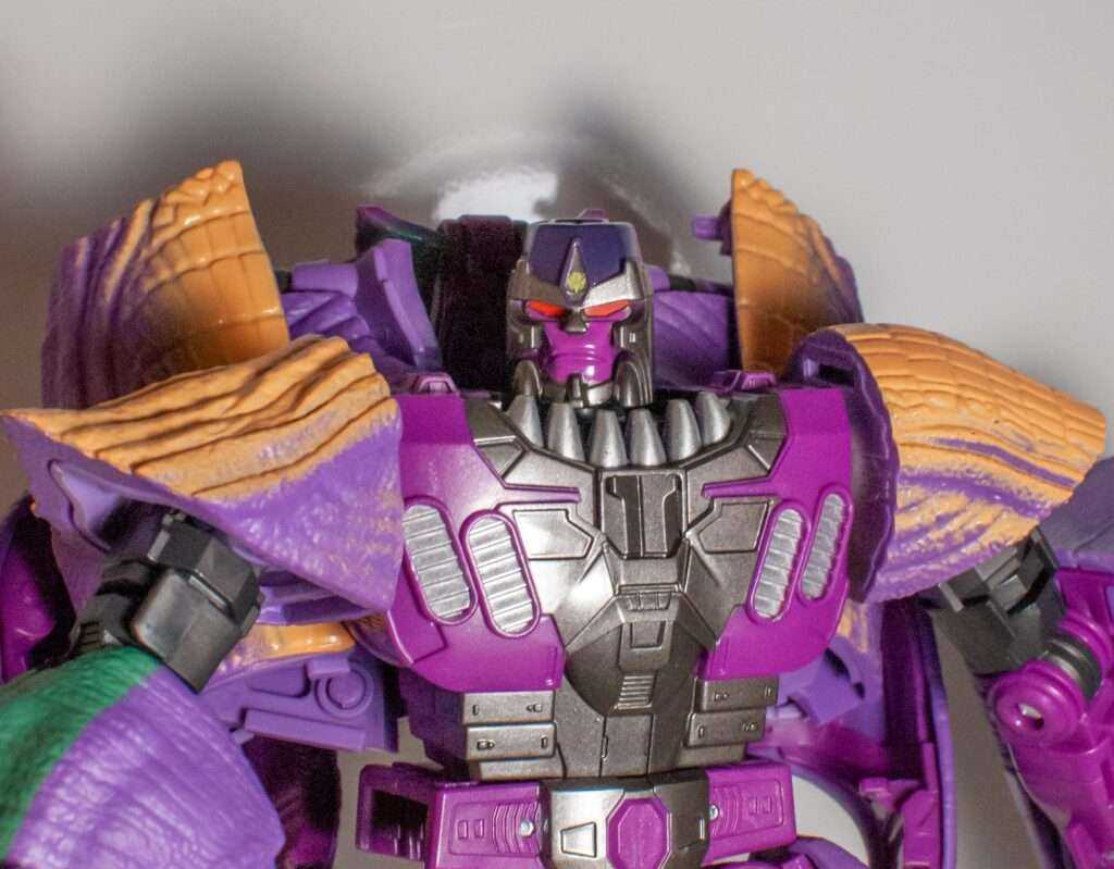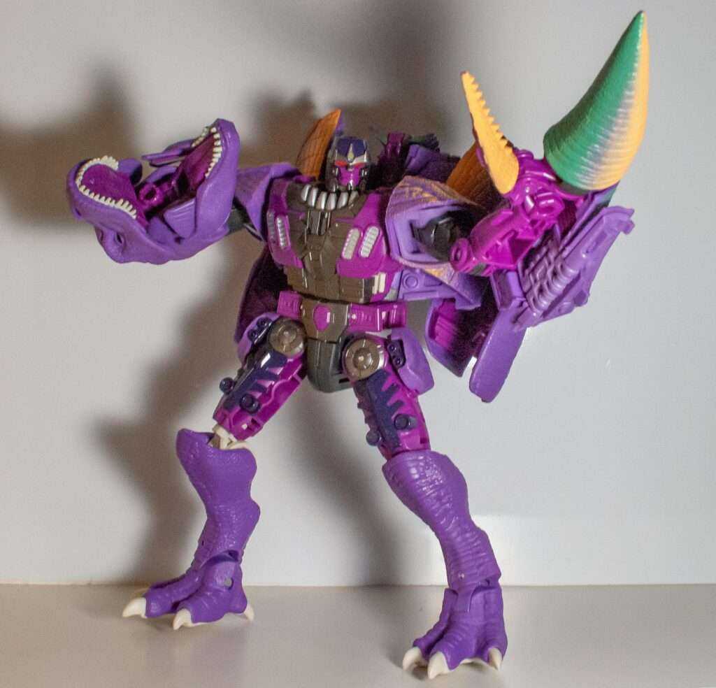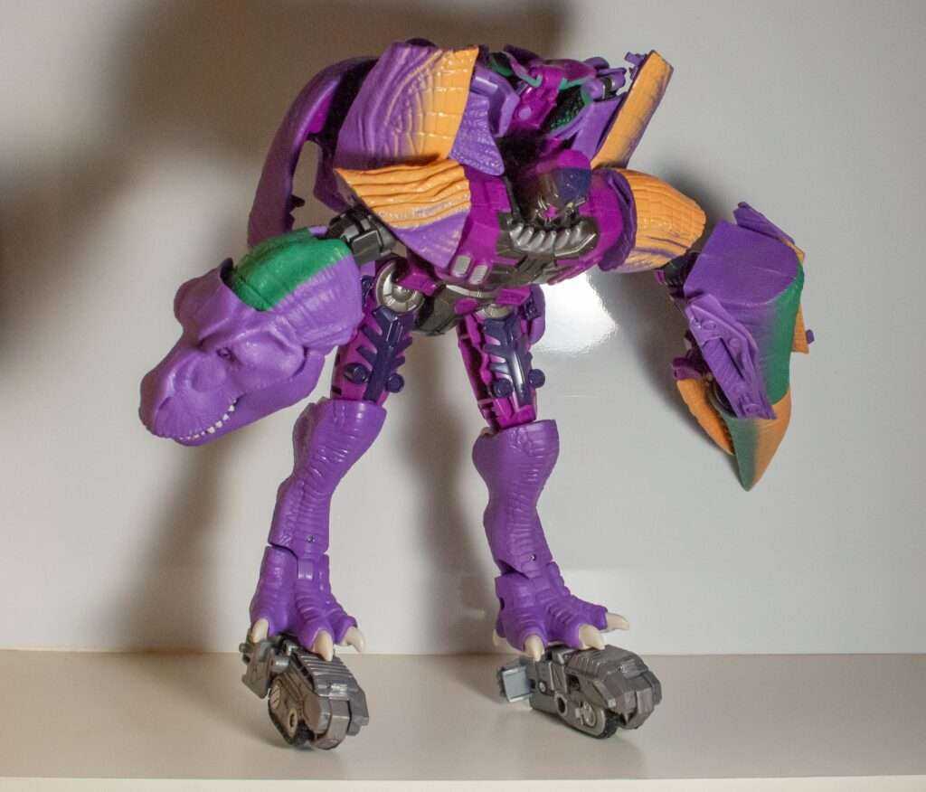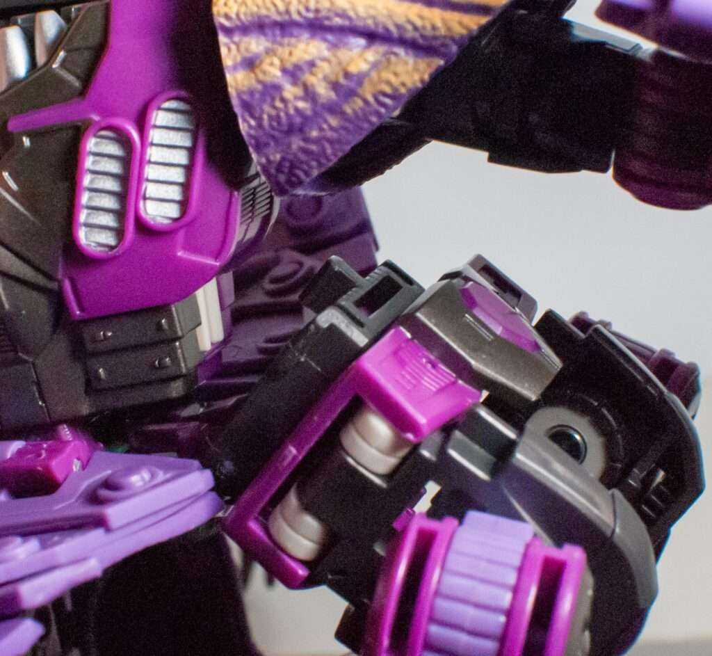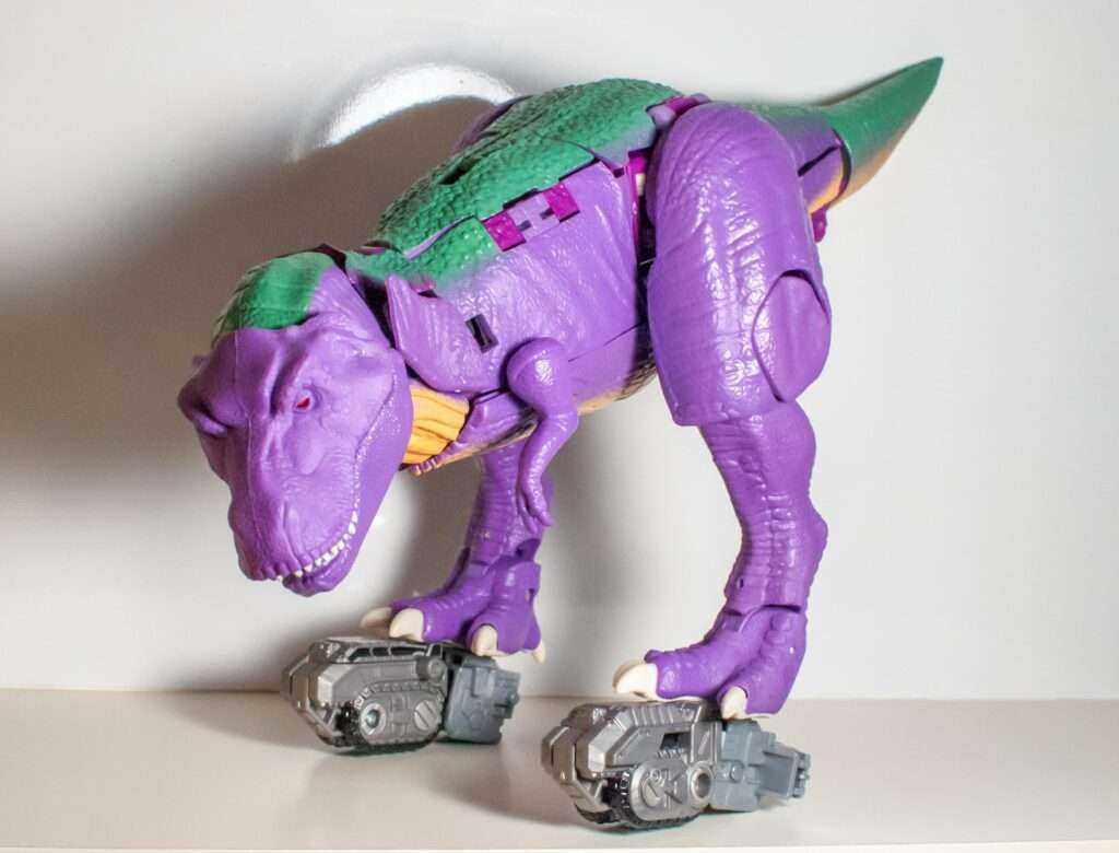 Speaking of that, Megatron’s got a lot of colors going on here. There’s multiple shades of purple, and while I think the purple on his robot parts are is a more vibrant shade of it than he usually is, he still looks right. Meanwhile, his T-rex bits feature more muted, lavender tones as their base. His robot bits have a bunch of dark grey, while his dino parts have green and beige tones, and his body’s got accents of silver, red eyes, and a tiny Predacon symbol on his helmet. The most amusing bit of deco is that the soles of his dino feet are white pads.