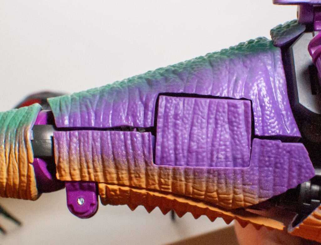 The one thing I did need a warning about was the square panels on either side of his tail. While plugging them in, I accidentally “inverted” them, overextending them in the opposite direction they were supposed to go, and when trying to squeeze them back into their robot mode position, stress-marked one of them fitting it back the way it was supposed to go. Weirdly, though, the rubbery hide he’s made from seems to have a healing factor, and the stress mark has nearly vanished.