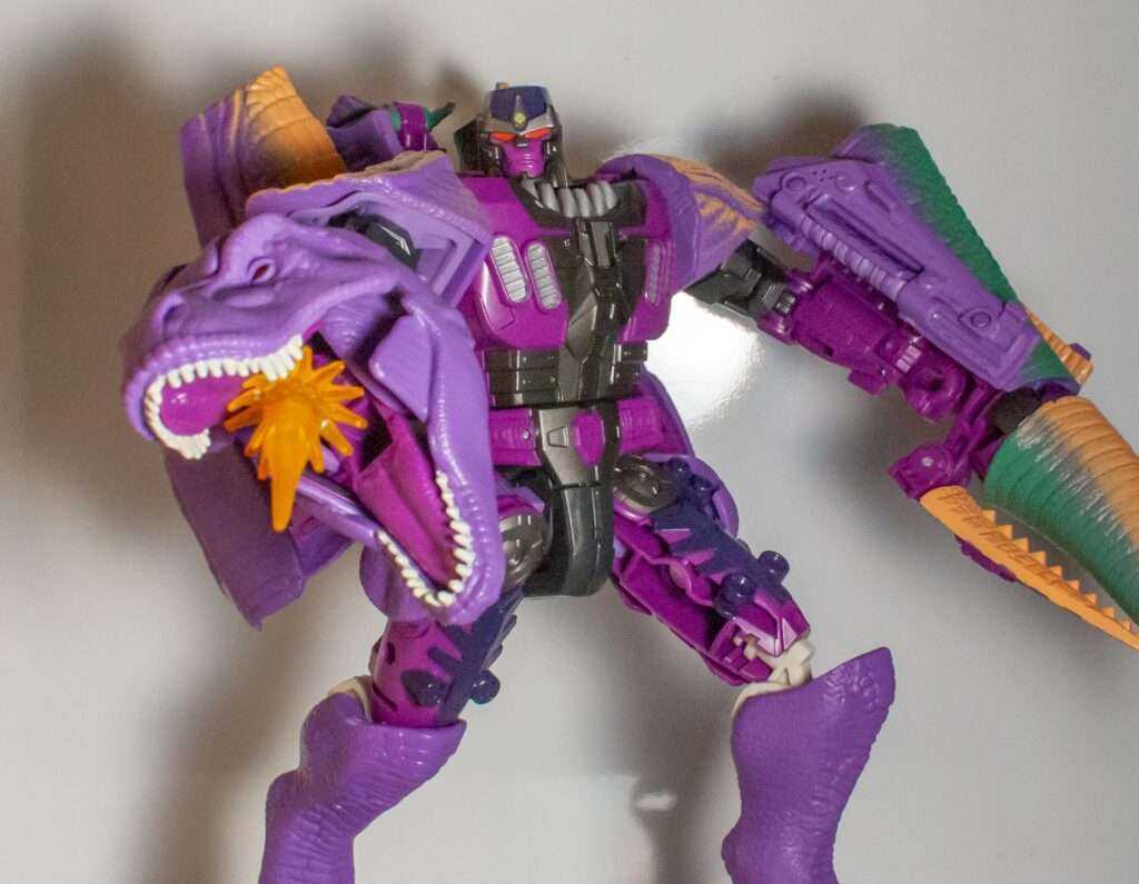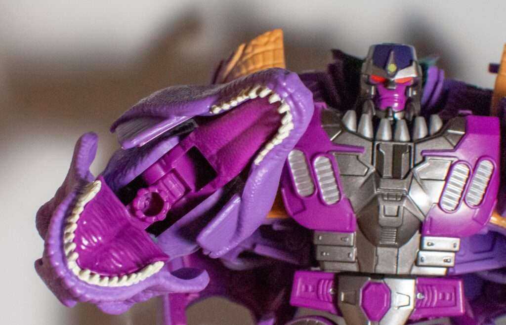 For gimmicks and features, he’s also a little bit threadbare, compared to the spring-loaded claws, missiles, and water-squirter of the original, but I don’t really miss them, and again, the money seems to have gone into his design, articulation and paint. One little feature he does have can be found on the T-rex head on his right arm, where, when you open its mouth, it’s geared just so to make a round gunbarrel emerge slightly, in the place of the original toy’s water squirter.