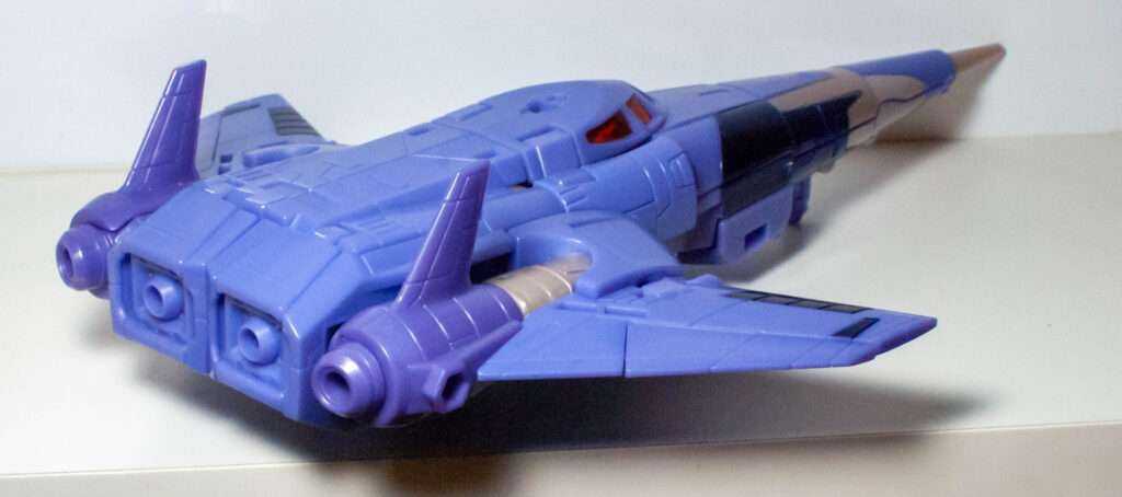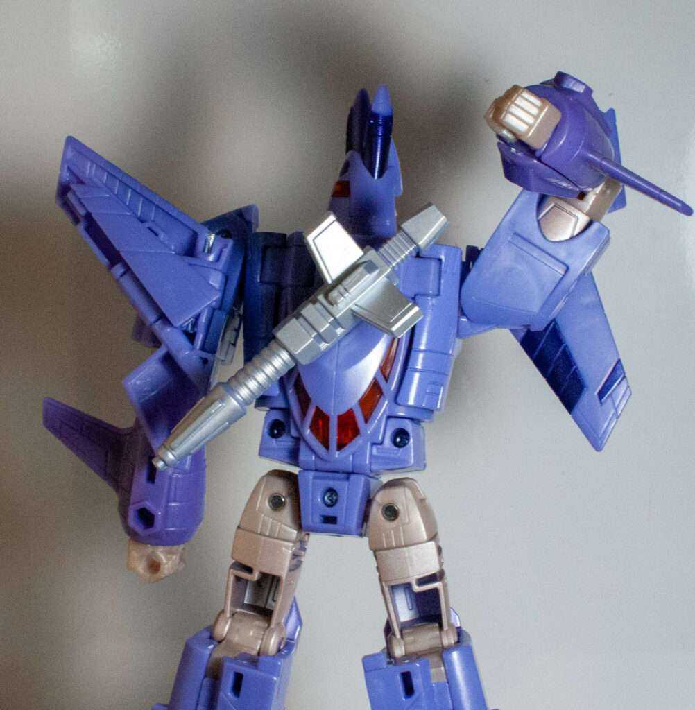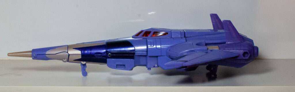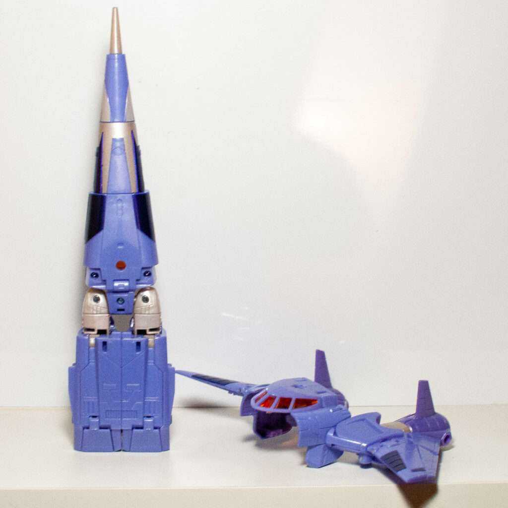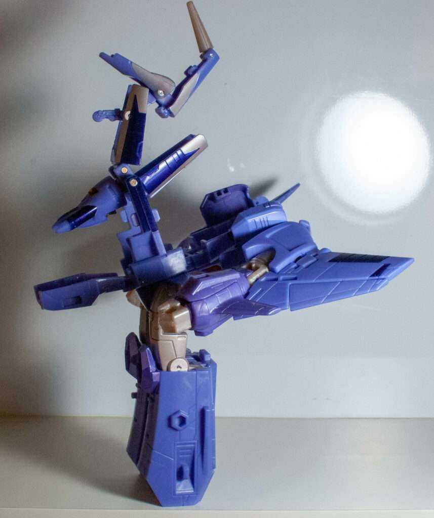 This is another thing the Transformers fandom has been going on about. Basically, his robot head and torso becomes his conical jet body with what can best be described as A Hinge Explosion. In other words, the entire thing telescopes out of his torso via a Russian Nesting Doll of hinged openings. It’s pretty wild, even if I have trouble remembering which side of each hinged opening is the part that swings open.
