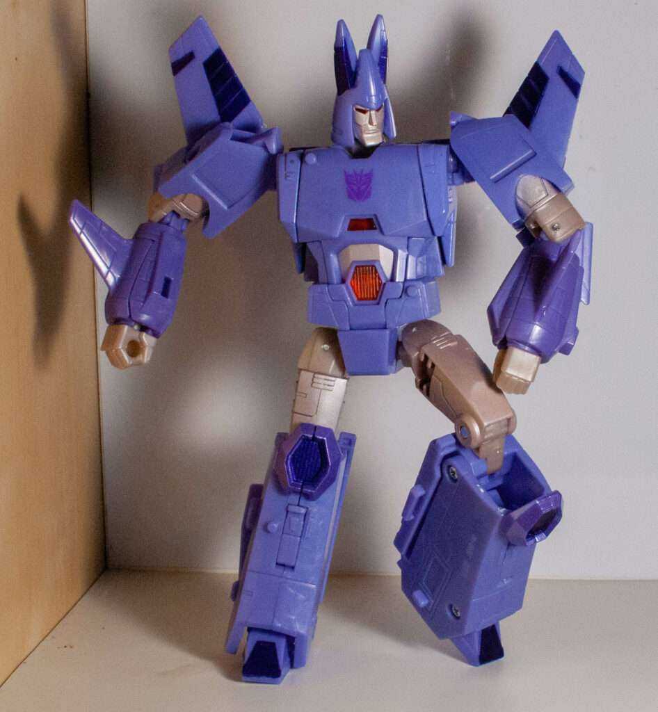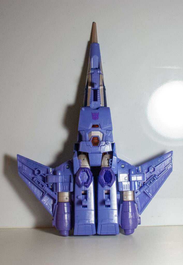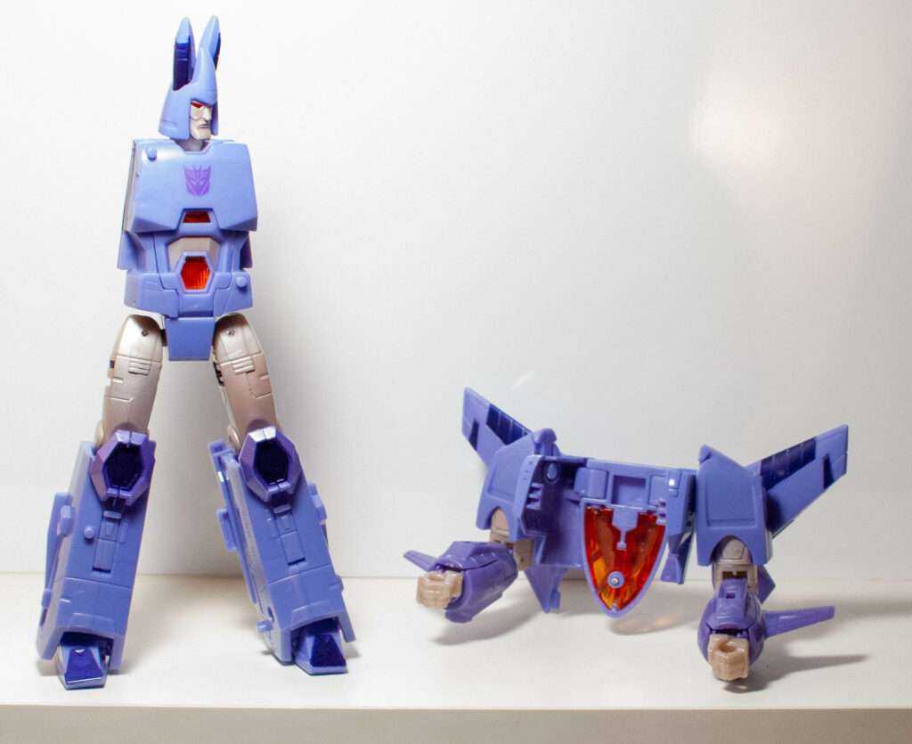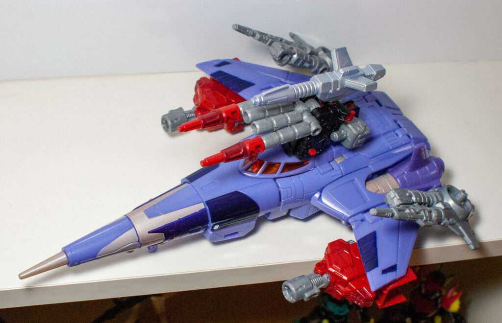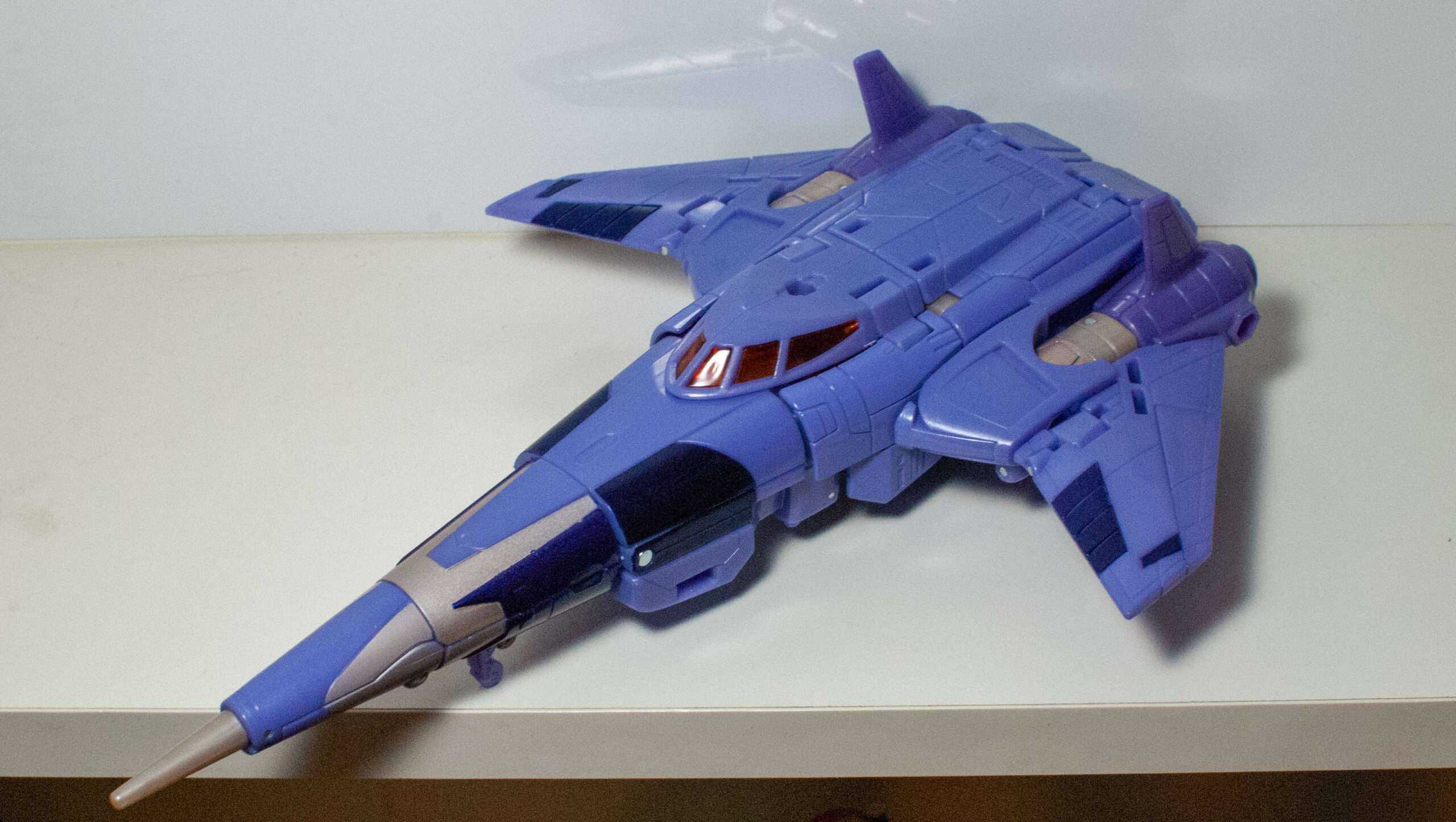 This is another thing the Transformers fandom has been going on about. Basically, his robot head and torso becomes his conical jet body with what can best be described as A Hinge Explosion. In other words, the entire thing telescopes out of his torso via a Russian Nesting Doll of hinged openings. It’s pretty wild, even if I have trouble remembering which side of each hinged opening is the part that swings open.