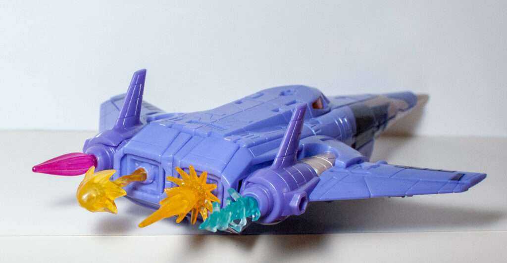 These include Seeker-style ports beneath the wings, one each near the back of the jet, and those four sculpted engines in the back, which can hold either weapons, or effect parts for a blasting-off experience.