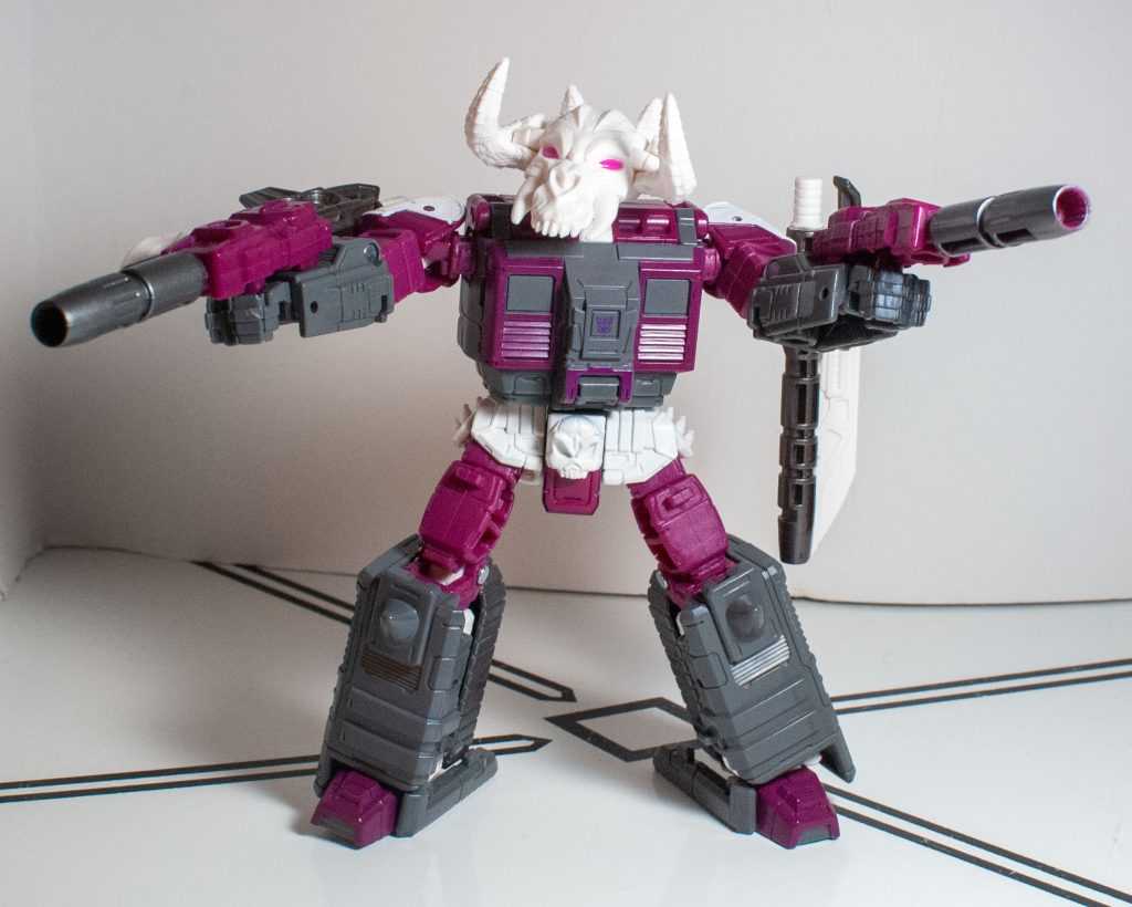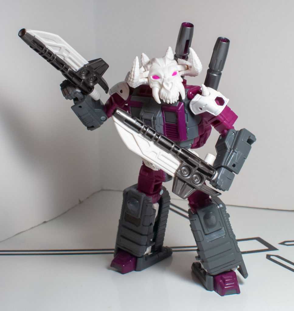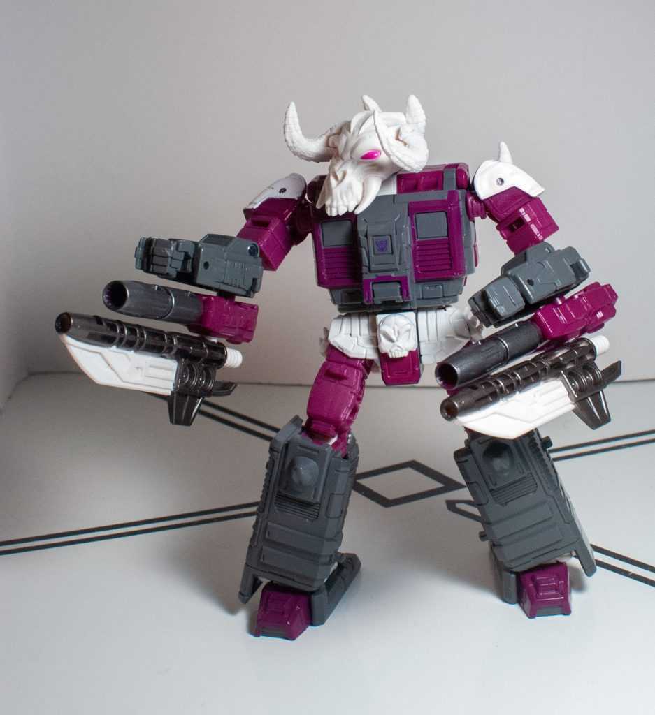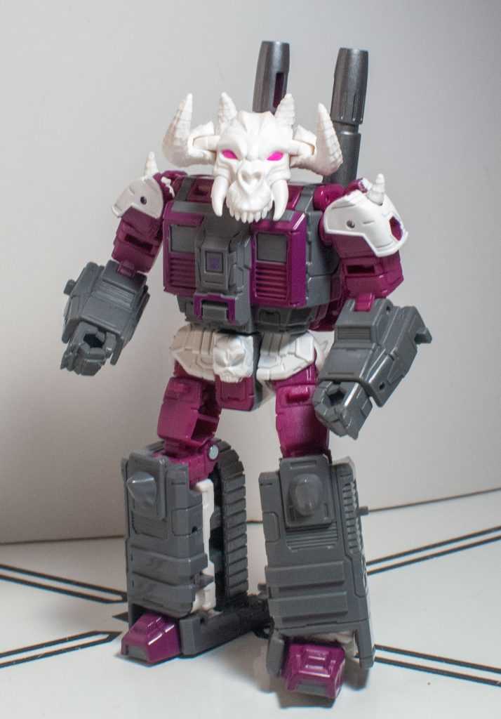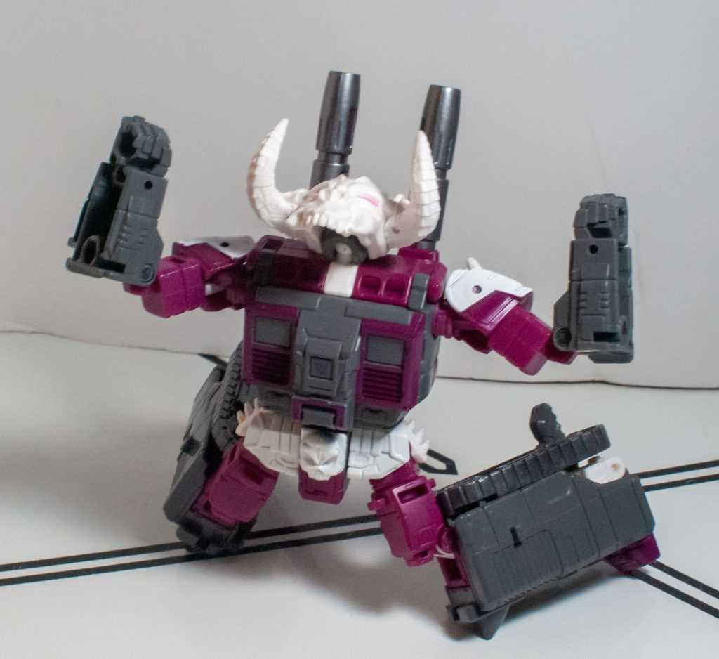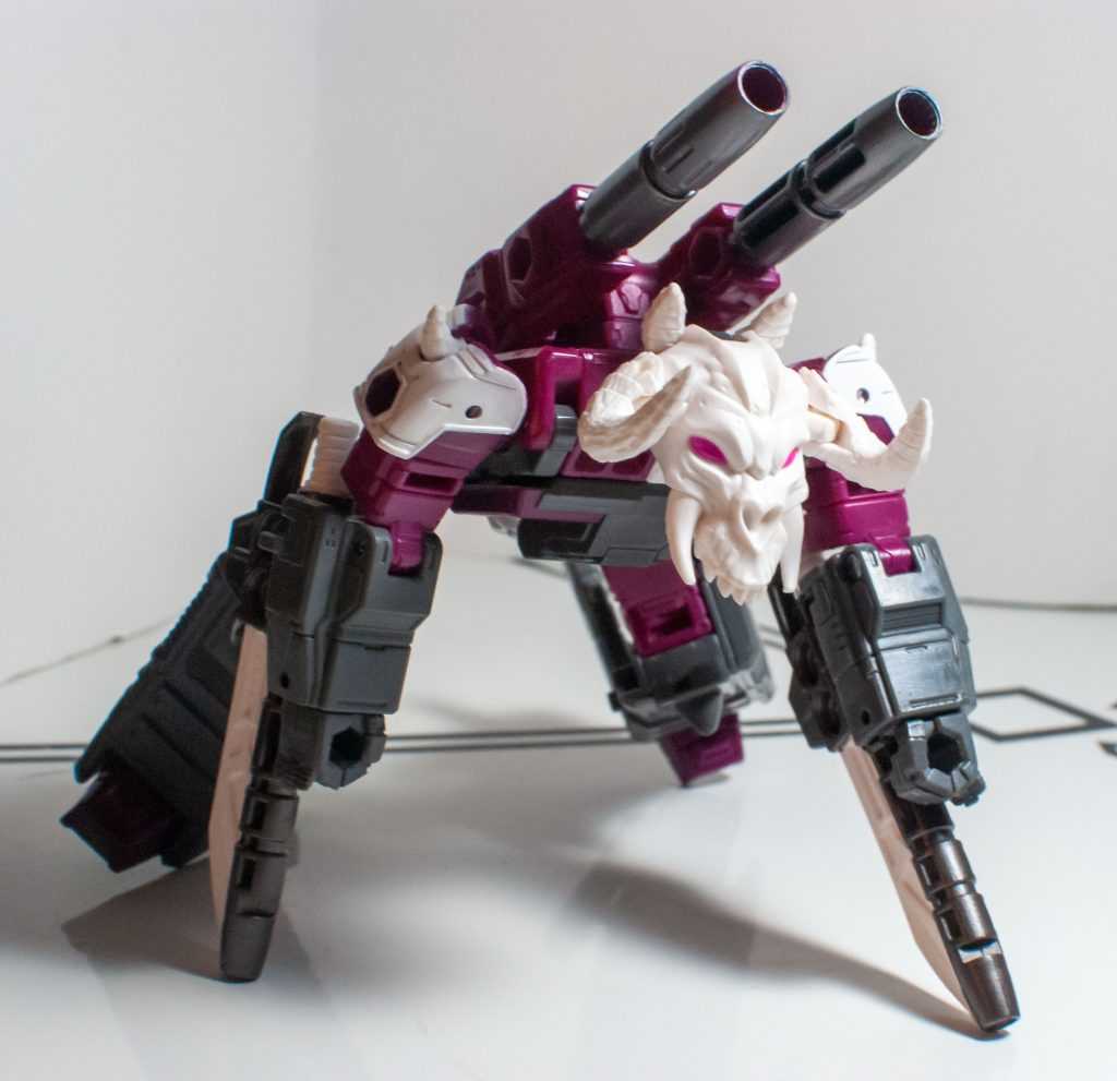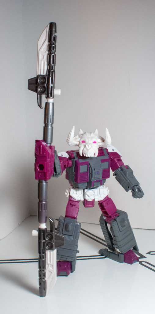 His articulation is mostly good, but does have a couple odd limits. On the positive side, he has the full Siege suite of joints (though his wrists only dip, not swivel, due to transformation), and his oversized skull head’s on a balljoint with enough clearance to allow it a broad range of motion. Plus, you can rotate his horns inwards (which is how he comes packaged) to make it look like he’s shyly hiding, another point on the “odd cuteness” scale.