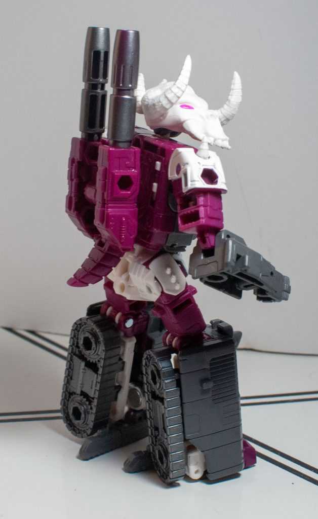 The rest of him mostly scans as the kind of robot that would be a generic backgrounder in a Transformers comic, a fairly basic design made out of squares and rectangles, without any details that really stick out, save for the spiked armor on his shoulders, and the skull in front of his belt. He’s got a couple double-barrelled cannons on his back to give him something more to his silhouette, but you can even remove the whole turret (more on that later) to make him even more generic.