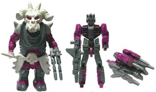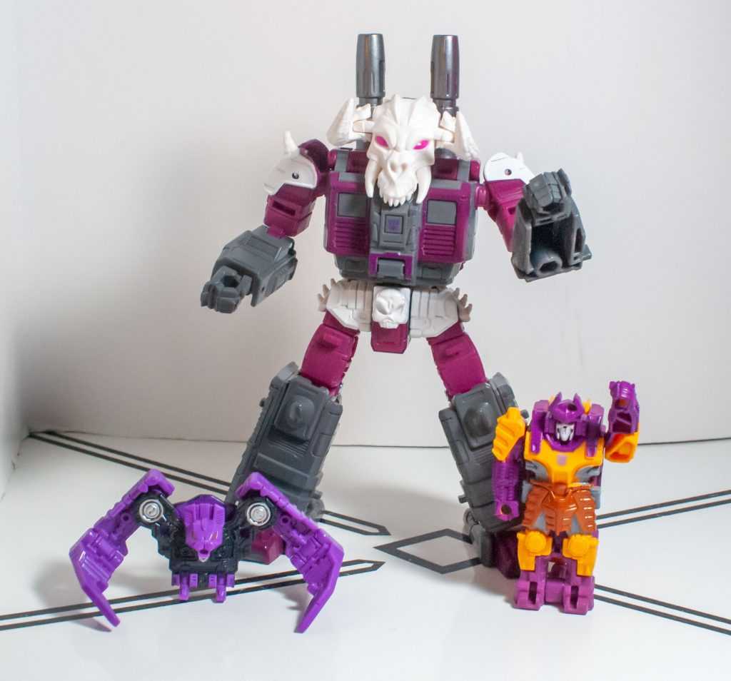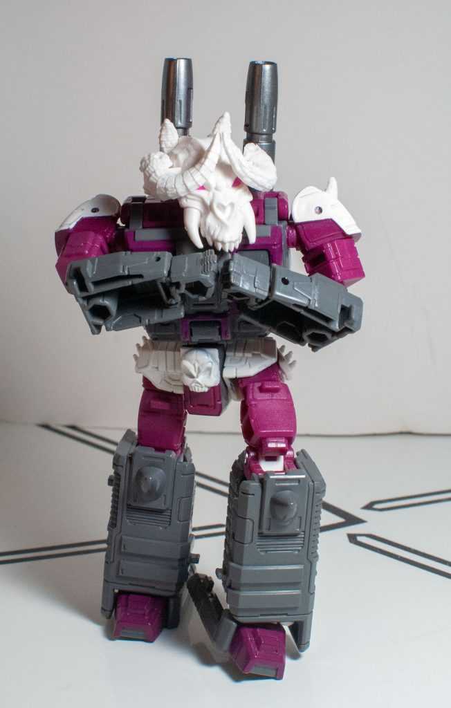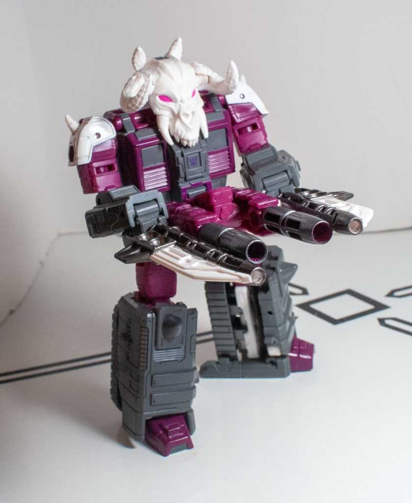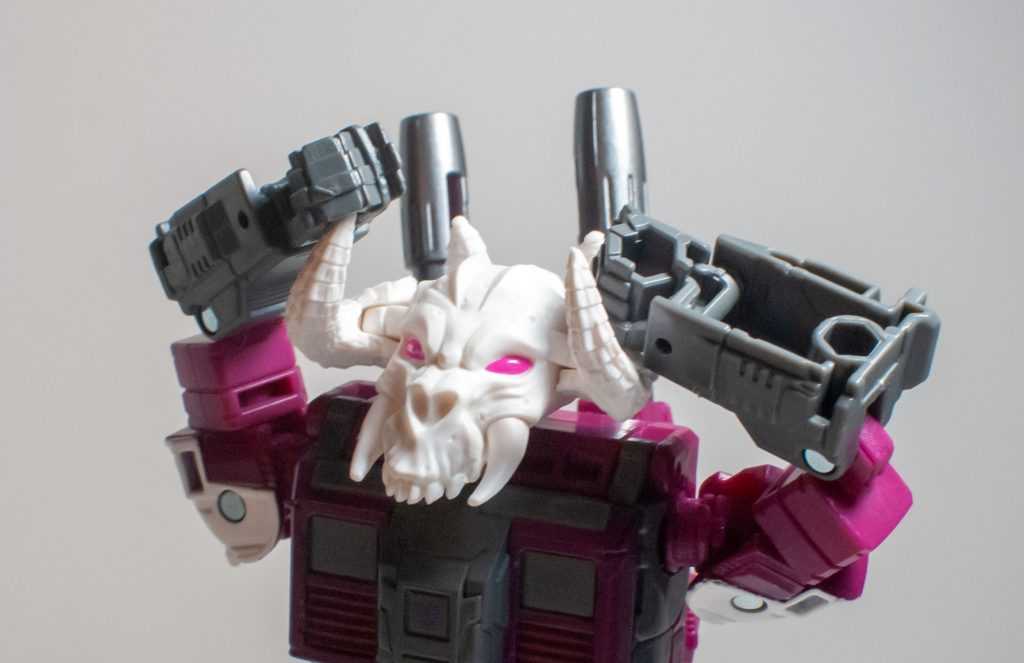 For colors, there’s a really clean delineation between the Pretender parts and the Robot parts. His skull and costume parts are a creamy off-white (painted on the body, plastic on the skill), with the skull itself having pink eyes (again, oddly adorable). The robot bits of him, meanwhile, are an even mix of dark purple and dark gray, again, alternating between paint and plastic, with decent color-matching. The robot bits are an exceedingly late G1 color scheme, it feels like a third of all the Decepticons were some variation of that, so it’s particularly evocative, and I like the deliberate mismatch between the body and the skeletal bits.