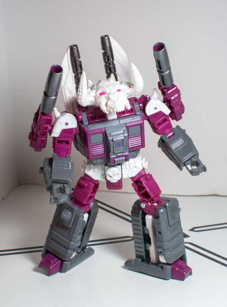 Before picking this guy up, I’d heard that he had a reputation for being complex to transform. In practice though, the conversion’s not that complex, so much as it is complex for a fairly basic alternate mode. It’s like, medium difficulty. Probably the hardest part is making sure some of the horns on his head are out of the way, so his chest closes up.