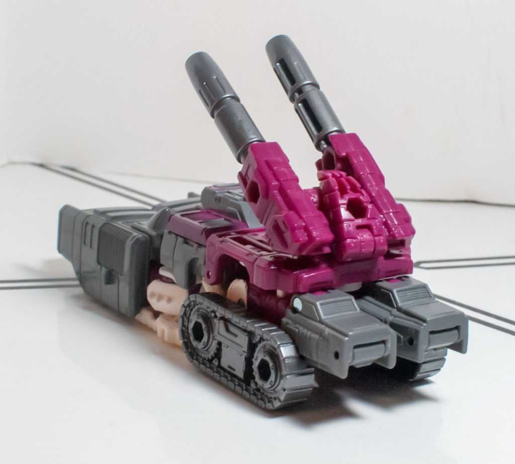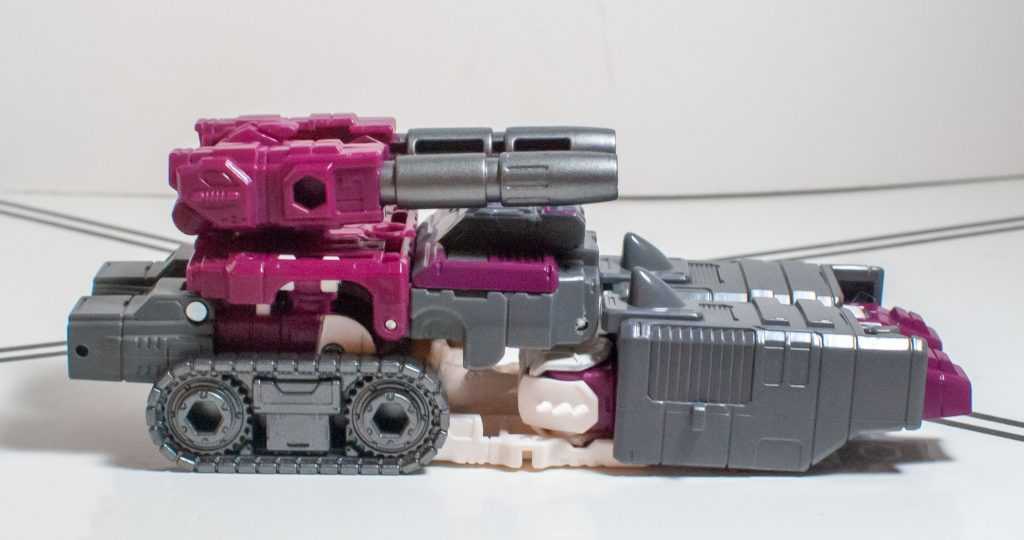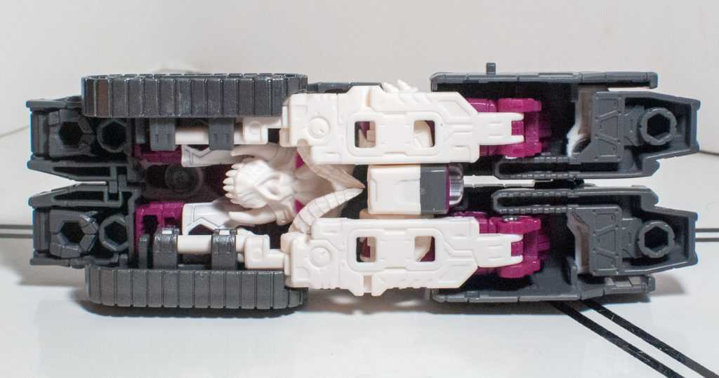 Infamously, the tiny, simple nature of the original inner Pretender robots, who had to be small and thin enough to fit in the shells, meant they often had poor, abstract altmodes. And the rumors are true, Skullgrin’s altmode really is just a slab, with some treads and a turret.