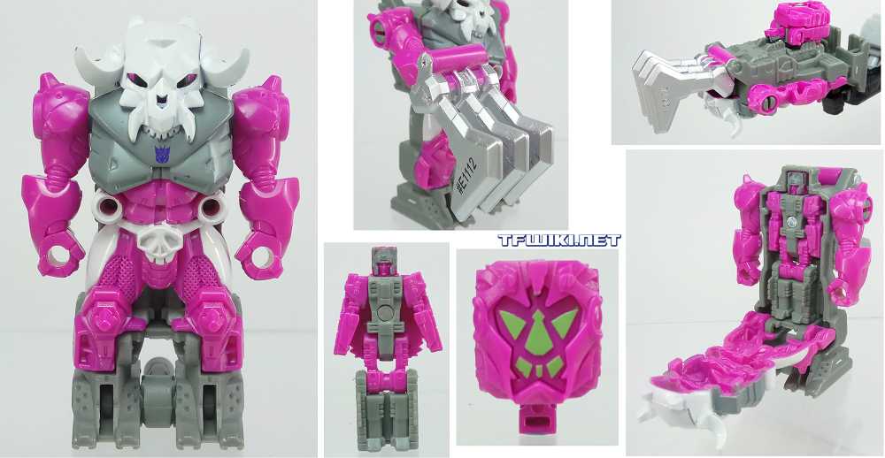 So, in theory, what’s supposed to be going on with Skullgrin’s design is that he’s a fusion of his smaller inner robot, and Pretender shell looks. Specifically, his head, shoulderpads, and belt are based on the organic shell, and the rest is the inner robot. In practice, though, the latter two details kind of vanish, and he really looks like an extremely boxy robot wearing a skull mask.