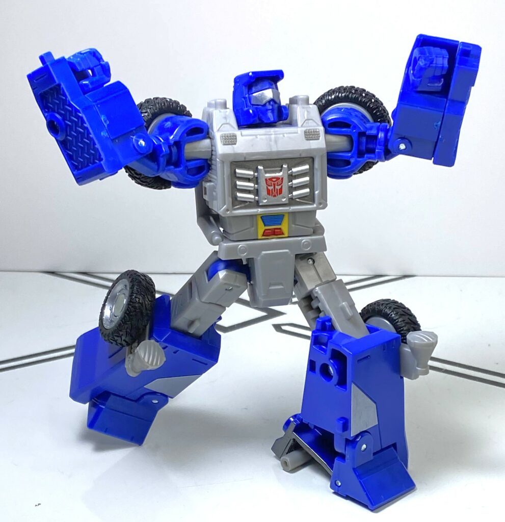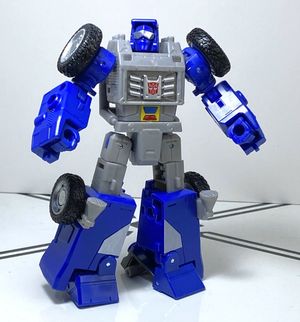 For colors, he’s mostly two tones: Dark blue, and light gray, with a bit of black for his wheels. It’s funny how a characterful colorscheme communicates his chilled-out countenance. He’s also got plenty of deco on him, including silver for his glasses, among other details. There’s an Autobrand on his chest, and a funky little yellow, red and blue tampo on his bellybutton, again, representing a specific animation model detail. Speaking of that, the specific color choices on him do make him more toon-accurate than the Power of the Primes version, between changing up where the hits of color are, and making his blue darker.