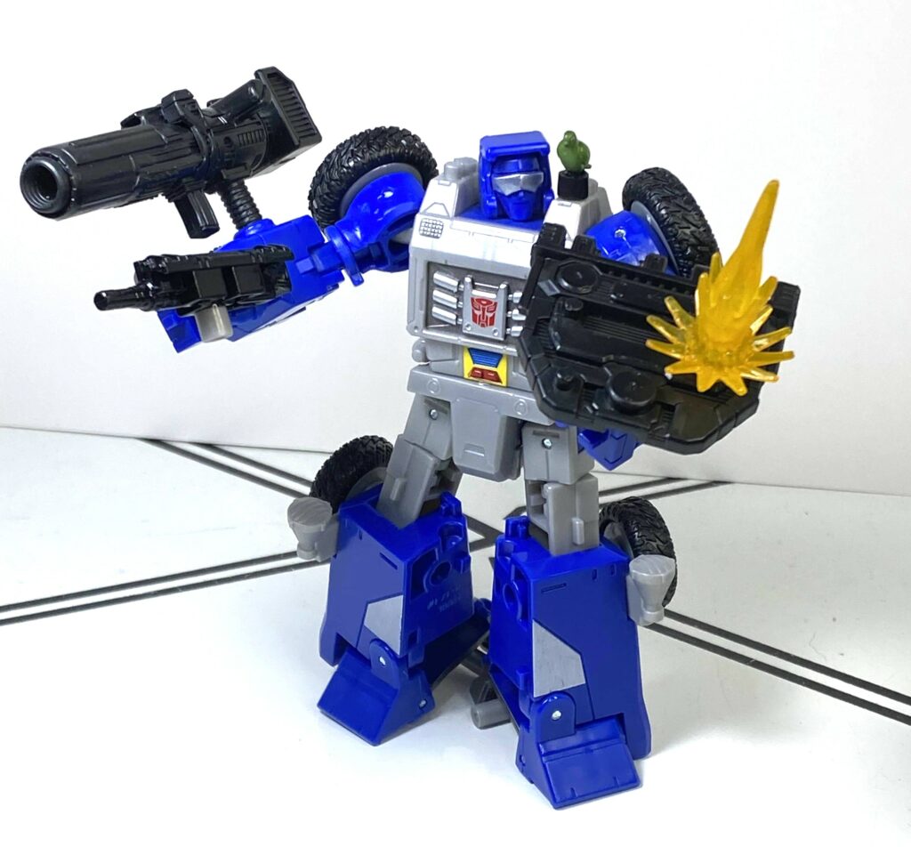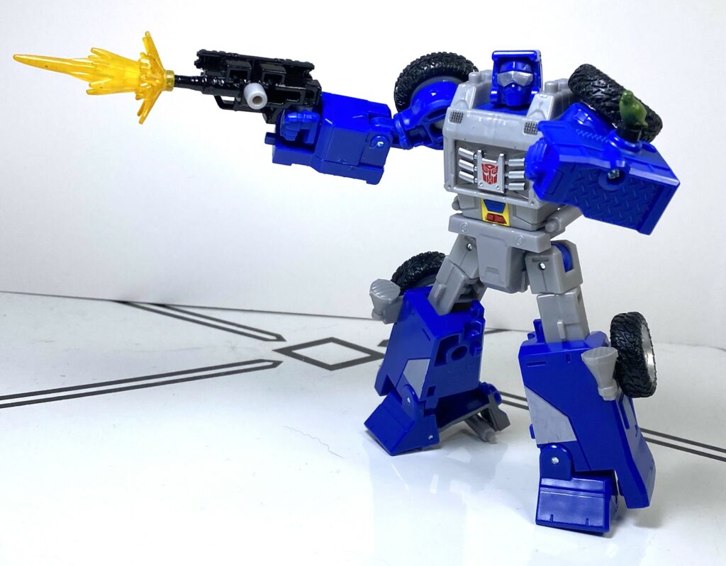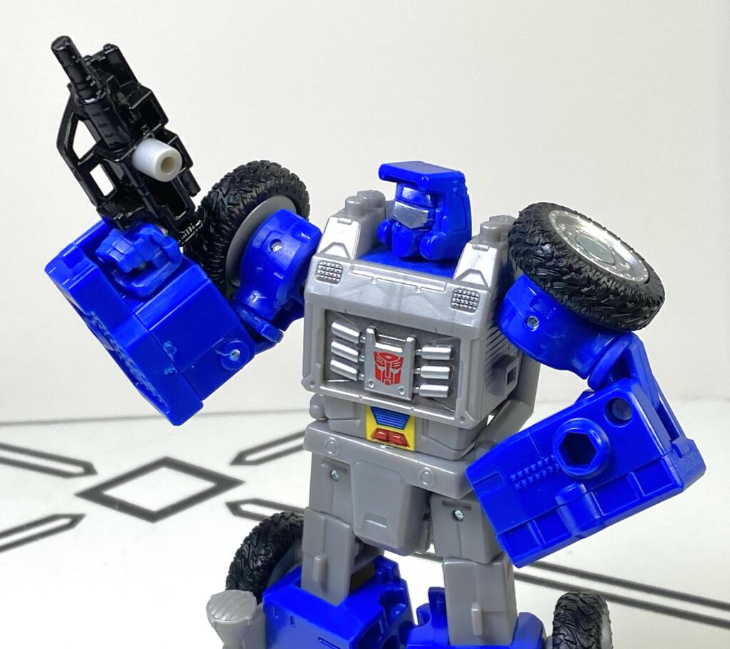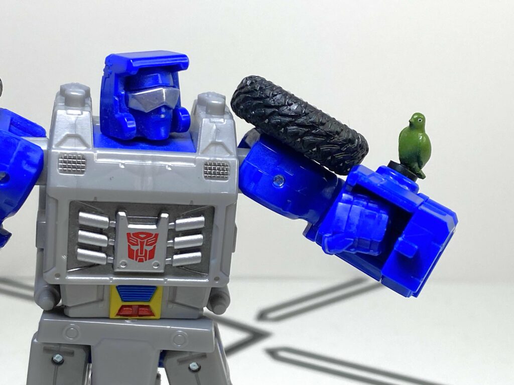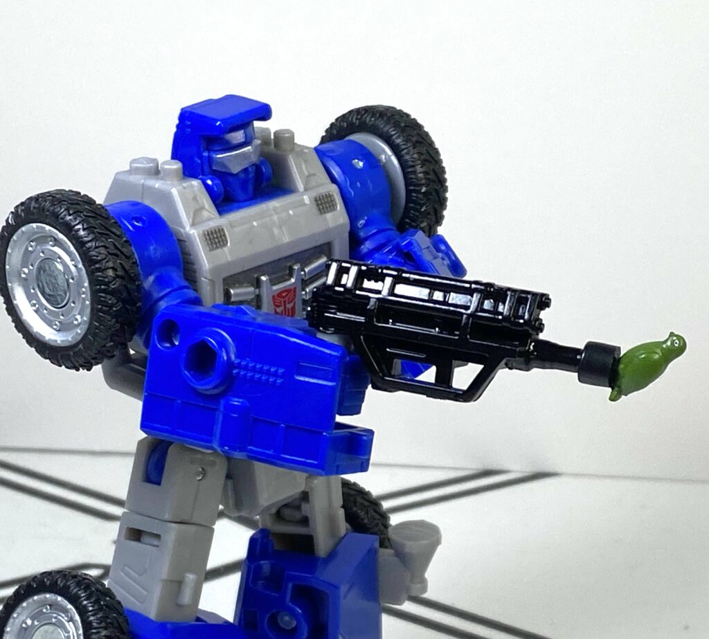 It’s interesting to me, because this  specific feature, where you could clip a weapon onto a bar on the figure, was a whole little gimmick ecosystem back in the old 2010’s era Transformers Generations toyline, so it’s kind of nostalgic seeing it make a tiny little return. I don’t think he’s compatible with the old C-clips, though, since they were smaller.