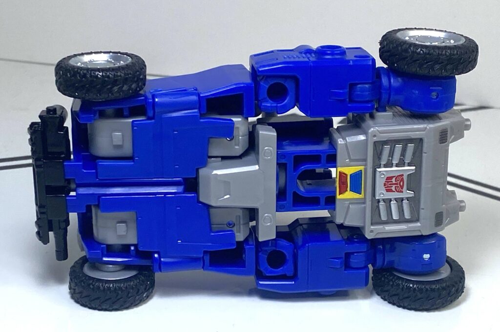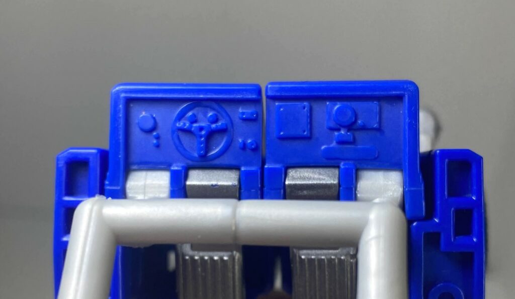 For colors, he’s a lot more blue now, but we’re still operating in the same territory as the robot mode. He’s got seats that are painted silver, and interestingly, a section of his hood painted silver. He’s supposed to have an Autobrand there, but on the cartoon, it just blinks out of existence when he transforms, so he can have solid blue legs in robot mode. The Power of the Primes one gives him the Autobrand, and lets it show up on his robot legs, but this version opted to split the difference with the hit of silver. I think it’s a good solution, better than making his transformation even more complicated for the sake of disappearing the symbol.