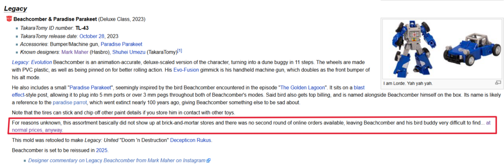 Something I’ve talked about a few times over the years in my reviews is how I’ve tried to avoid the trap of constantly re-buying Transformers characters I already have, because they’ve done a new version that’s incrementally better. Case and point, most of the Generation 1 Minibots got a solid series of updates in the mid-2010s, as Legends-scale minifigures released during the Prime Wars Trilogy. But over the last few years, HasTak decided to do updates of the Minibots all over again, as Deluxes, with a little more articulation, a little more budget, actual accessories, things like that. And to be fair, a lot of them have been really good, like Gears, Cosmos, Netflix Bumblebee, and so forth. But there’s also been ones like Studio Series 86 Brawn, where I’ve found myself going “this sure exists to check a box off.” Either way, chasing the dragon of perpetual updates has been something I’ve started to actively avoid. So, why’d I get a new Beachcomber?