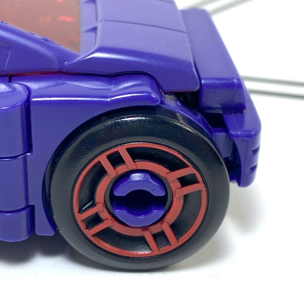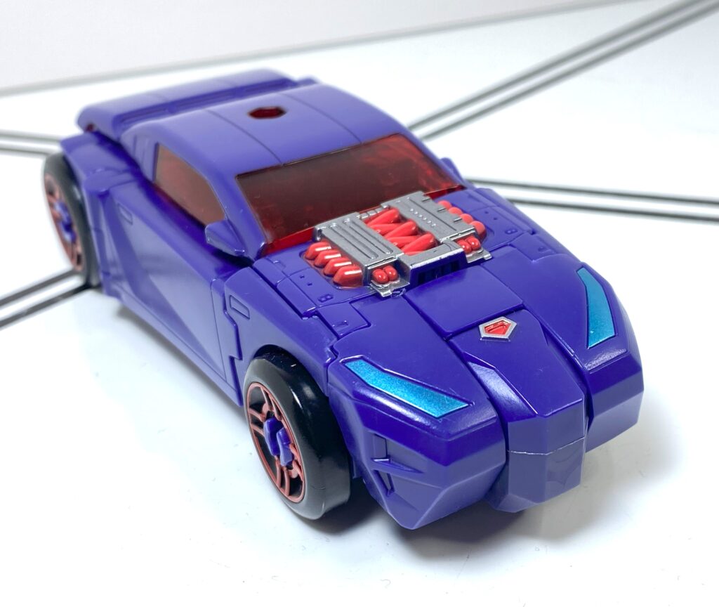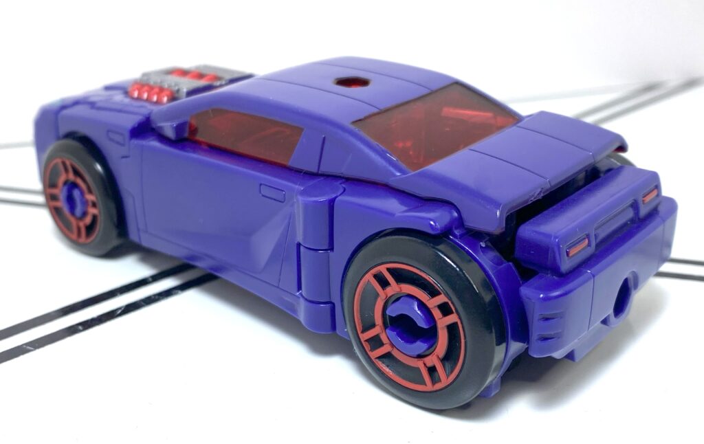 The sculpt’s pretty ambiguous about whether this is an Earth Car, or a Future Car, but the colors definitely scream Future Car, what with the deep purple, red windows, and silver and red accents. She’s also got blue headlights, and painted red taillights. It’s the wheels that look the most futuristic, though, colored black, with red techie-looking highlights partially covering the hubcaps.