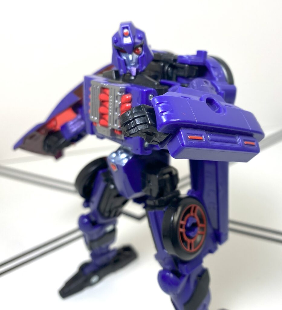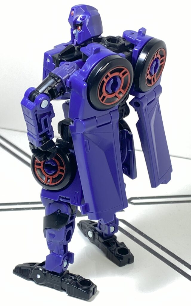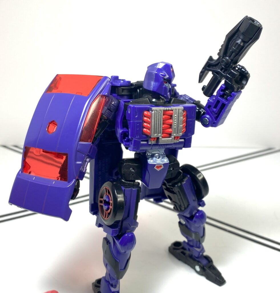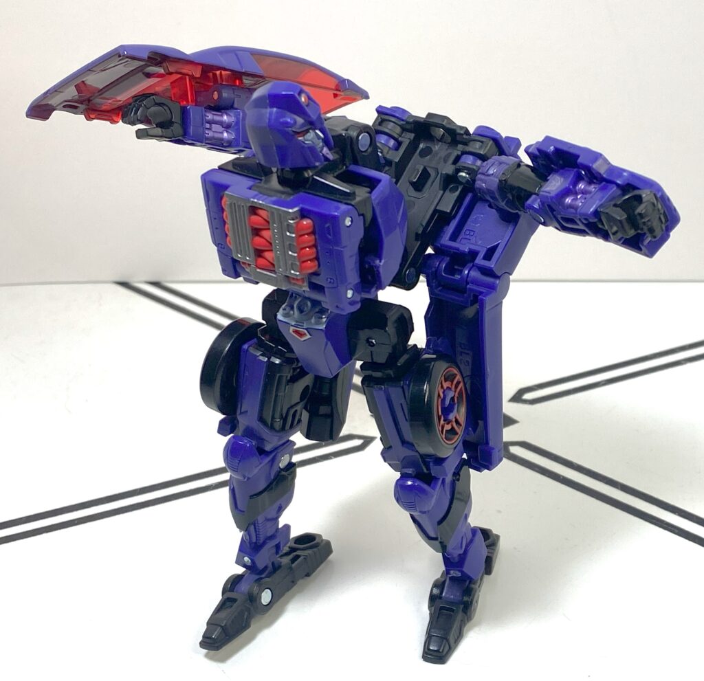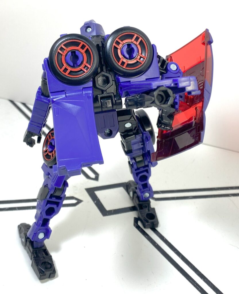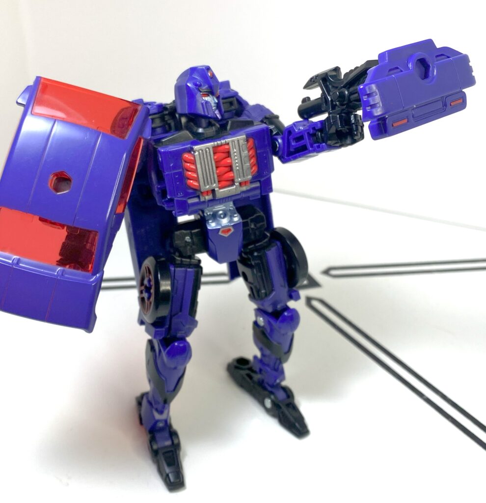 I’d heard this was a sore spot many people had about this figure, that it was an unreasonably difficult transformation. In person, it’s…somewhere in the middle? It’s a weird one for a carformer, that’s for sure, beginning by hyper-extending her spine and backpack really high up, and then folding all of her limbs inwards to build a car around that long strut.