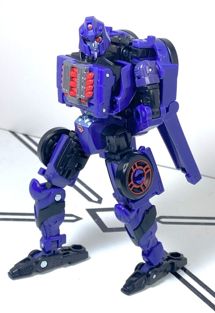 Shadow Striker’s colors are another area where they went purely with her Cyberverse appearance, in that she’s almost entirely a deep, Decepticon-looking purple, with black as her secondary color. For accents, she has bits of silver (including a faction symbol on her left arm) and red that really works with that purple. In particular, I like how the engine block on her chest is just done in shiny paint, instead of chromed like on the original. It’s a good-looking set of shades.