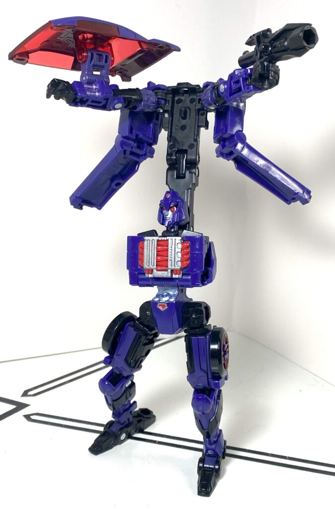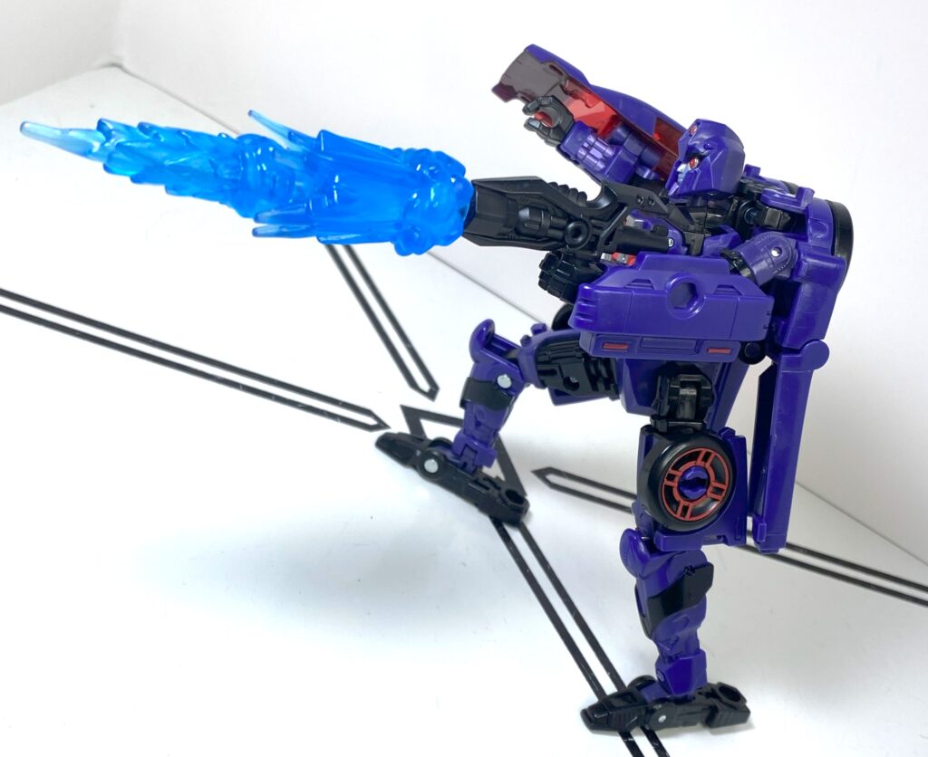 For accessories and features, there’s a lot going on here, and not all of it works. Let’s start with her riot shield. It usually stays plugged into her right arm, on a 5-millimeter port, since it was permanently stuck there on the original Side Burn tooling. It’s cast in clear red, painted purple, and adds a lot of mass to her.