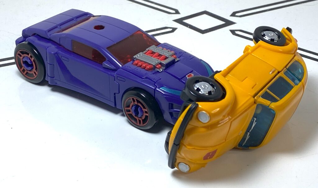 In terms of build quality, presuming you got everything pegged in during transformation, the car stays together pretty well. I feel like there’s a bit of a gap between the back of the roof and the rear doors, though, that I always squeeze down a bit. And, as mentioned above, the rear bumper sticks out a little bit, but it’s a symmetrical kind of sticking out, so it’s less noticeable than you’d think.