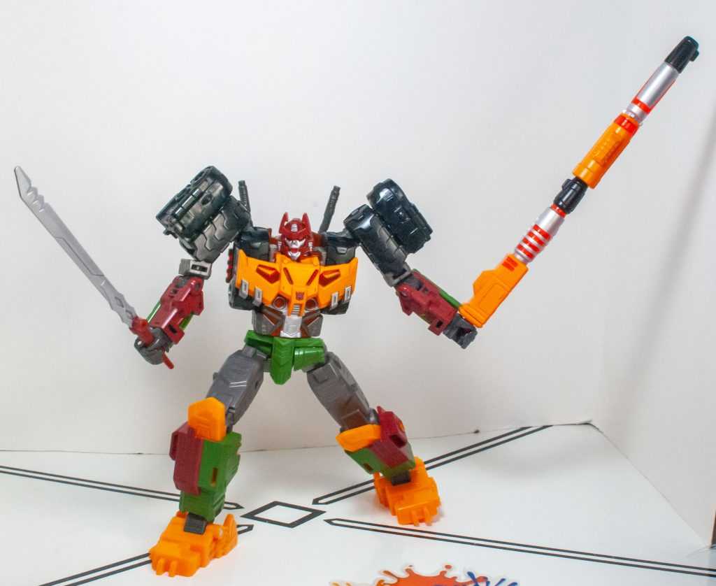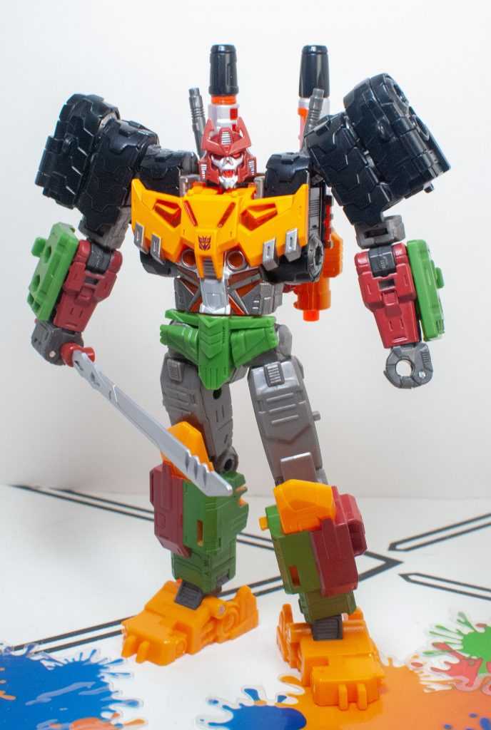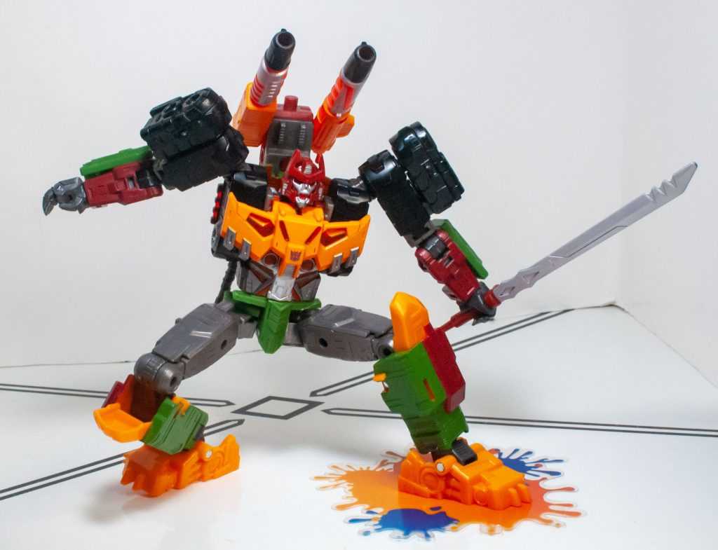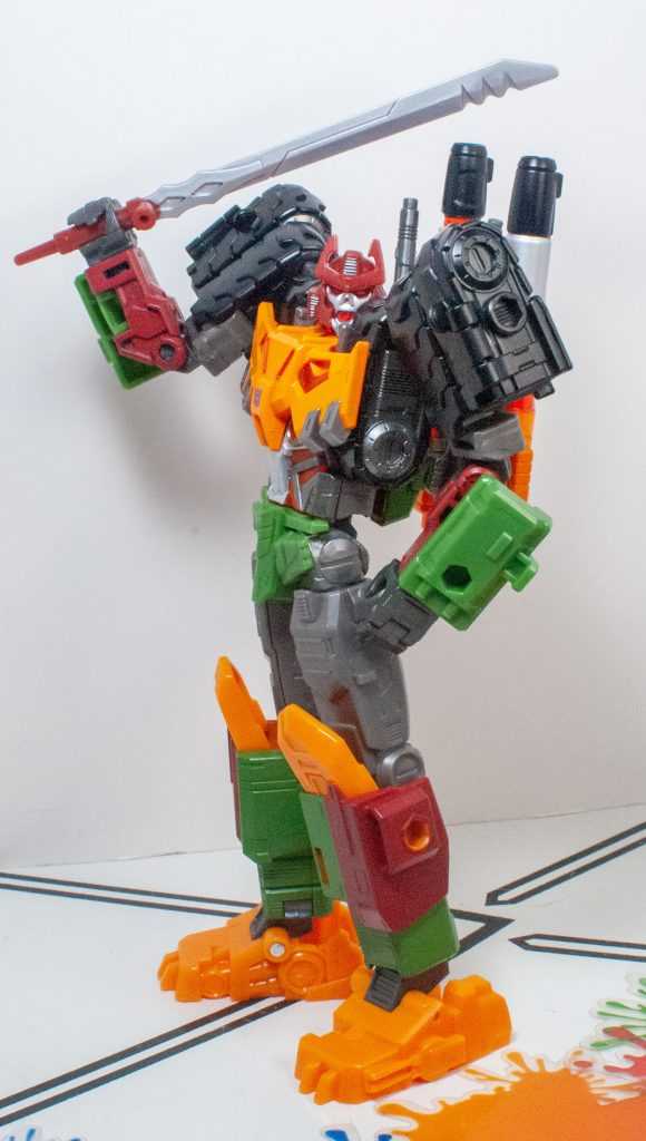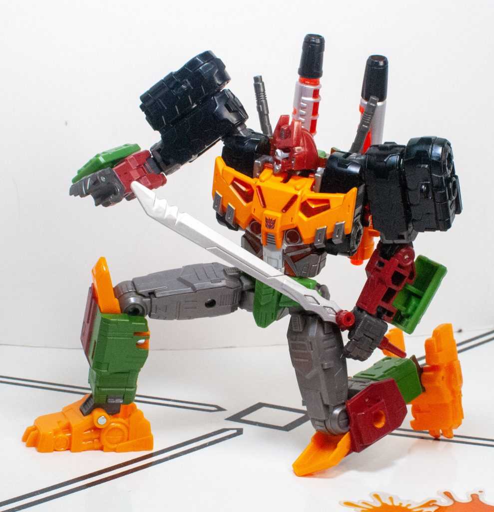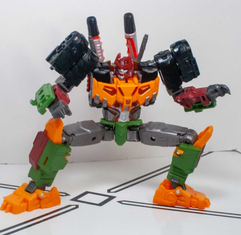 For colors, Bludgeon got a lot on him. He’s a pretty evenly-balanced mixture of orange-yellow, forest green, brown, gray, and black, with tiny hits of silver, red, purple (his badge), and transparent orange. It’s a color scheme that owes more to his 2009 Revenge of the Fallen figure than his G1 toy, which had a lot more purple on it.