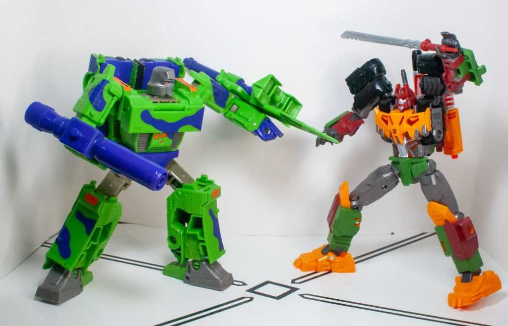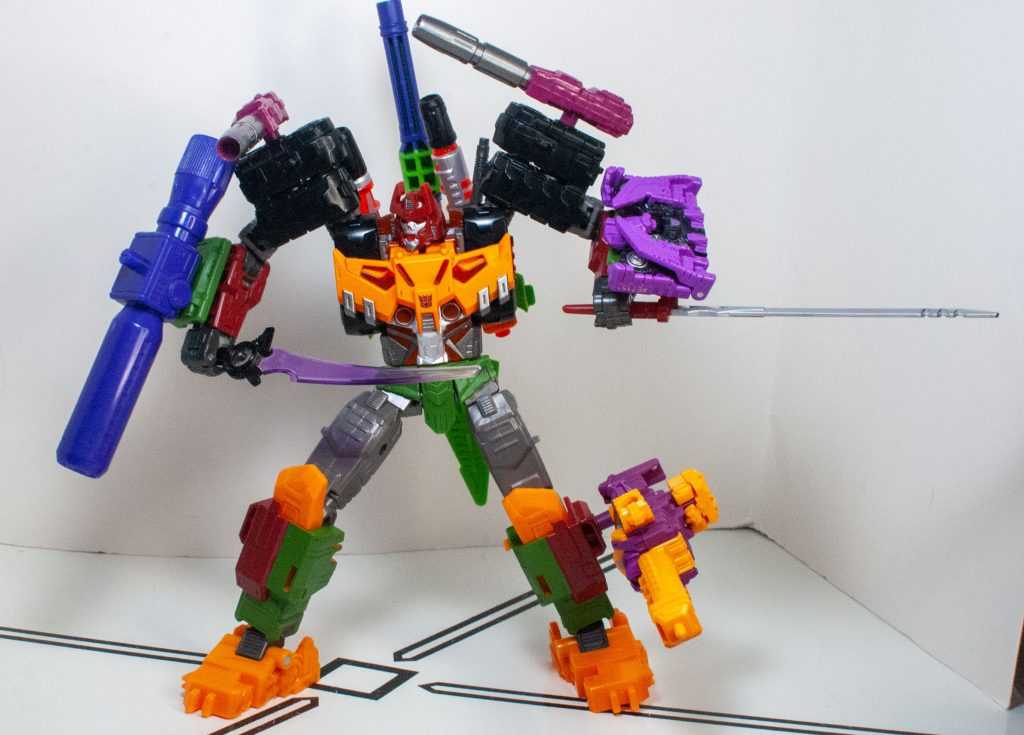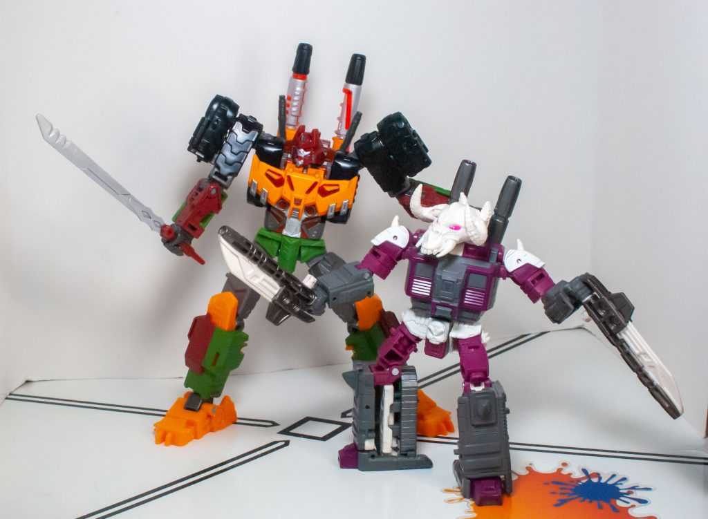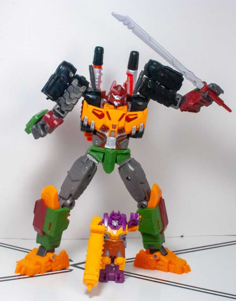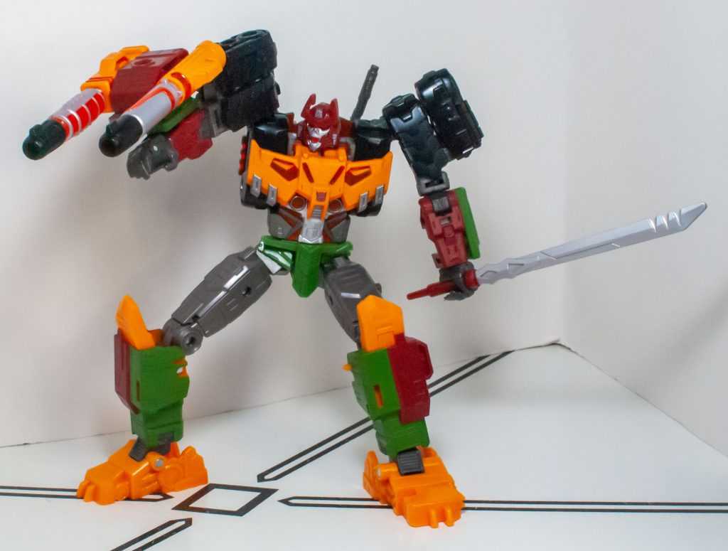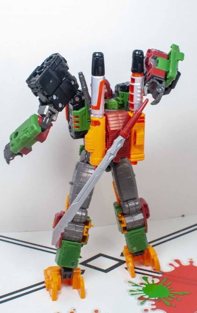 For colors, Bludgeon got a lot on him. He’s a pretty evenly-balanced mixture of orange-yellow, forest green, brown, gray, and black, with tiny hits of silver, red, purple (his badge), and transparent orange. It’s a color scheme that owes more to his 2009 Revenge of the Fallen figure than his G1 toy, which had a lot more purple on it.