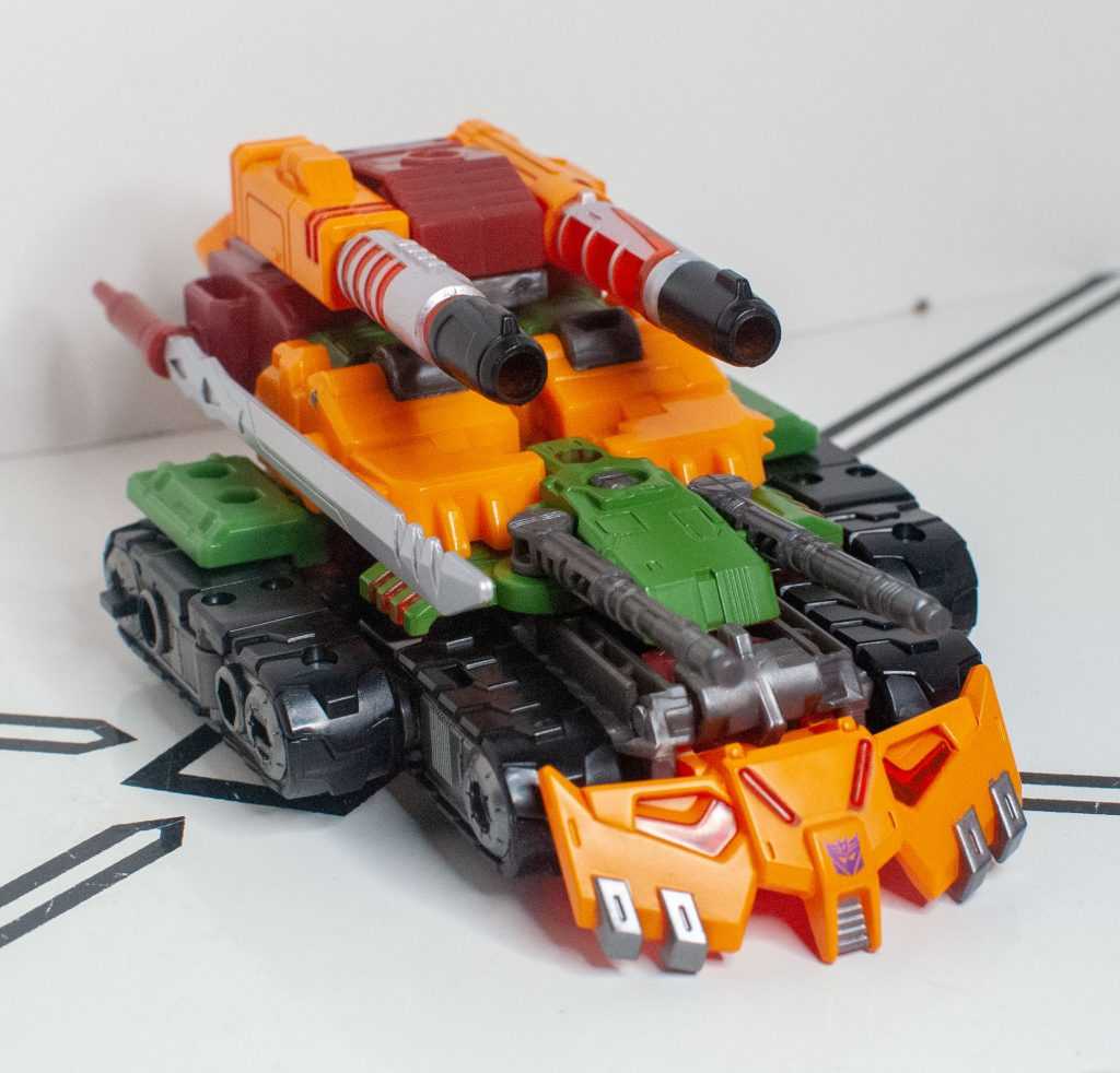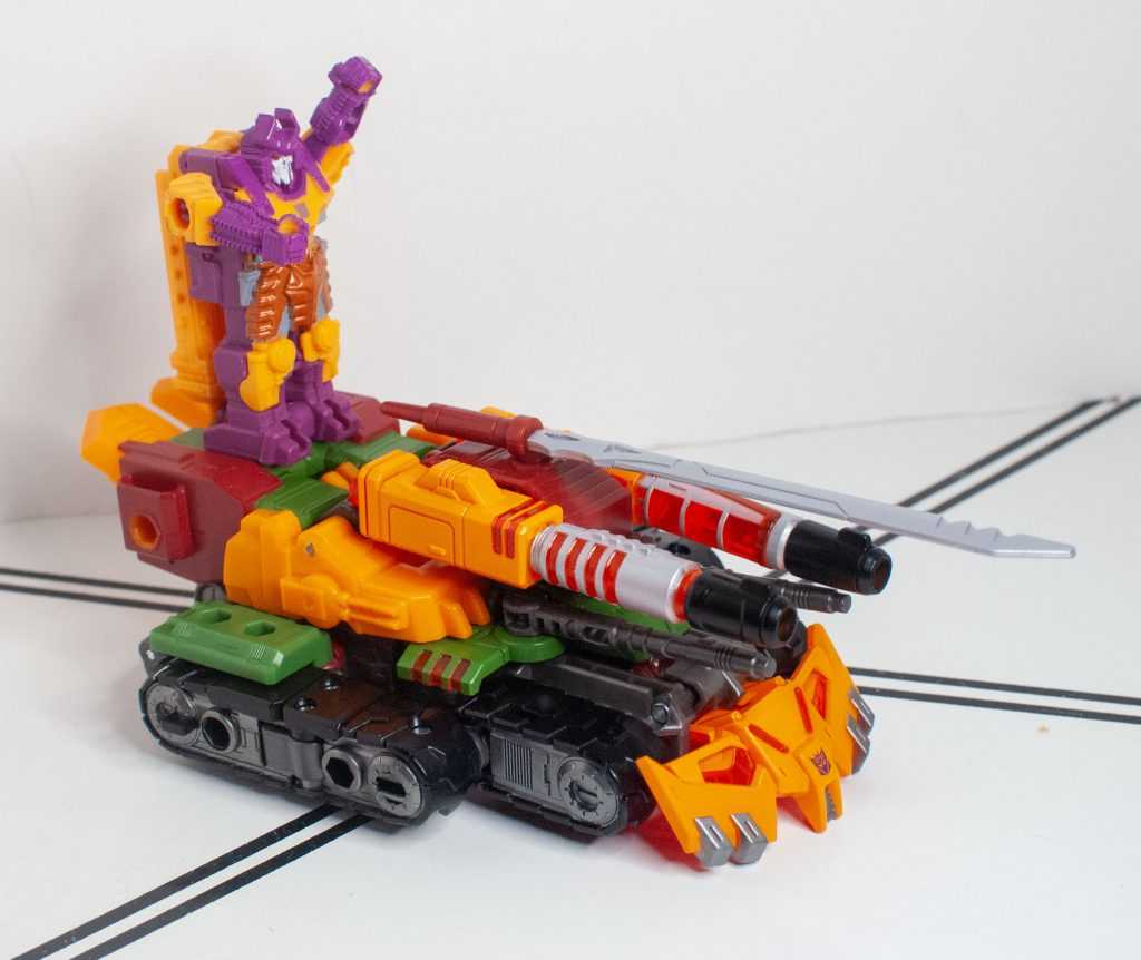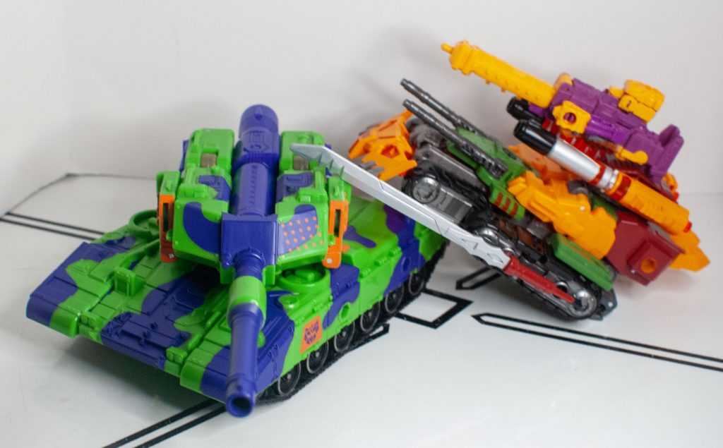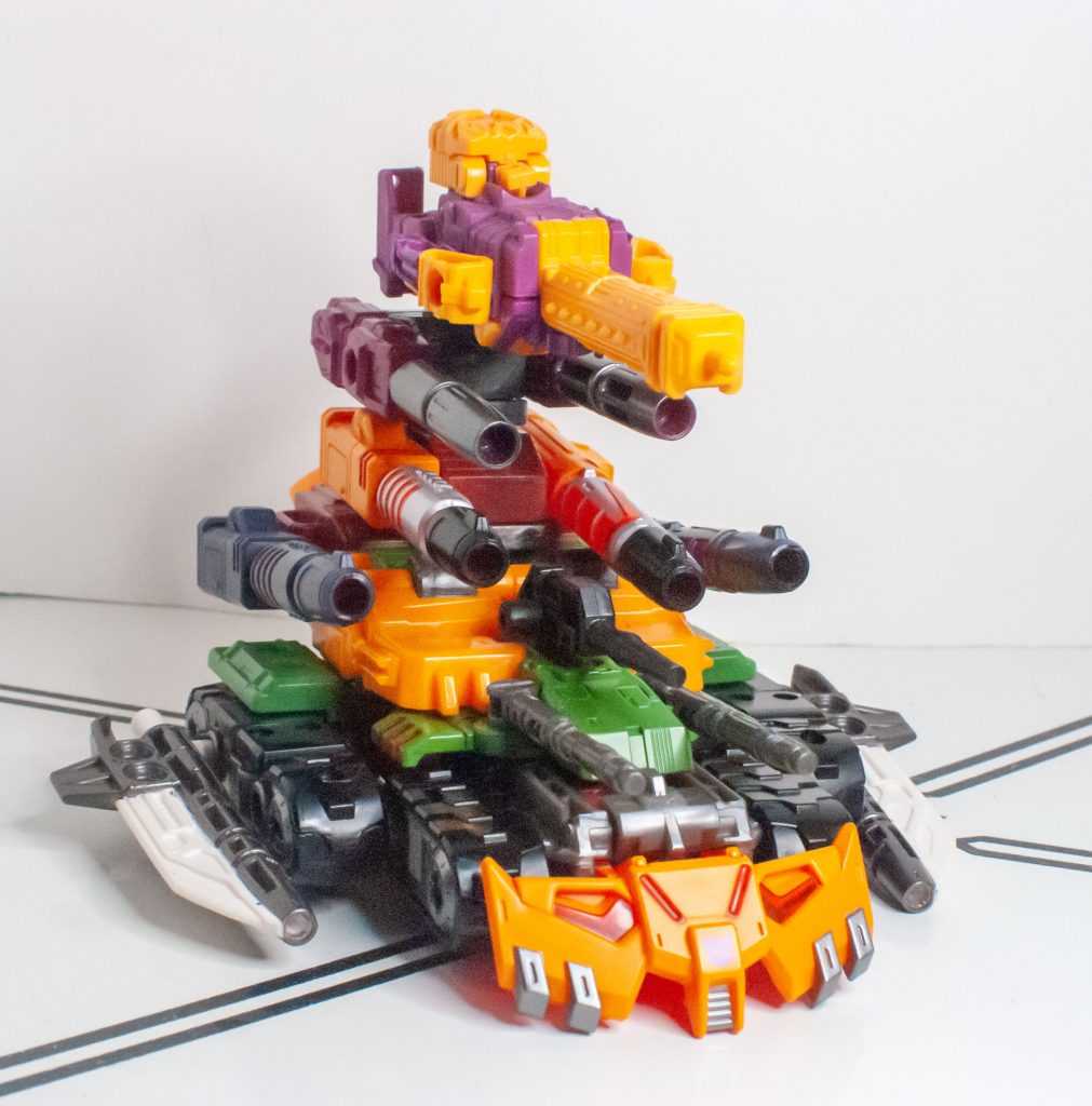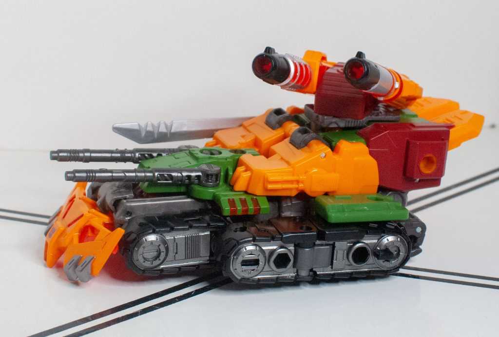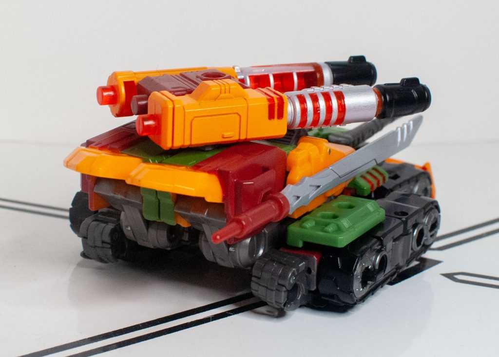 Again, Alex Milne gave him a really distinct, unique tank mode, with four guns, double treads, a big cowcatcher-type thing upfront, and that’s all replicated here, just in funky colors.