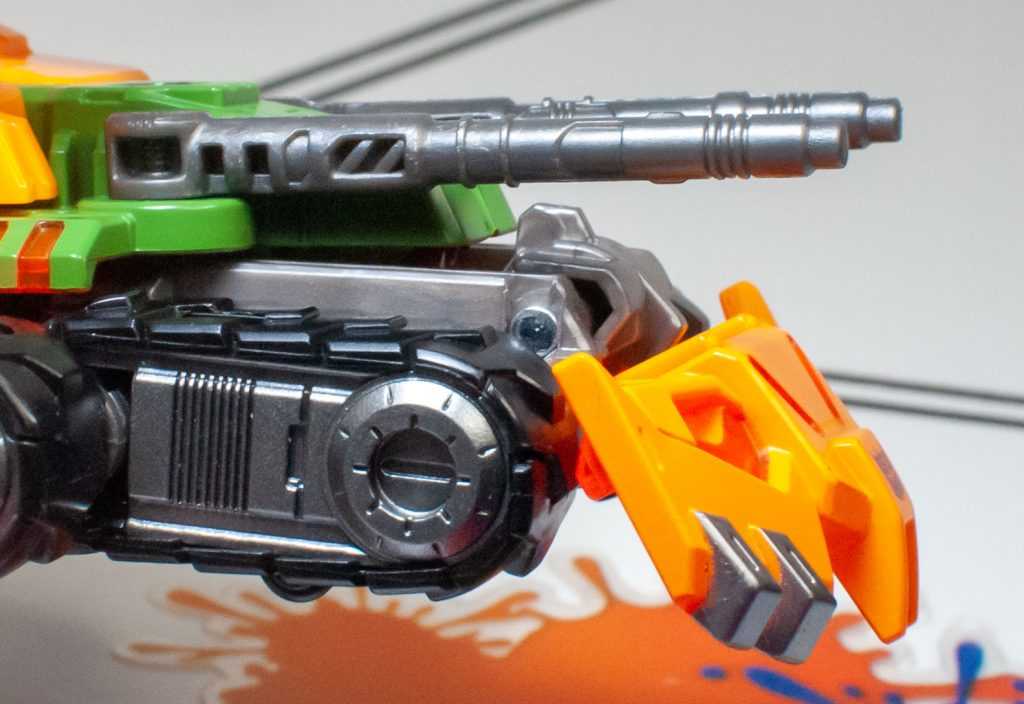 His double-barrelled tank turret can rotate pretty well (that loose panel partially justifying its looseness in this case), and the barrels can raise or lower, while the smaller, antenna-like front barrels can rotate in and out.