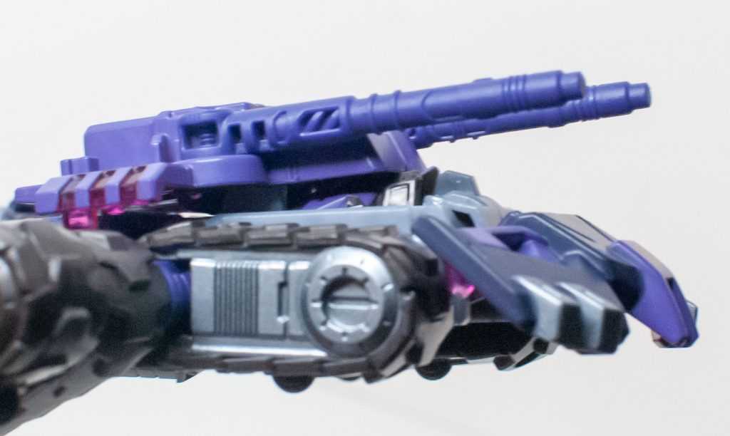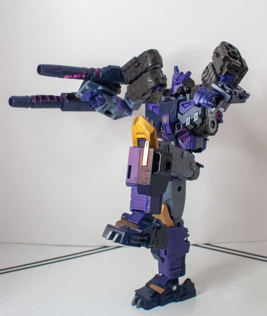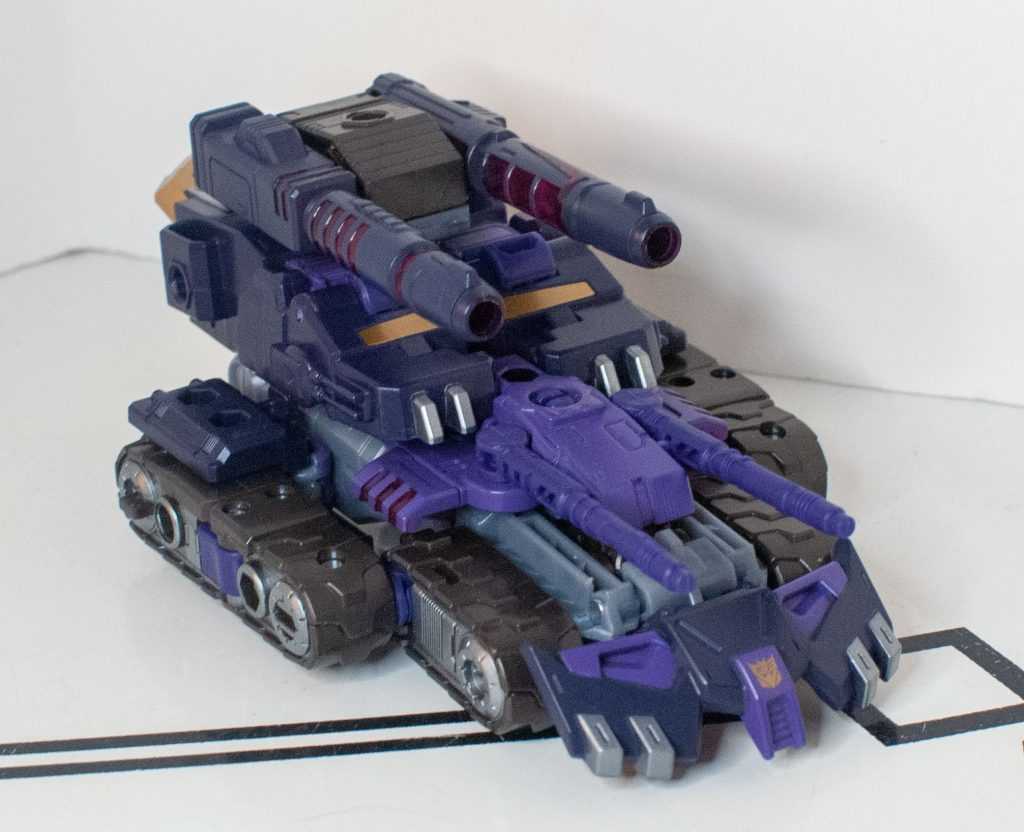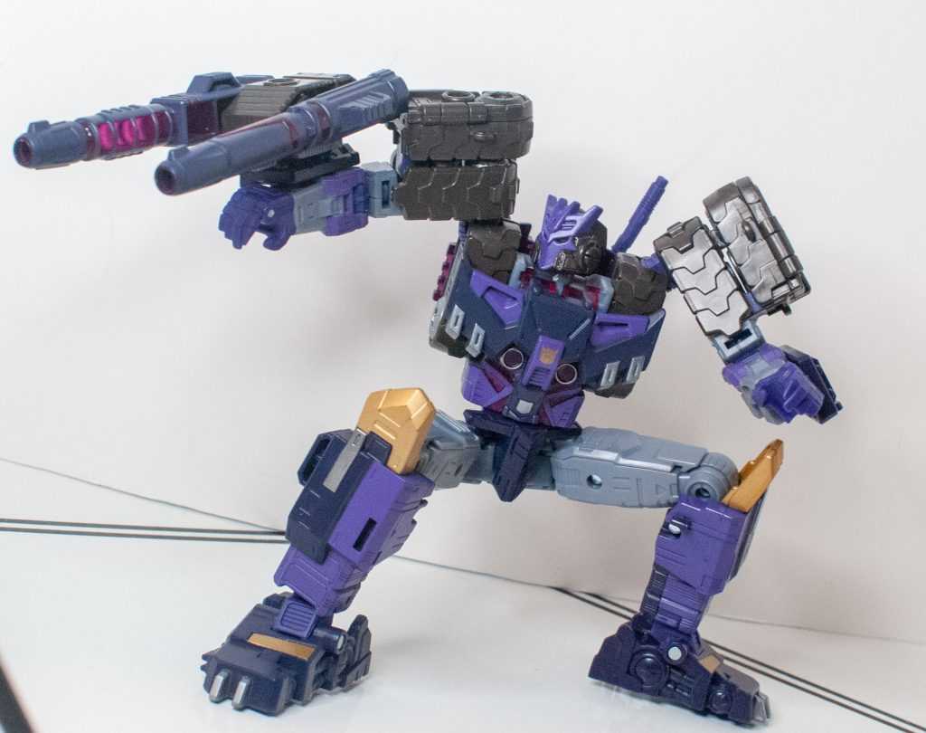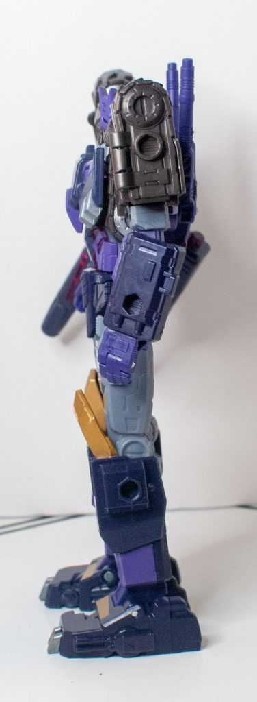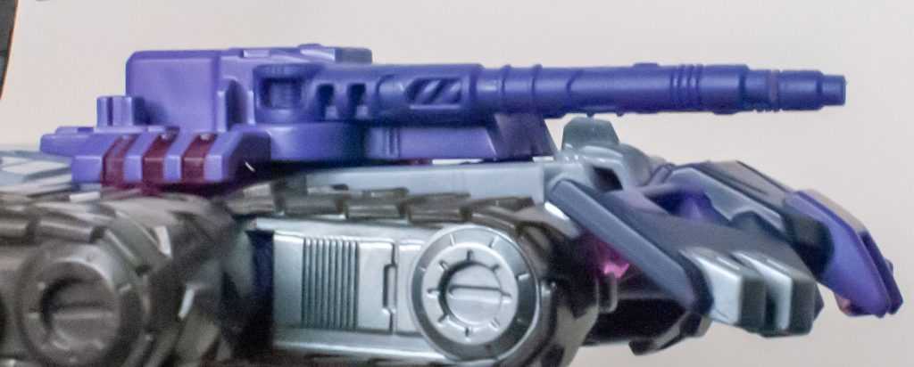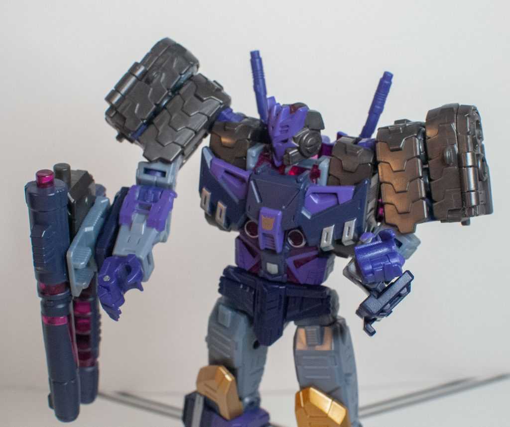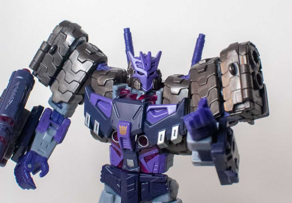 So, this is a really nice set of colors. He’s a bunch of different (mostly darker)t shades of purple (across his body) and gray (his limbs, and a very dark shade for his tank treads). It’s the accent colors that really pop, with bits of metallic gold (including a surprisingly restrained center-chest Decepticon logo) and silver that contrast well with the previous. And I already mentioned the tasteful bits of translucent purple. It’s extremely Decepticon. Like his sculpt, the colors match his comic look very well, maybe minus a few dashes here and there on his extremities.