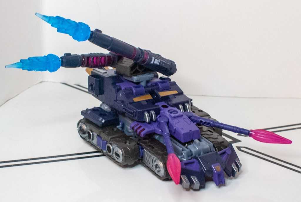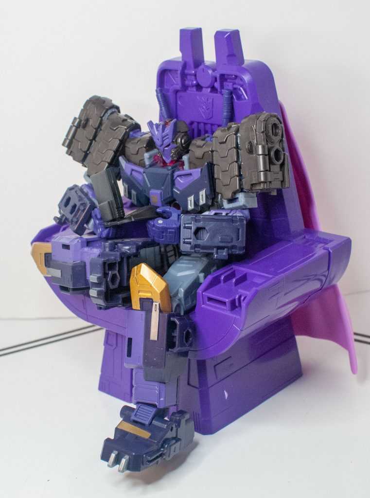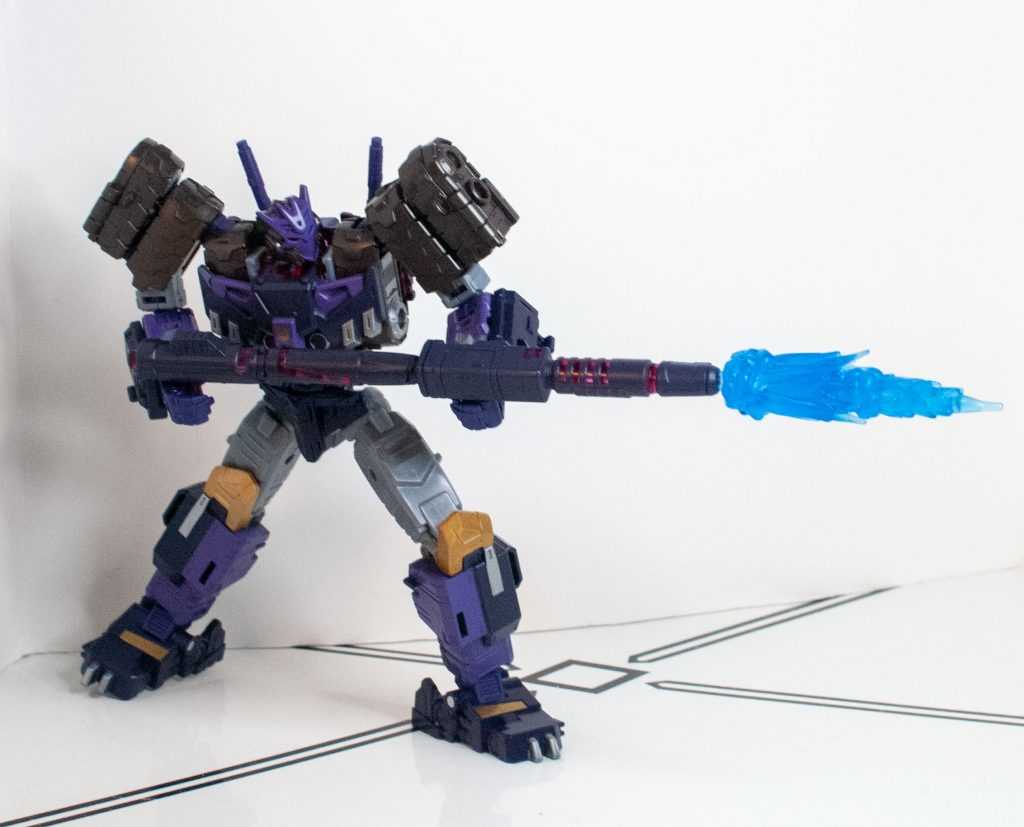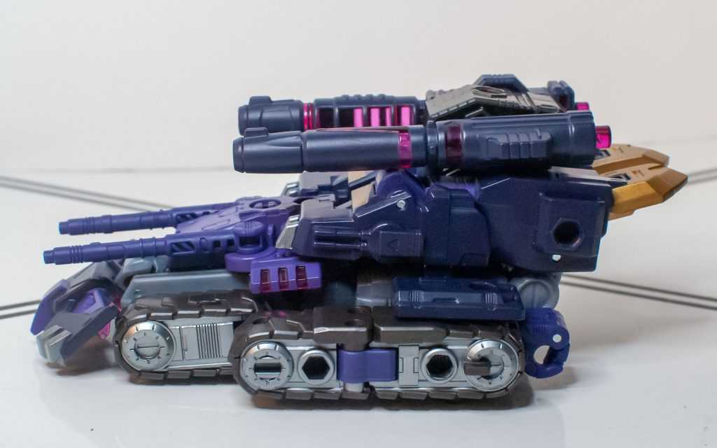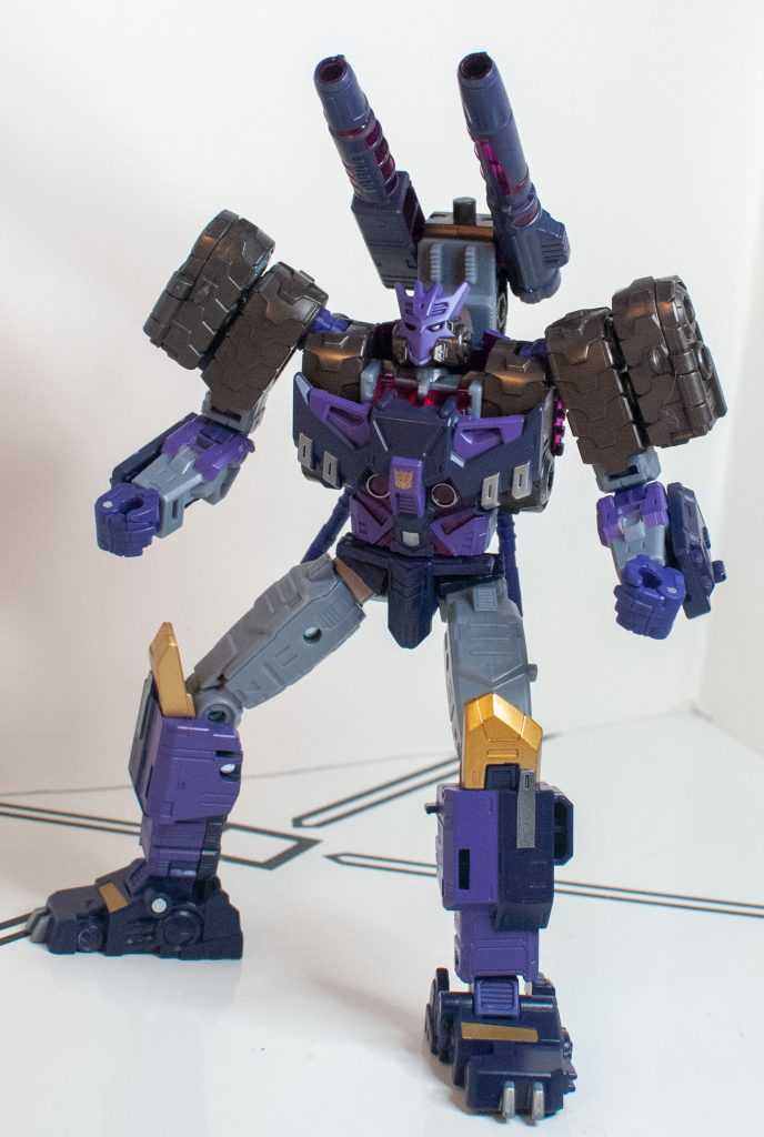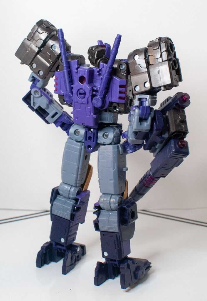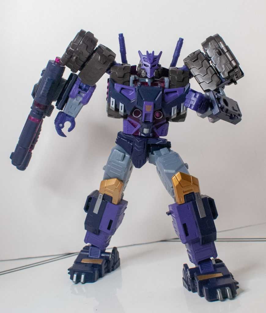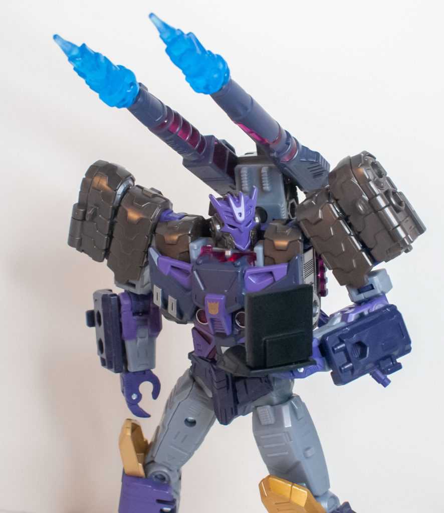 So, this is a really nice set of colors. He’s a bunch of different (mostly darker)t shades of purple (across his body) and gray (his limbs, and a very dark shade for his tank treads). It’s the accent colors that really pop, with bits of metallic gold (including a surprisingly restrained center-chest Decepticon logo) and silver that contrast well with the previous. And I already mentioned the tasteful bits of translucent purple. It’s extremely Decepticon. Like his sculpt, the colors match his comic look very well, maybe minus a few dashes here and there on his extremities.