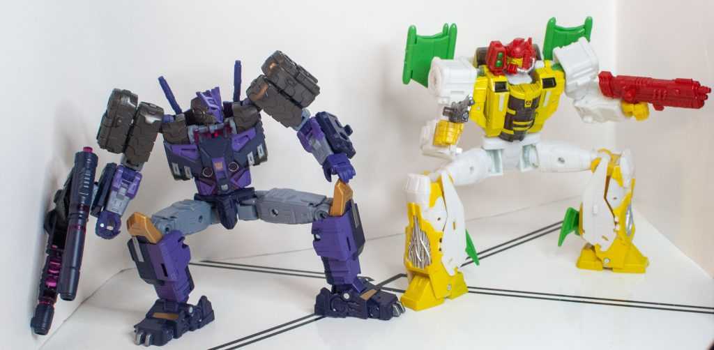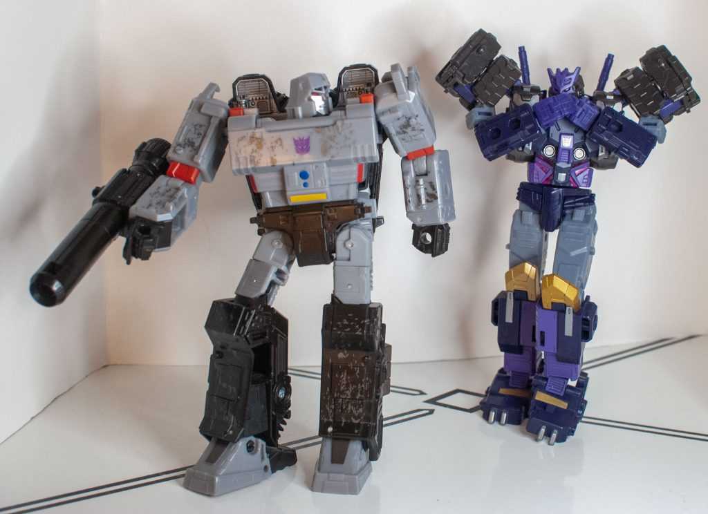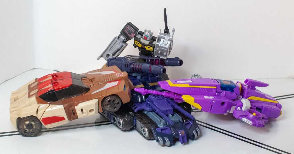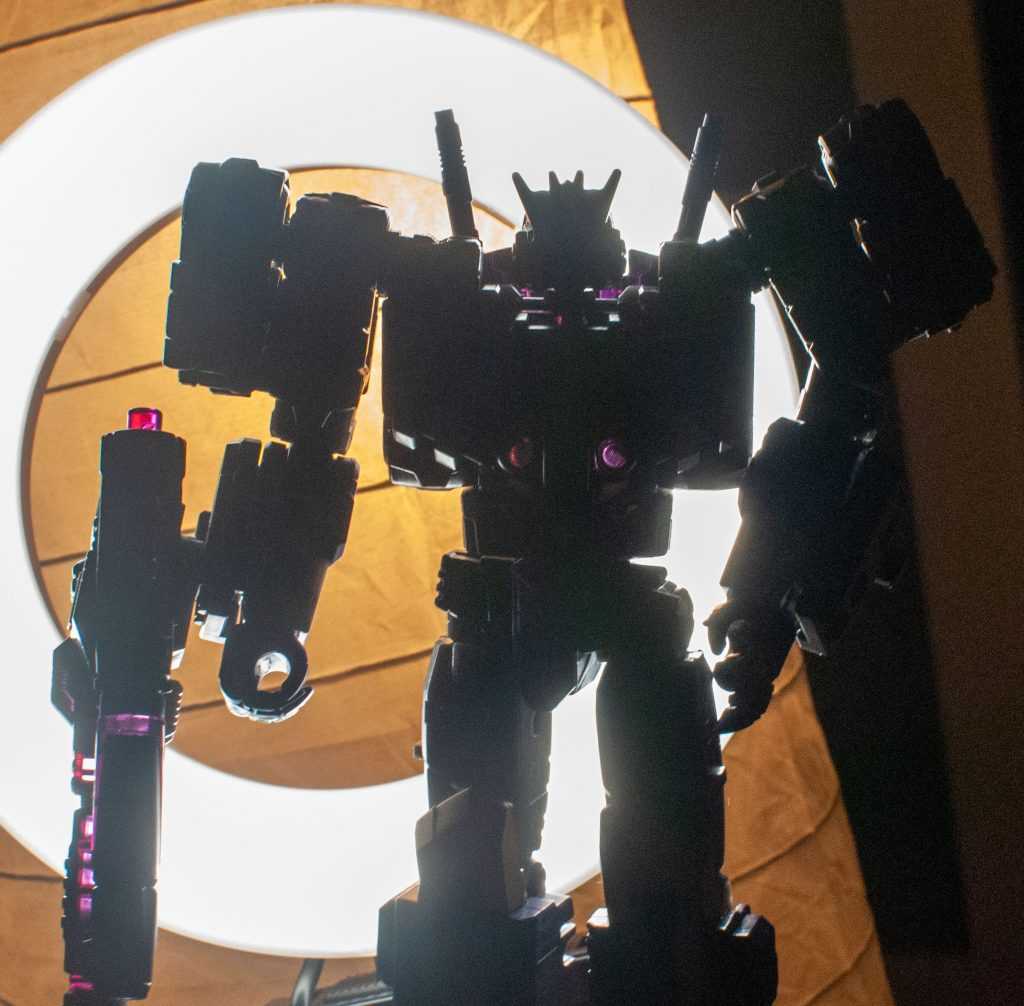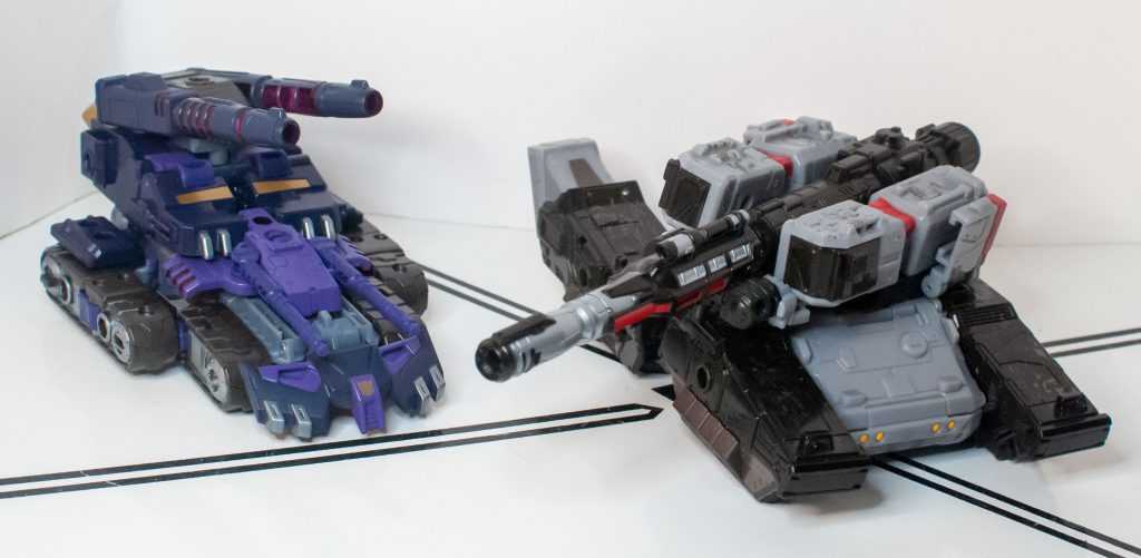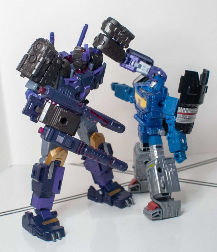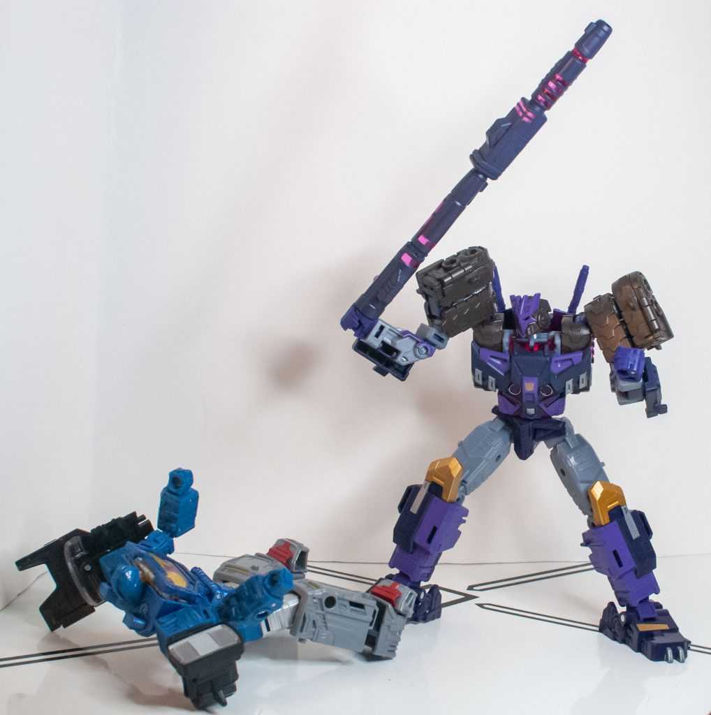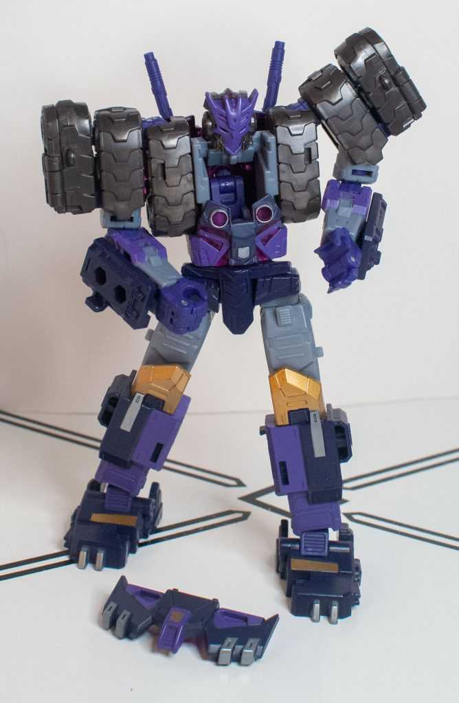 So, this is a really nice set of colors. He’s a bunch of different (mostly darker)t shades of purple (across his body) and gray (his limbs, and a very dark shade for his tank treads). It’s the accent colors that really pop, with bits of metallic gold (including a surprisingly restrained center-chest Decepticon logo) and silver that contrast well with the previous. And I already mentioned the tasteful bits of translucent purple. It’s extremely Decepticon. Like his sculpt, the colors match his comic look very well, maybe minus a few dashes here and there on his extremities.