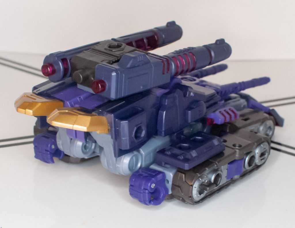 While it’s still very much a Random Pile of Parts with guns and treads strapped on, like a lot of Cybertron modes, there’s enough going on here to make this tank Look Like Something, especially the way his chestplate goes in the front, like a battering ram.