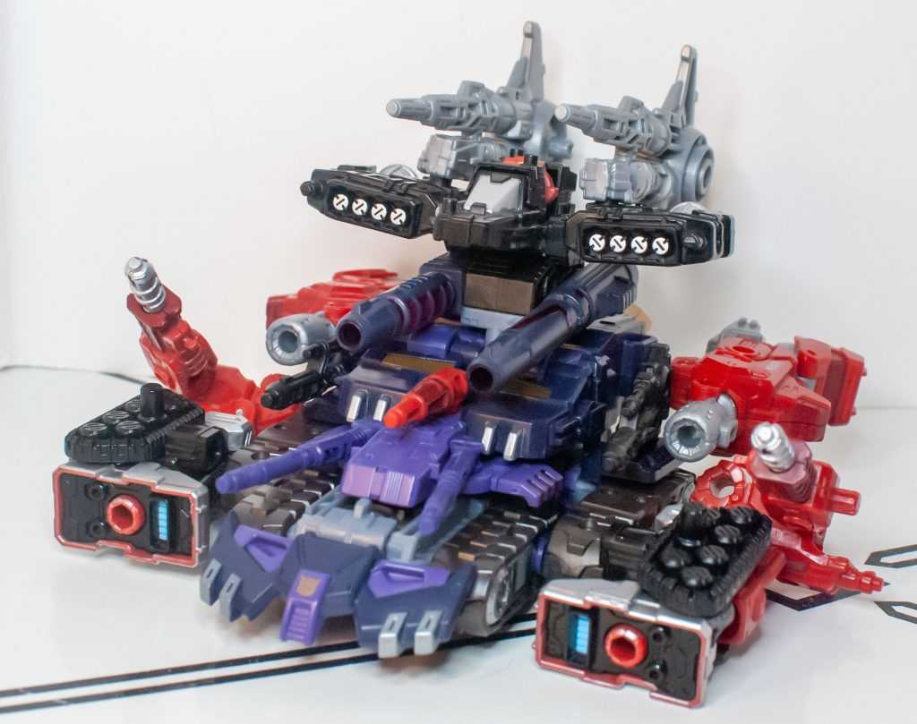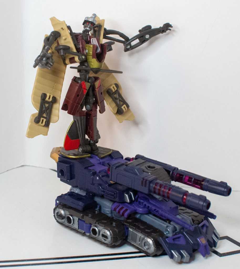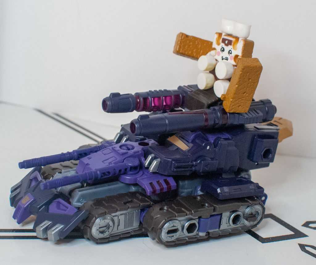 Presuming you rotated his head around before hiding it away, everything in this tank mode, even the janky chestplate, actually does hold together pretty well (and if you didn’t rotate the head, the front will be a bit gappy.) It feels like the double-tank-treads don’t easily align straight with the ground, though, and I find myself adjusting them every time I pick this vehicle up.