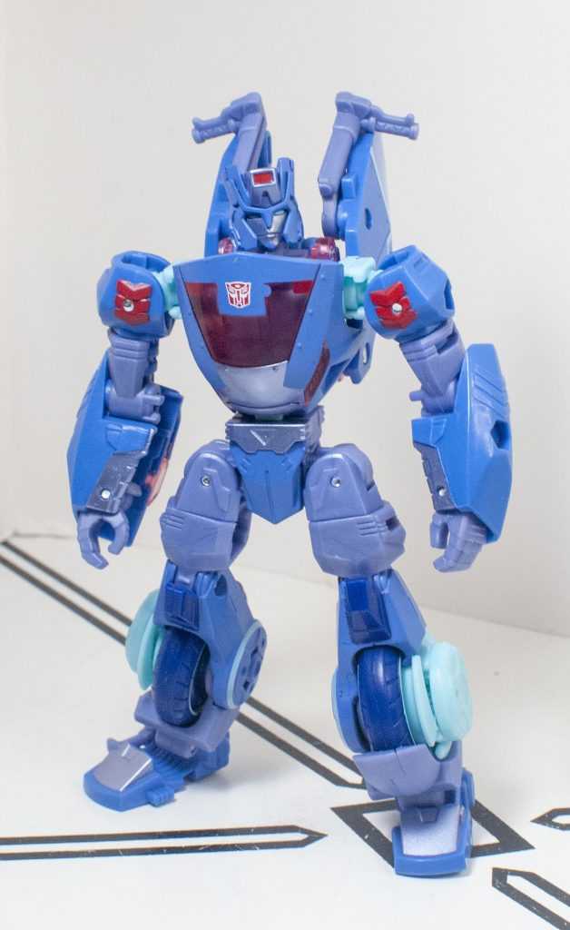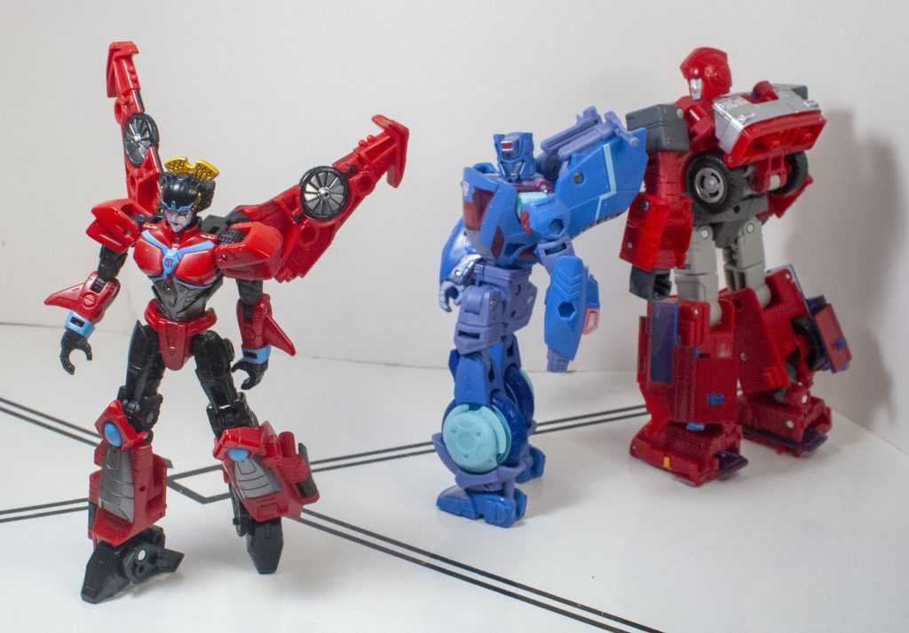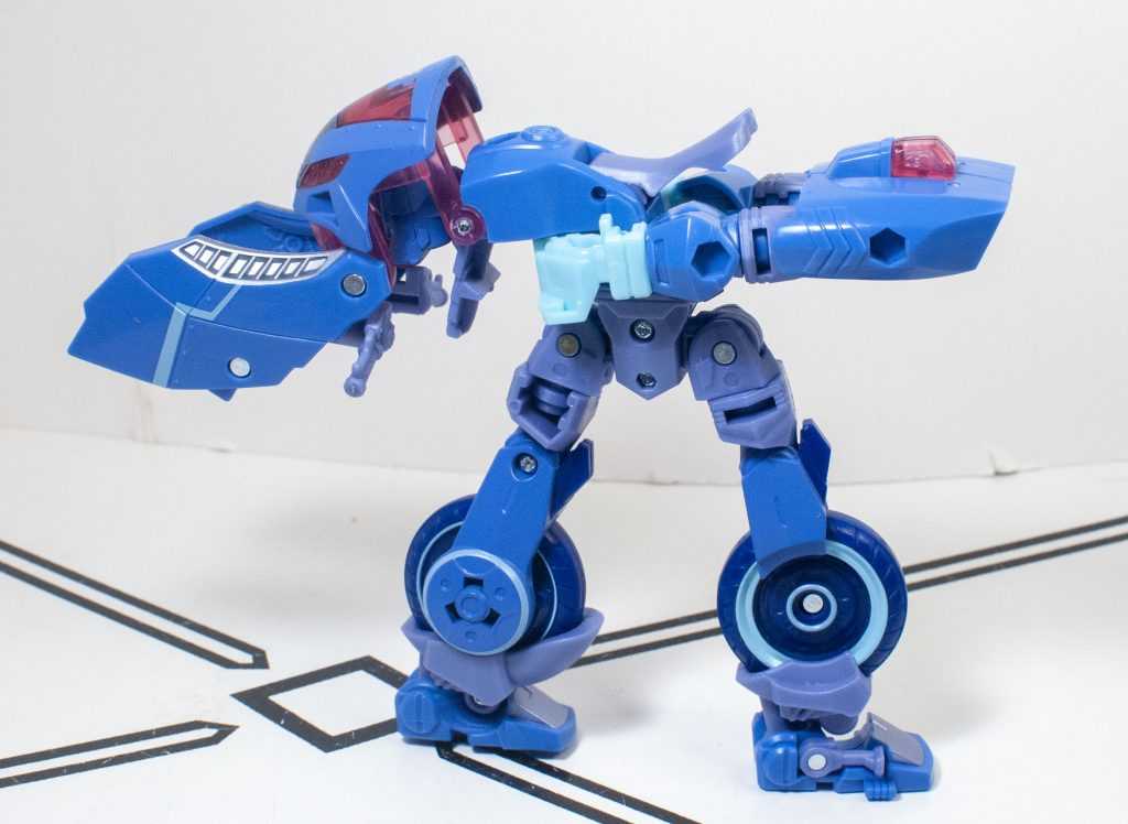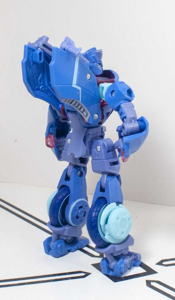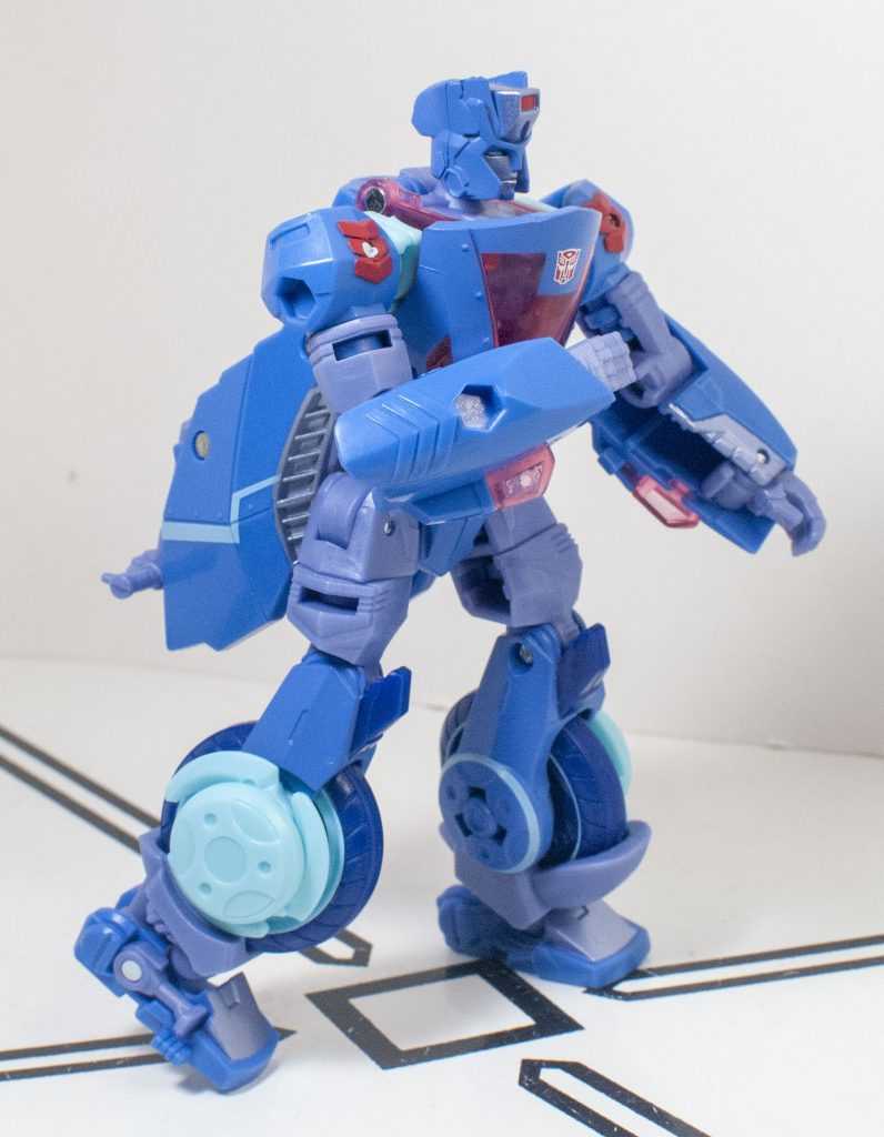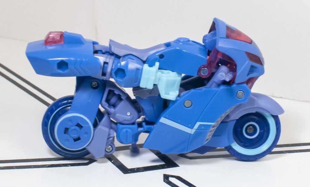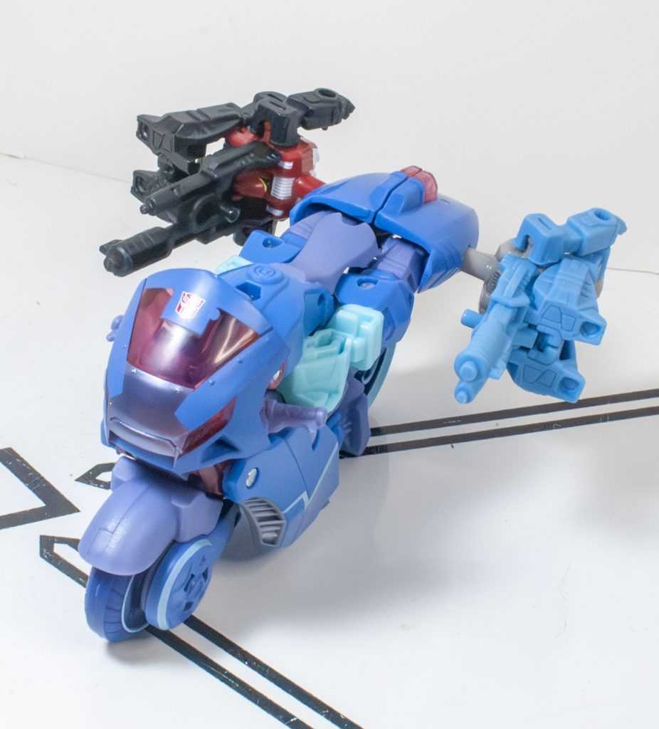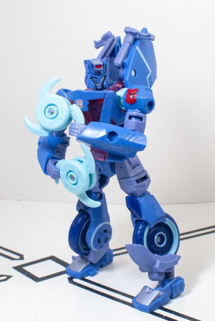 One thing I like about the design is the way her wheels form part of her lower legs, it makes her look more “high-tech” than a standard Transformer, if that makes sense. Also, in this era of figures having all kinds of odd scales and heights, I appreciate that she’s just a standard, no-frills Deluxe-sized gal, pretty much of standard height, back-fins aside.