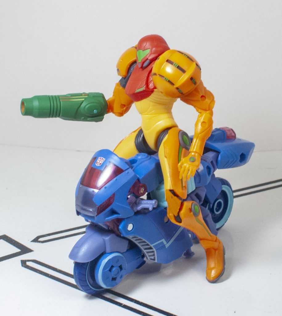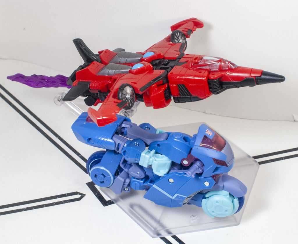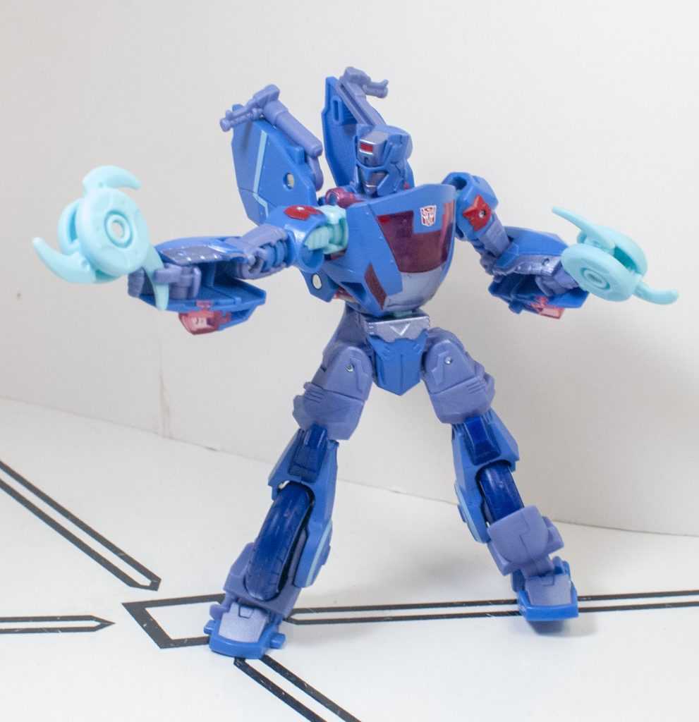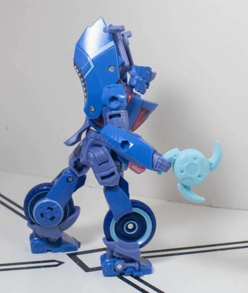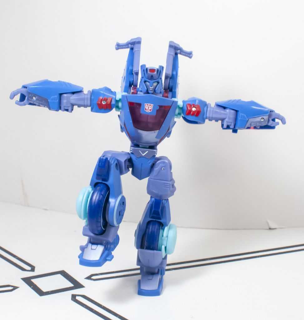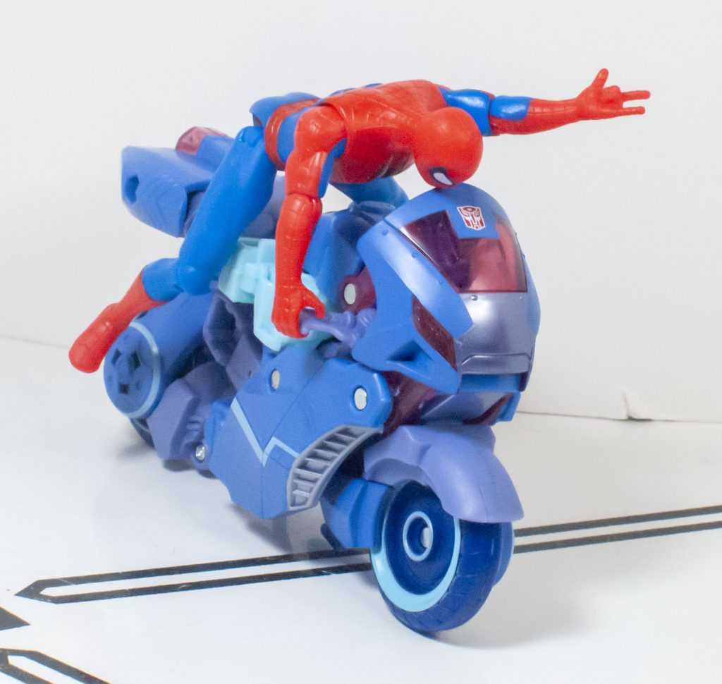 One thing I like about the design is the way her wheels form part of her lower legs, it makes her look more “high-tech” than a standard Transformer, if that makes sense. Also, in this era of figures having all kinds of odd scales and heights, I appreciate that she’s just a standard, no-frills Deluxe-sized gal, pretty much of standard height, back-fins aside.