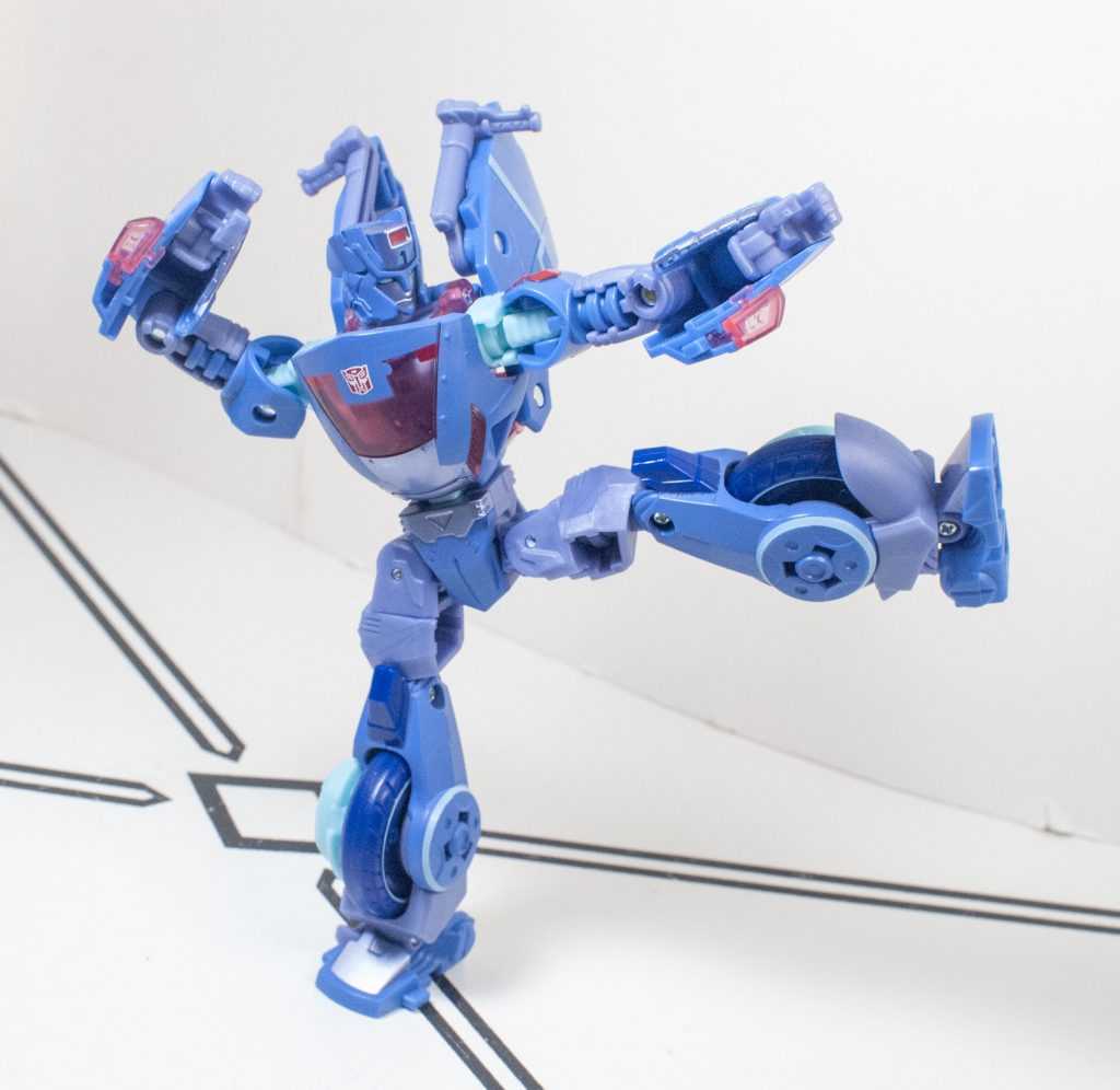 For build quality, everything holds together solidly, with the big exception of her accessories, which I’ll get to further down. But the core body itself is fine, and she stands really well, which is critical when she’s got oversized wheel-shins like that. Her articulation is also really good, and this is where you can really spot that she began life as Animated Prowl, the Cyber-Ninja.